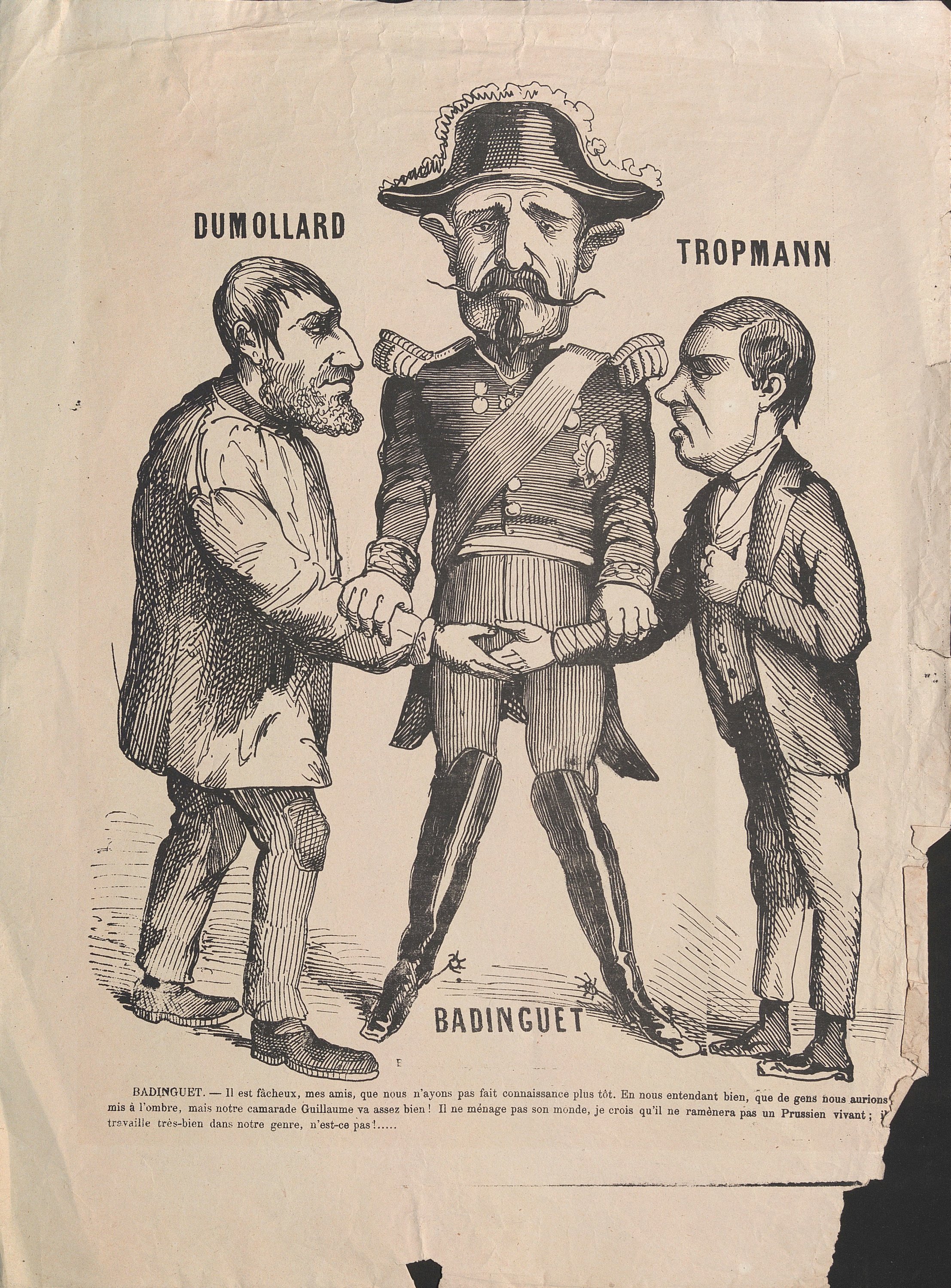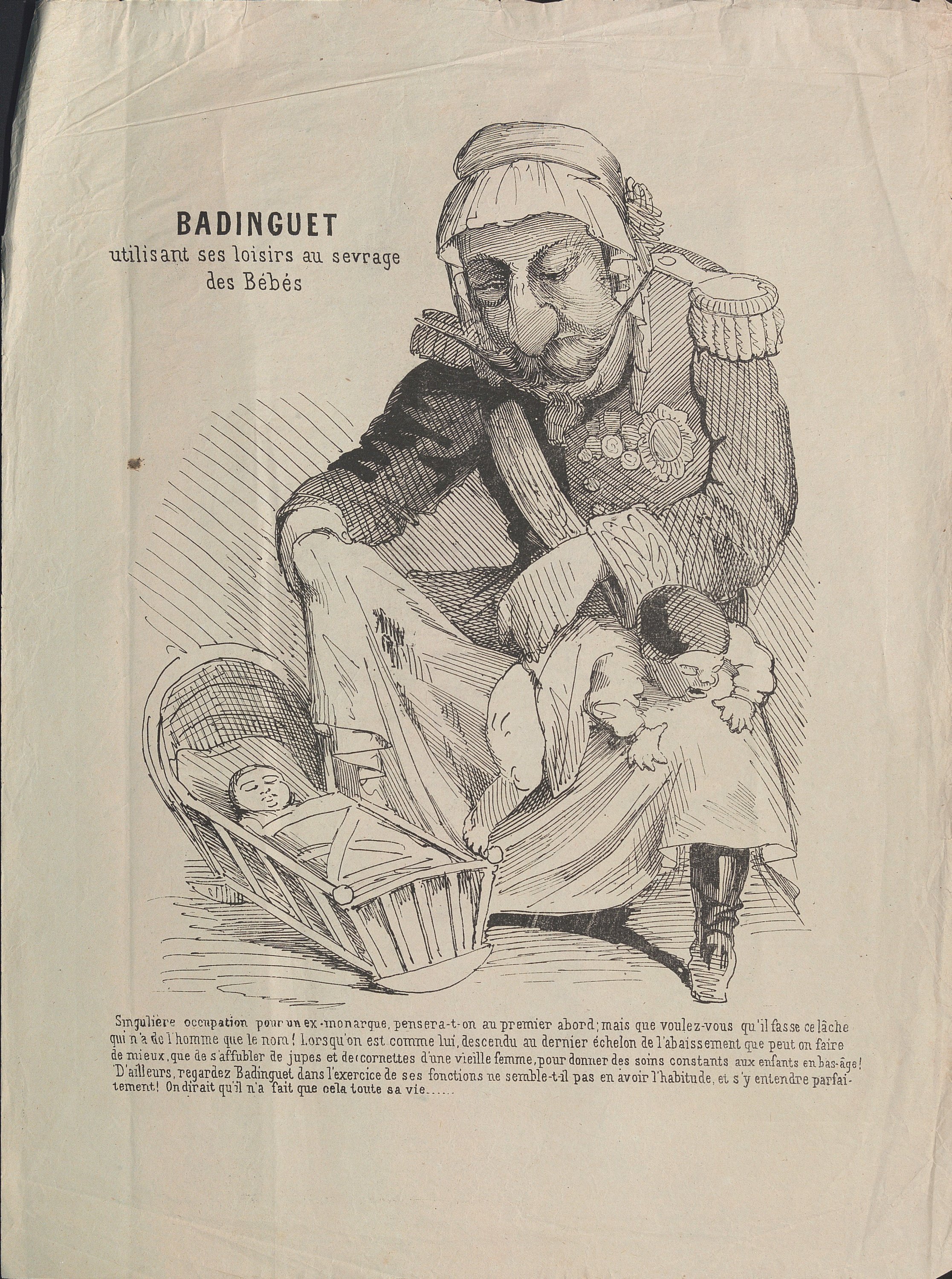 Anonymes, 6 feuilles volantes, rarissime : n°3 Actualités Le gâteau aux prunes et le kaiser Guillaume, 38,5 x 28 cm (petites déchirures en marge) ; Les figurants illustrés, 31,5 x 24,5 cm ; Le restaurateur de la France, 43 x 27,5 (petites déchirures et plis en marge) ; Dumollard, Badinguet, Tropmann, 40 x 29 cm (déchirures et mques en marge) ; Badinguet utilisant ses loisirs au sevrage des bébés, 40 x 30 cm (plis) ; Le jeune Badinguet s’en allant en guerre, 40 x 30 cm (plis).