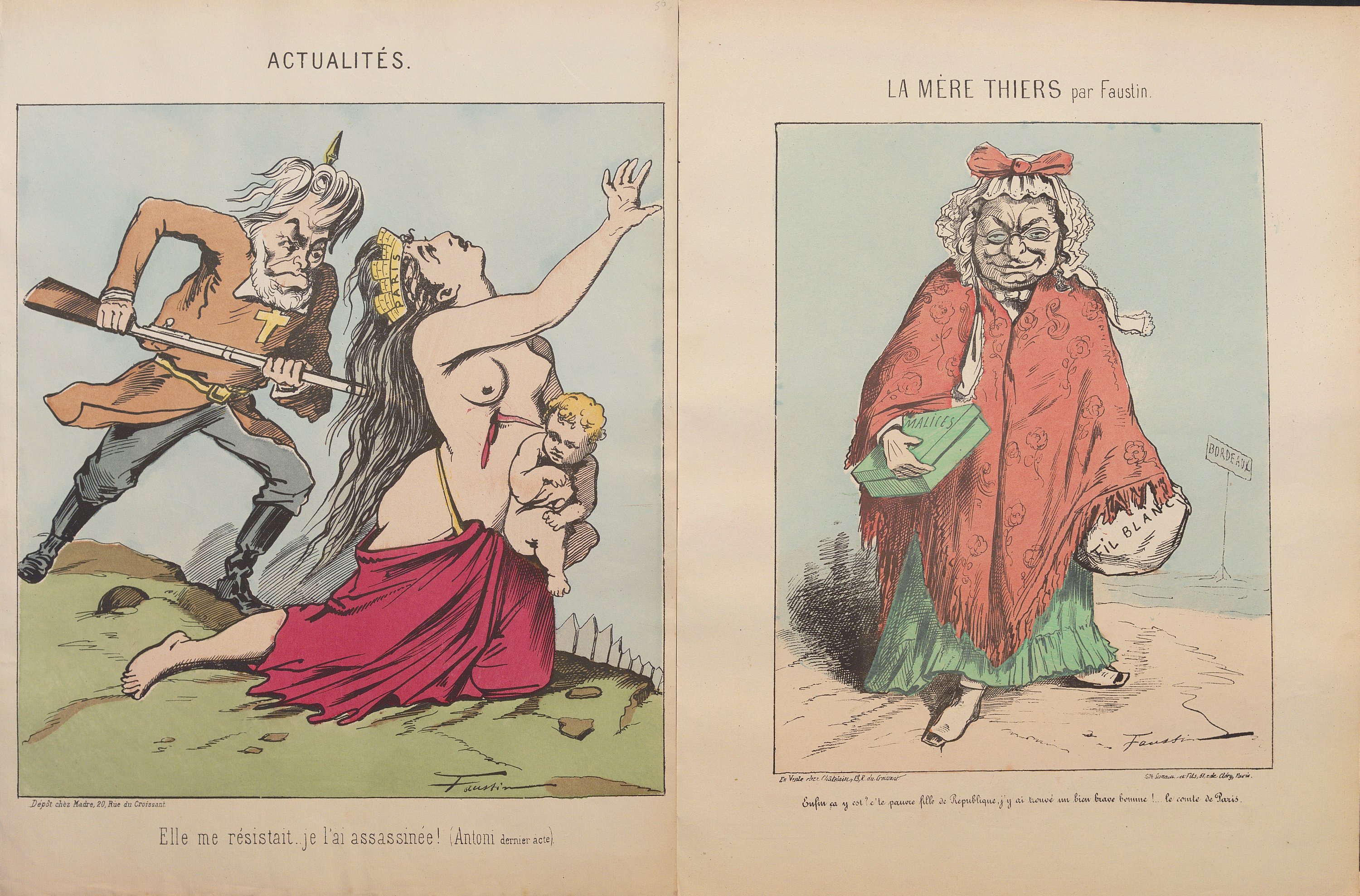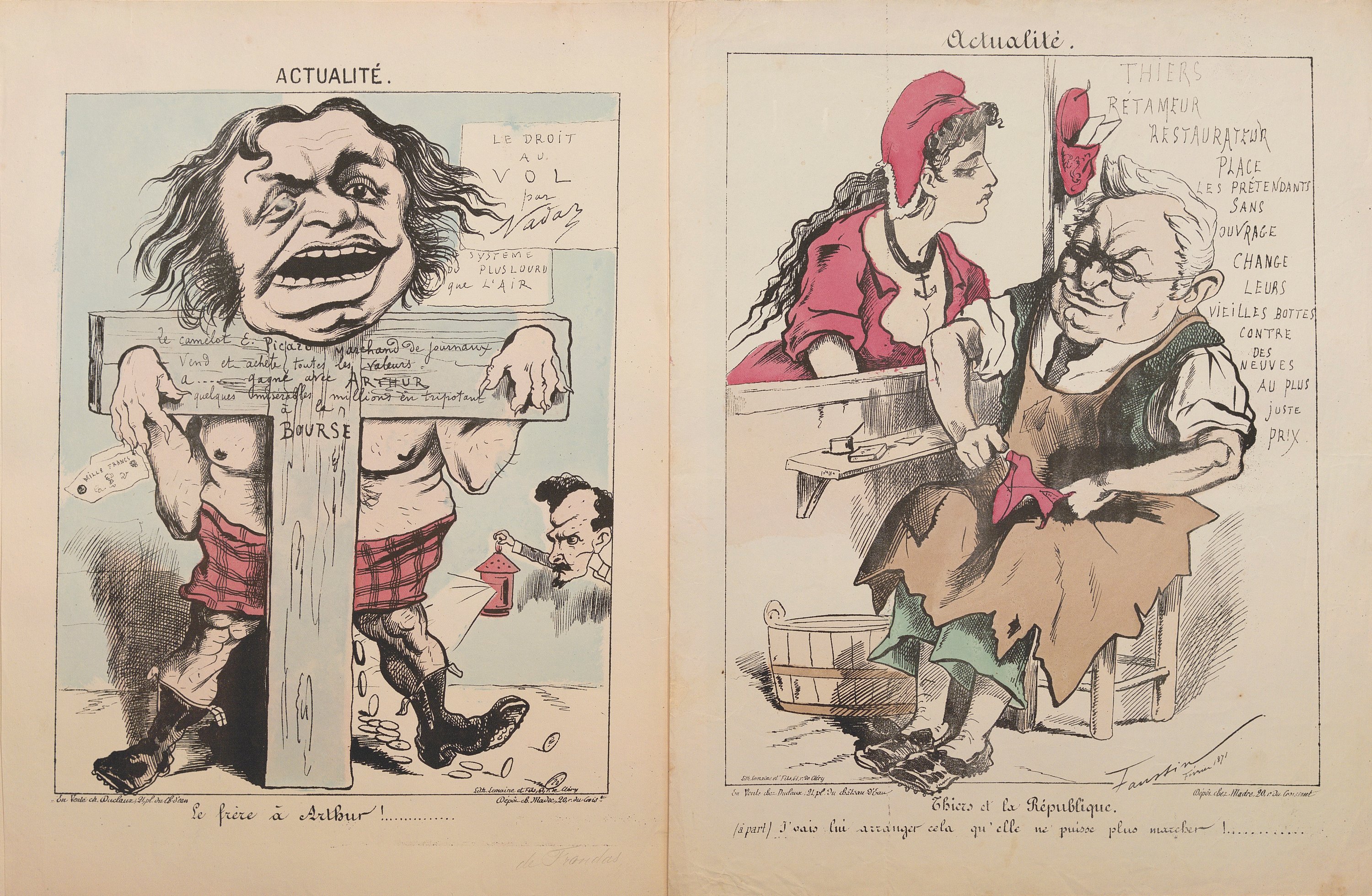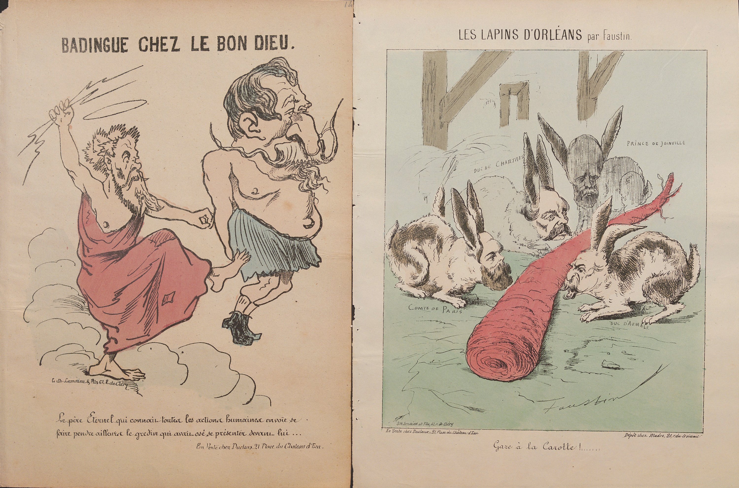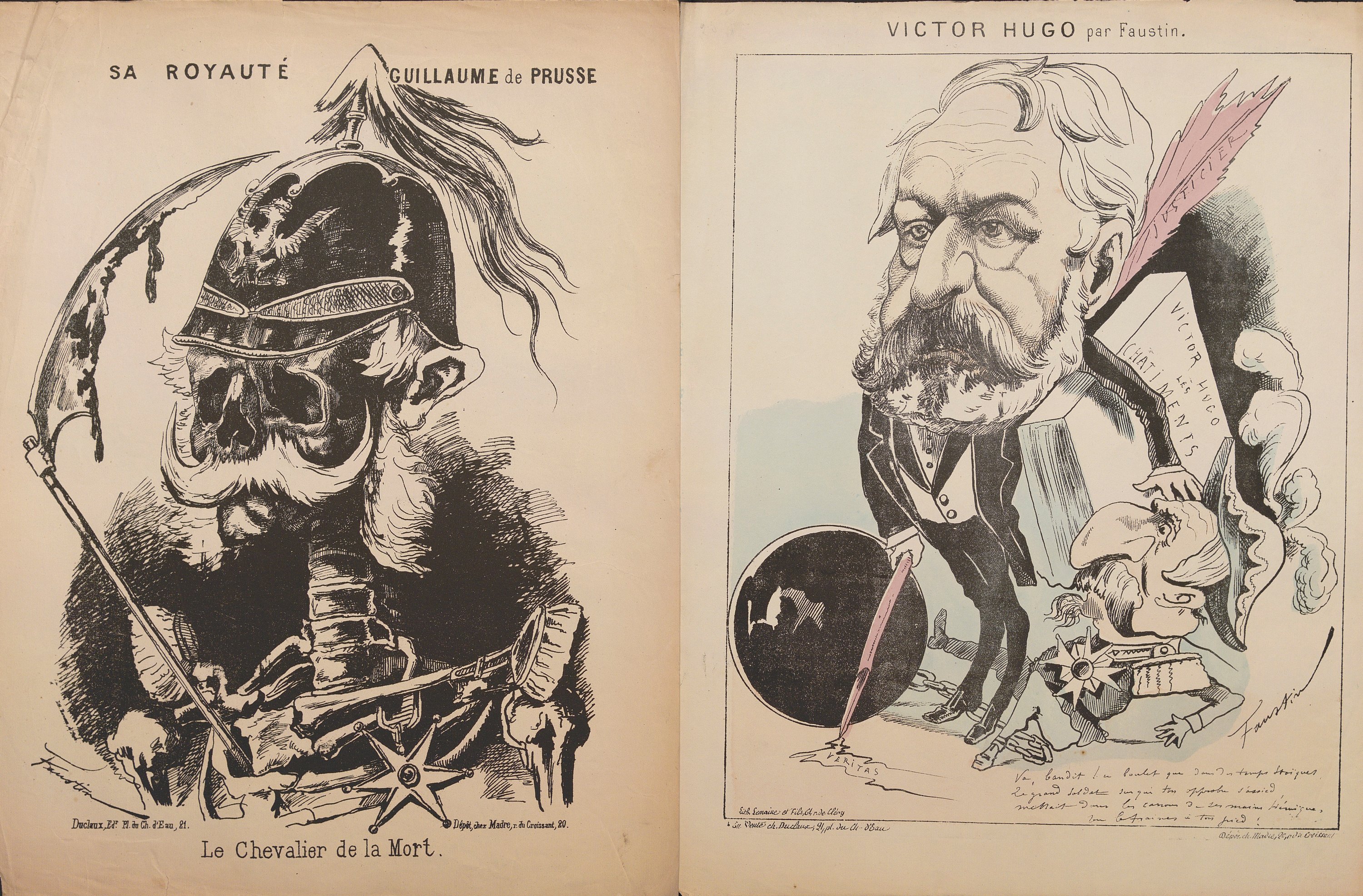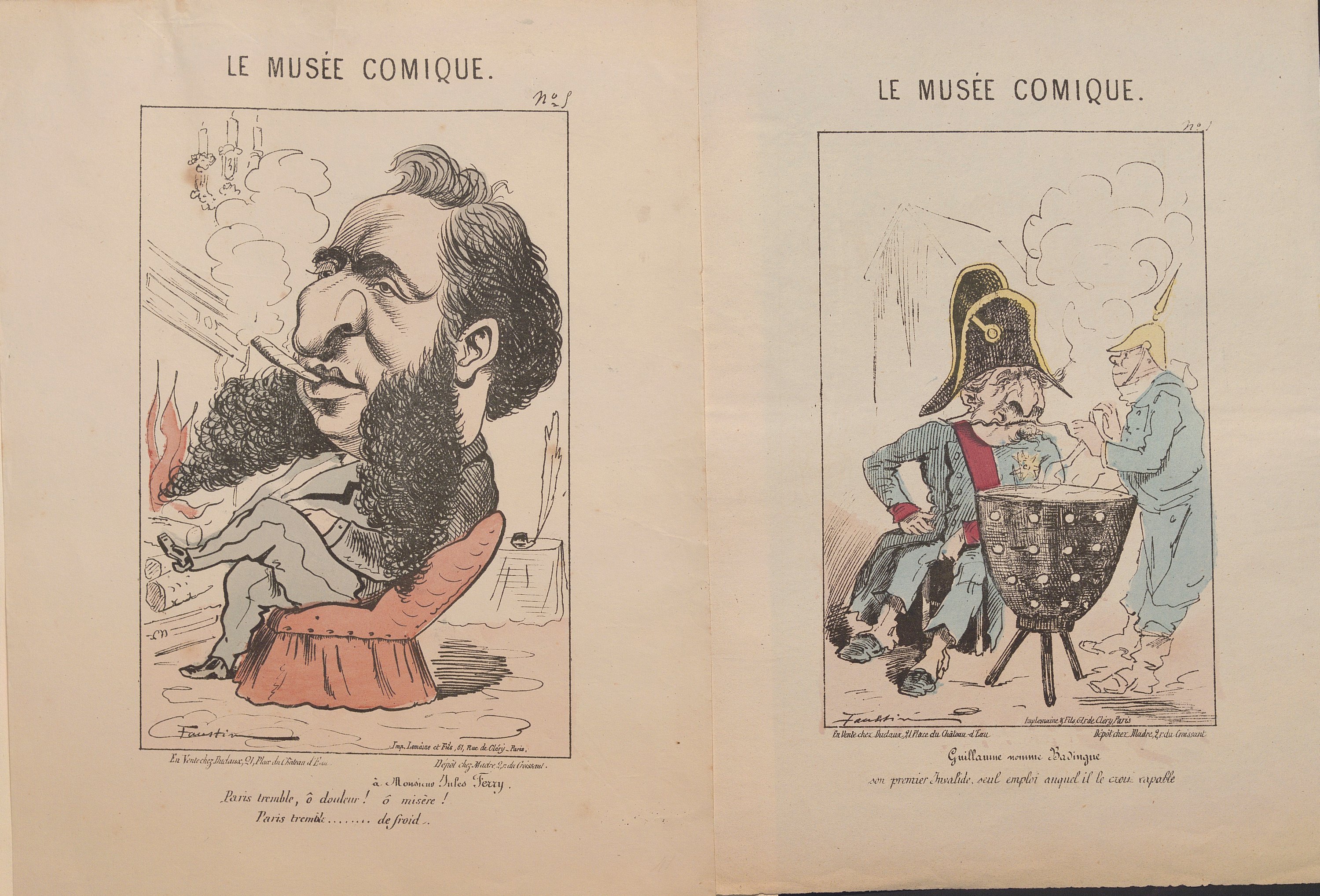 St Pierre et St Badingue (2 ex. dont 1 à marges courtes) ; Le Sire de Fisch-Ton-Kan ; La charité s’il vous plait ; De Profundis ; Un animal à l’engrais ; Eugénie ou la nouvelle Susanne au bain ; L’Aquarium ; Le lièvre ; Grandeur et décadence ; Un sombre polichinel ! ; Actualités, se demandant encore s’il va faire une dernière trouée ; Actualité, comment sortira-t-il de là !; Jadis et aujourd’hui (2 ex.) ; Grandeur et servitude militaire (2 ex. dont 1 à marges courtes) ; La clef de la situation ; Un cabinet ; Les melons (2 ex.) ; Entre diplomates ; La mère Thiers ; Les lapins d’Orléans ; Actualité, Peuple ! Défie-toi de ce plâtre ! ; Actualité, Thiers et la République ; Actualité, le frère à Arthur ! ; A Augusta impératrice de toutes les Prusses ; Etrennes utiles ; Victor Hugo ; Les élections en 1871 ; Badingue chez le bon dieu ; Figures contemporaines, Le Généralllll Changarnier ! ; Figures contemporaines, Thiers ; 5 ex. de la série Nos grands généraux : Ducrot, Garibaldi, Chanzy, Vinoy ; 2 ex. de la série Le Musée comique ; série Paris bloqué, n°1 au n°10 ; série Tableau de Paris , n°1 à 3 ;