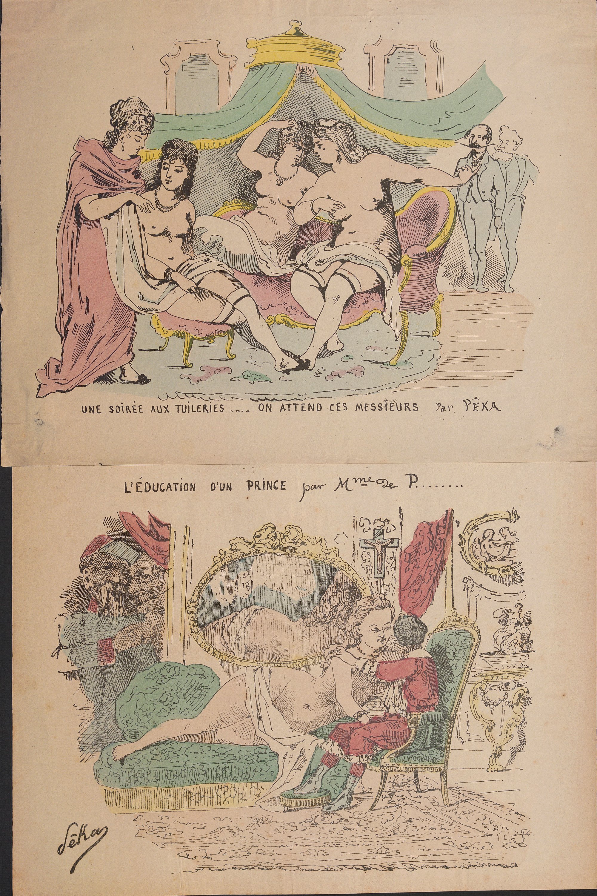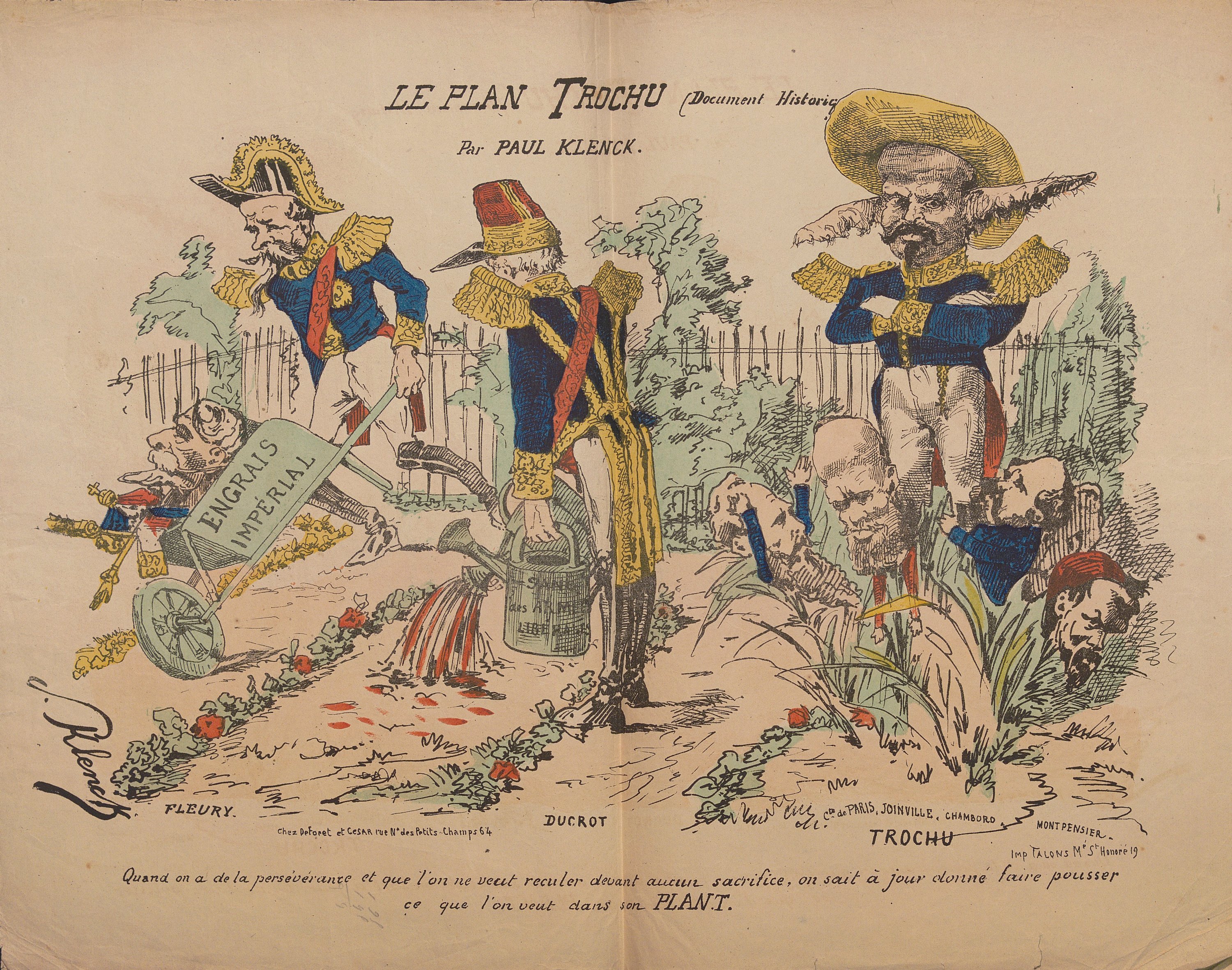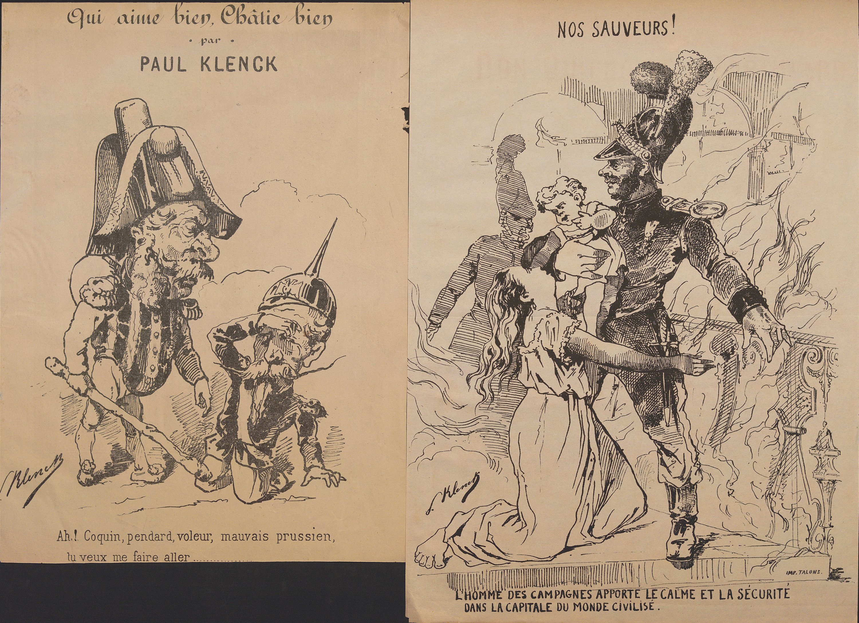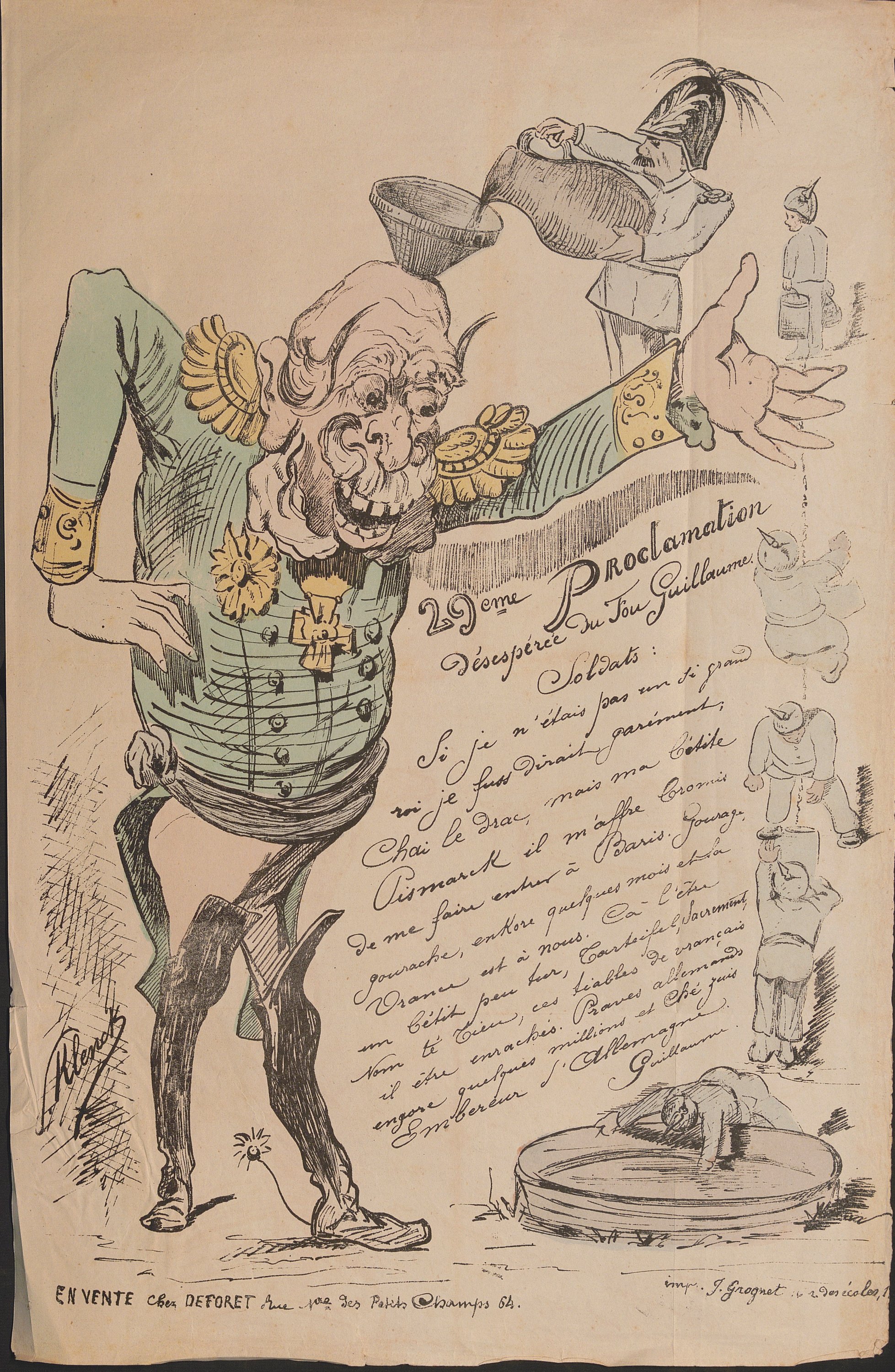 Le plan Trochu (document historique) , Badinguet gendarme, 2 ex. (1 en N&B et 1 en couleurs), 34,5 x 26 et 32,5 x 26 cm ; Restauration pontificale, plan de Charrette (en N&B) ; La Résurrection ; Versailles ; Le père Thiers (petites déchirures) ; Le paladin paladines ; Le Nouveau Mangin (petit mque en marge) ; Une séance à la Chambre ; La famille Badingue ou les derniers beaux jours (en N&B) (petites déchirures en marge) ; Le faussaire (petite déchirure) ; Un mauvais rêve du Père Guillaume ; La St Guillaume ; La Boue ; Le Maudit, 43,5 x 30 cm (petits déf.) ; Monseigneur Darboy archevêque de Paris assassiné ; La France trahie : Vous pouvez entrer il dort ; 29e proclamation désespérée du Fou Guillaume , 44,5 x 29 cm (petits déf.) ; Garibaldi approvisionne son armée ; Les premiers exploits de Bonaparte ; Souscription républicaine ; La force lutte avec le droit ; Qui aime bien châtie bien (en N&B) ; Nos sauveurs !... (en N&B) ; Les Prussiens après l’attaque, venez donc goûter ; Les Prussiens après l’attaque, Bataille du ; Augusta monte à sa tour, Guillaume ne revient pas ; Le mat de cocagne politique 1871 ; Pauv’ Badingue, Dégommé ! (en N&B) ; Actualités n°1, Dernier degré de l’échelle impériale ; L’homme à la perche ; Nouvelles de Versailles ; Actualité, Le retour du vainqueur ; Actualités, l’armée de la Loire met les Prussiens en déroute (en N&B et en couleurs) ; Actualités, Père et fils ; Actualité, la Débâcle ; Le départ de la Commune et de ses communiants ; Actualités, c’est y pour l’enfant ; Actualités,; Les trois Larrons ; L’archi-monseigneur ; Les valets de l’Empire n°1 ; Hure III ; Un pétroleur ; Une pétroleuse ; Musée burlesque n°1, Faust et Marguerite ; Musée burlesque n°2, Les absents ont tort ; Musée Burlesque n°3, Condamné à ; Panorama anti-bonapartiste n°1 ;