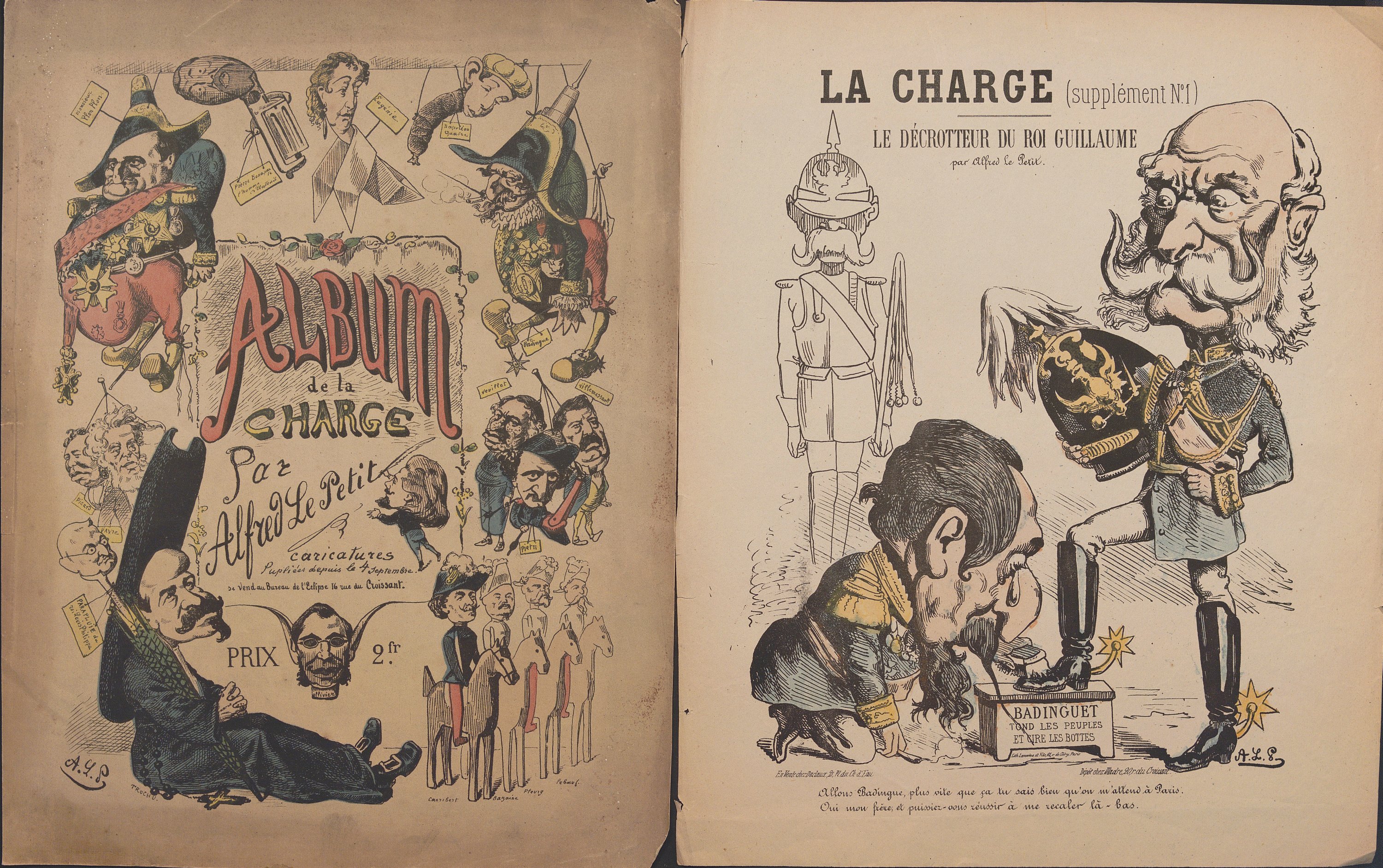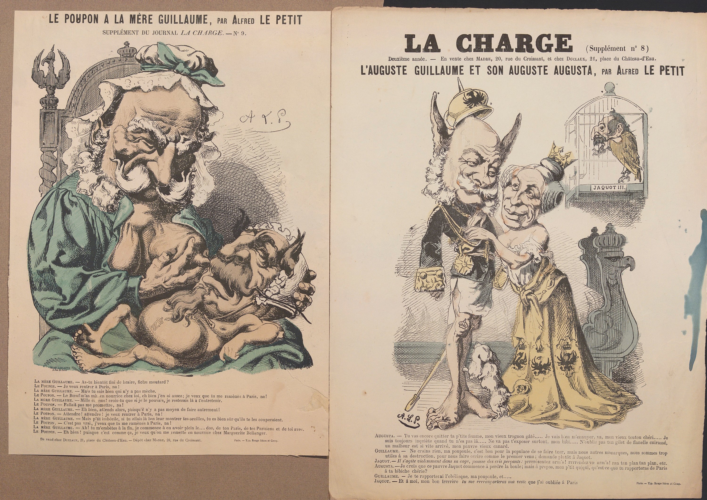 Série « Album de la Charge, caricatures publiées depuis le 4 septembre » : page de titre, n°1 (3 ex.), 2 (2 ex.), n°3, 4, 5, 6, 7, 8 (2 ex.), 9, 10 et 11, env. 36 x 28 cm ;