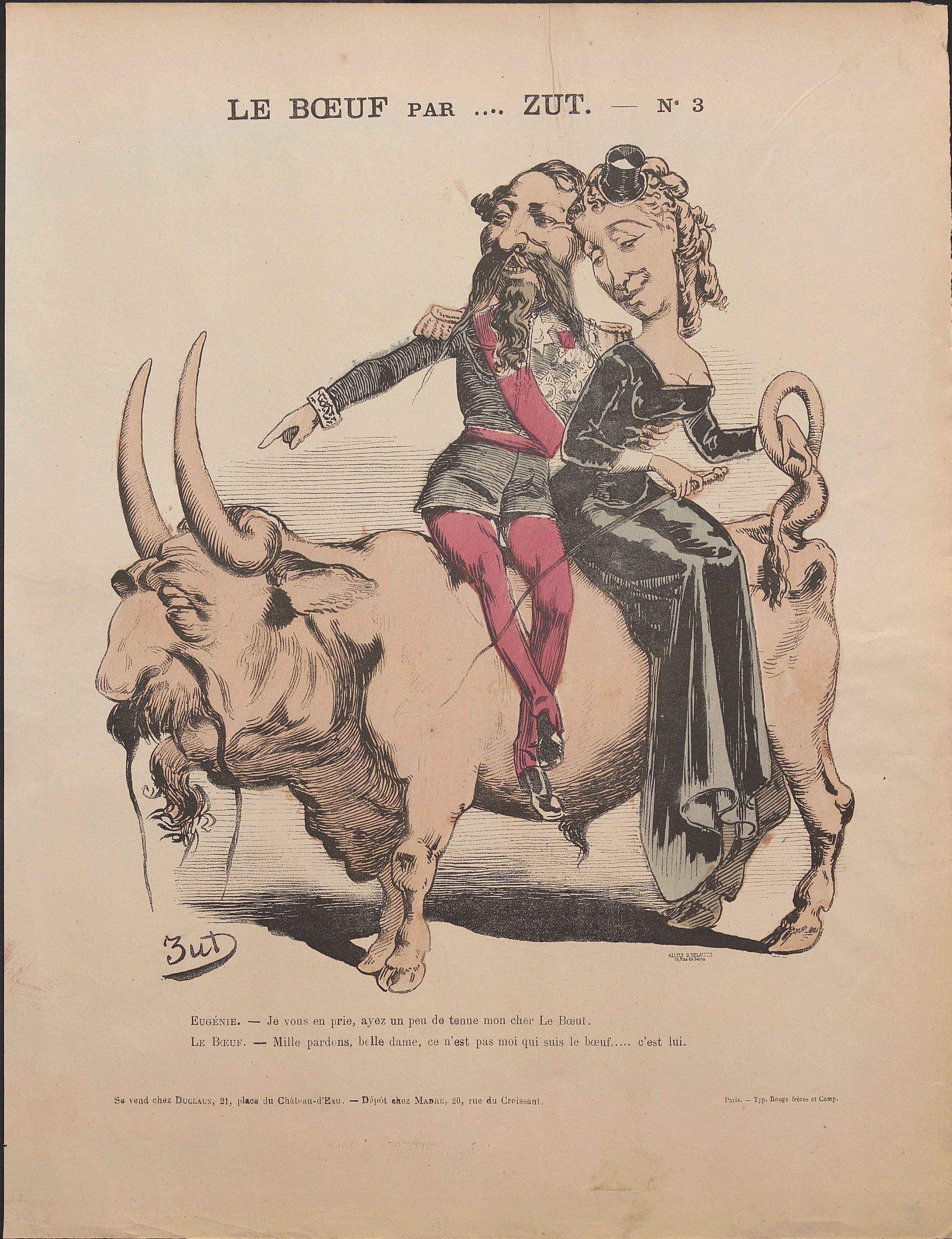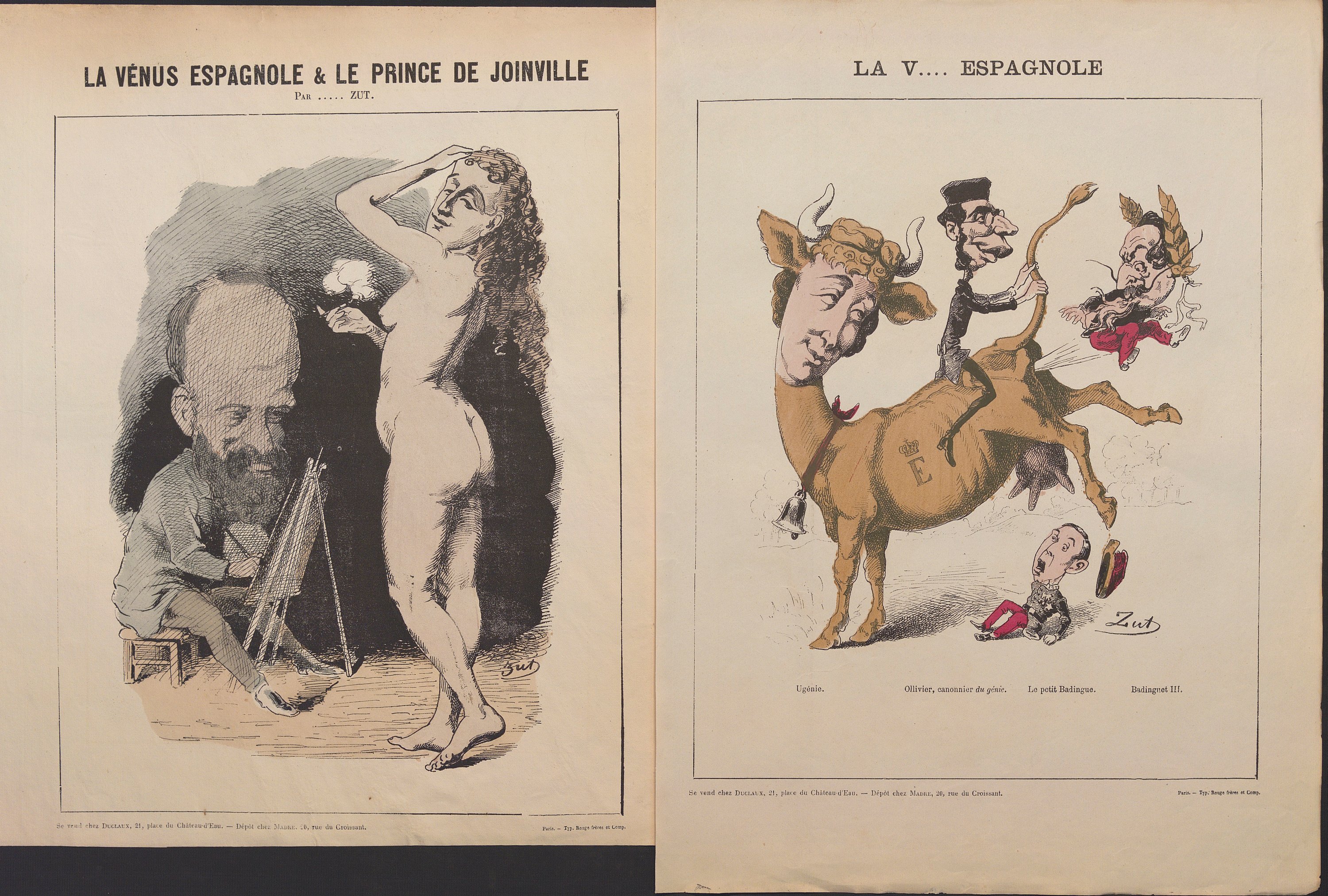 4 lith. signées Zut : La V espagnole (2 ex.), 35 x 26,5 cm ; La Vénus espagnole & le Prince de Joinville, 34 x 27 cm ; Le bœuf par Zut, 35,5 x 27,5 cm.