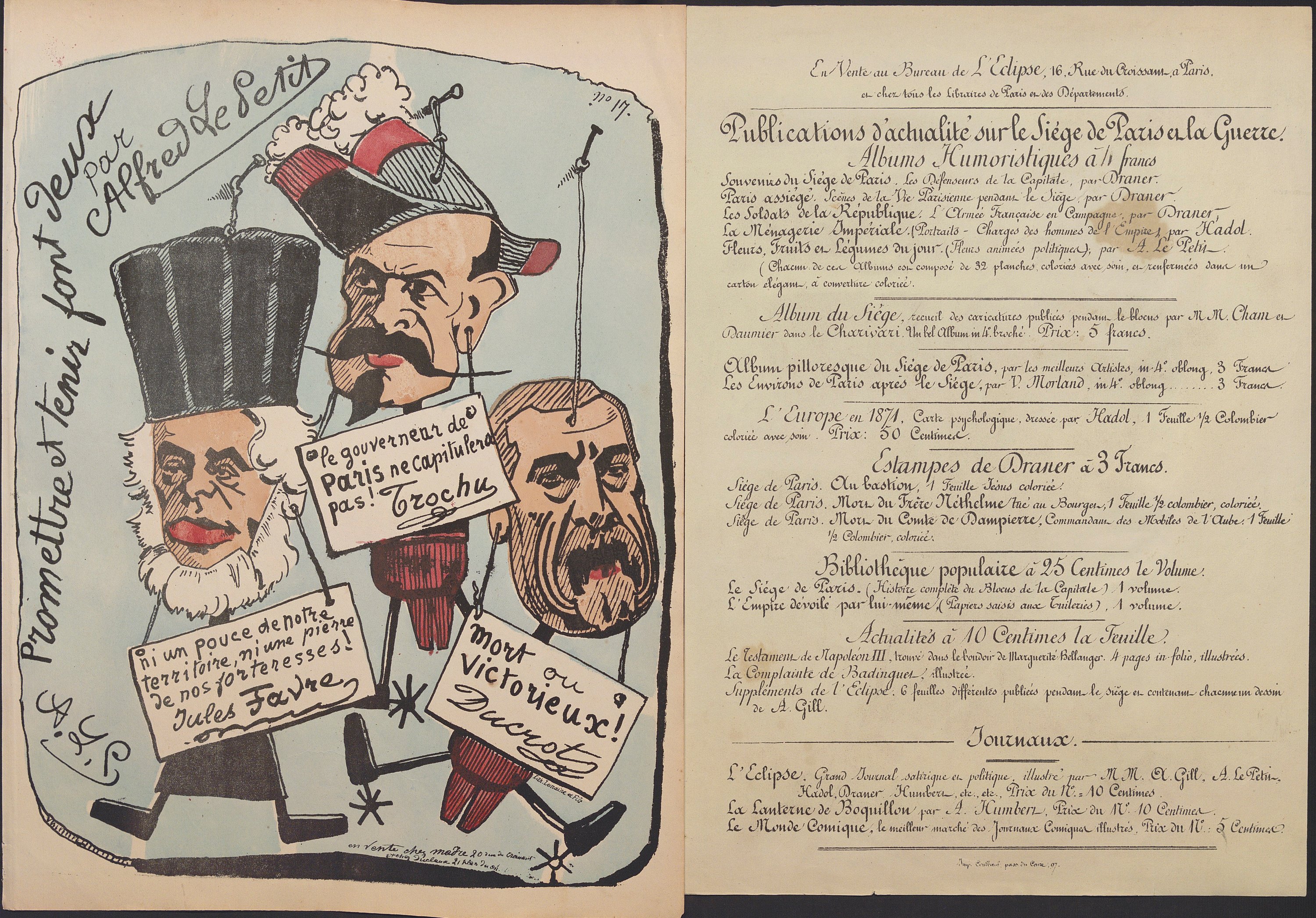 « Publications d’actualité sur le Siège de paris à la Guerre » « En vente au bureau de l’Eclipse, 16, rue du Croissant à Paris », 33,5 x 23,5 cm ;