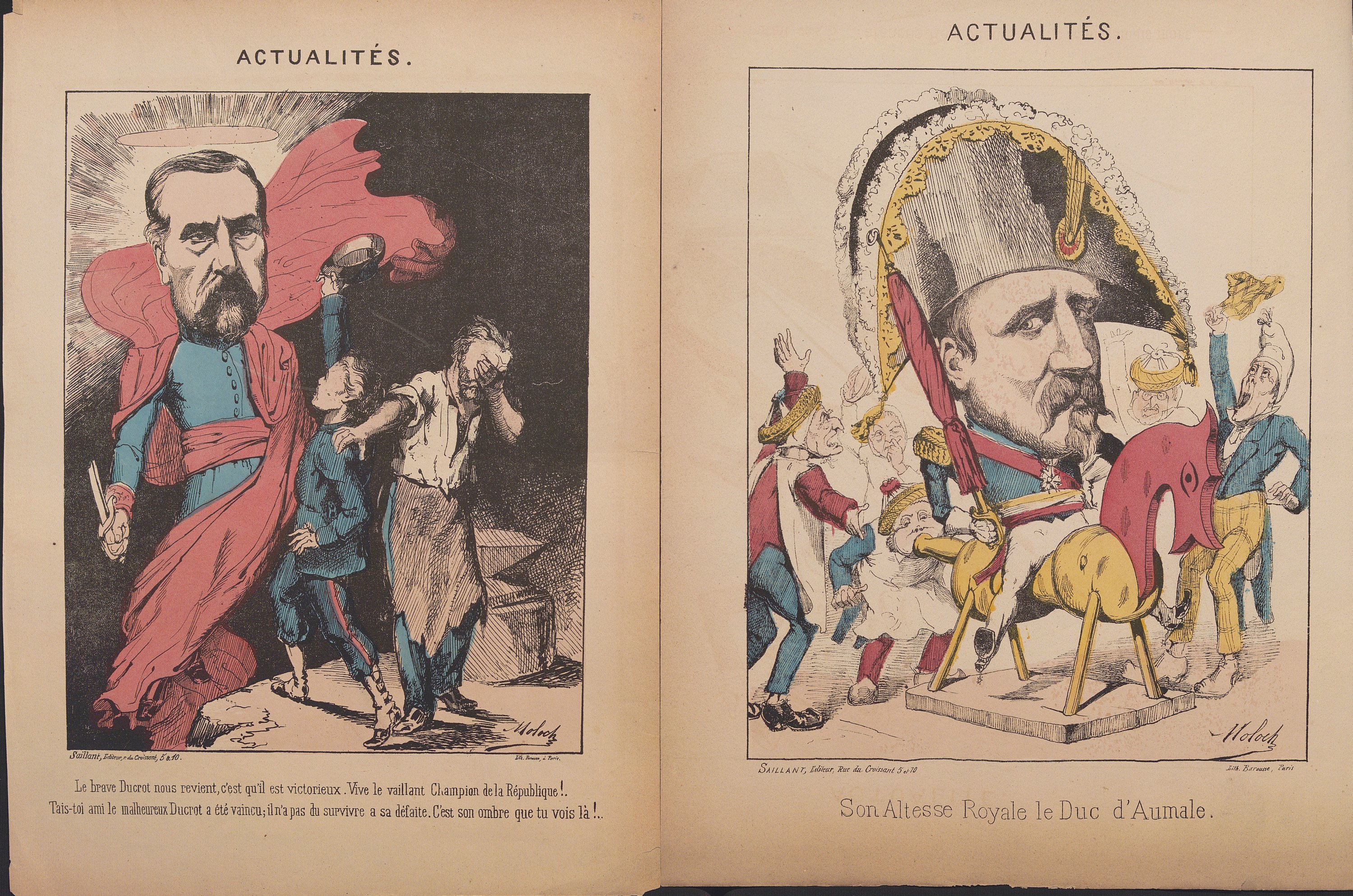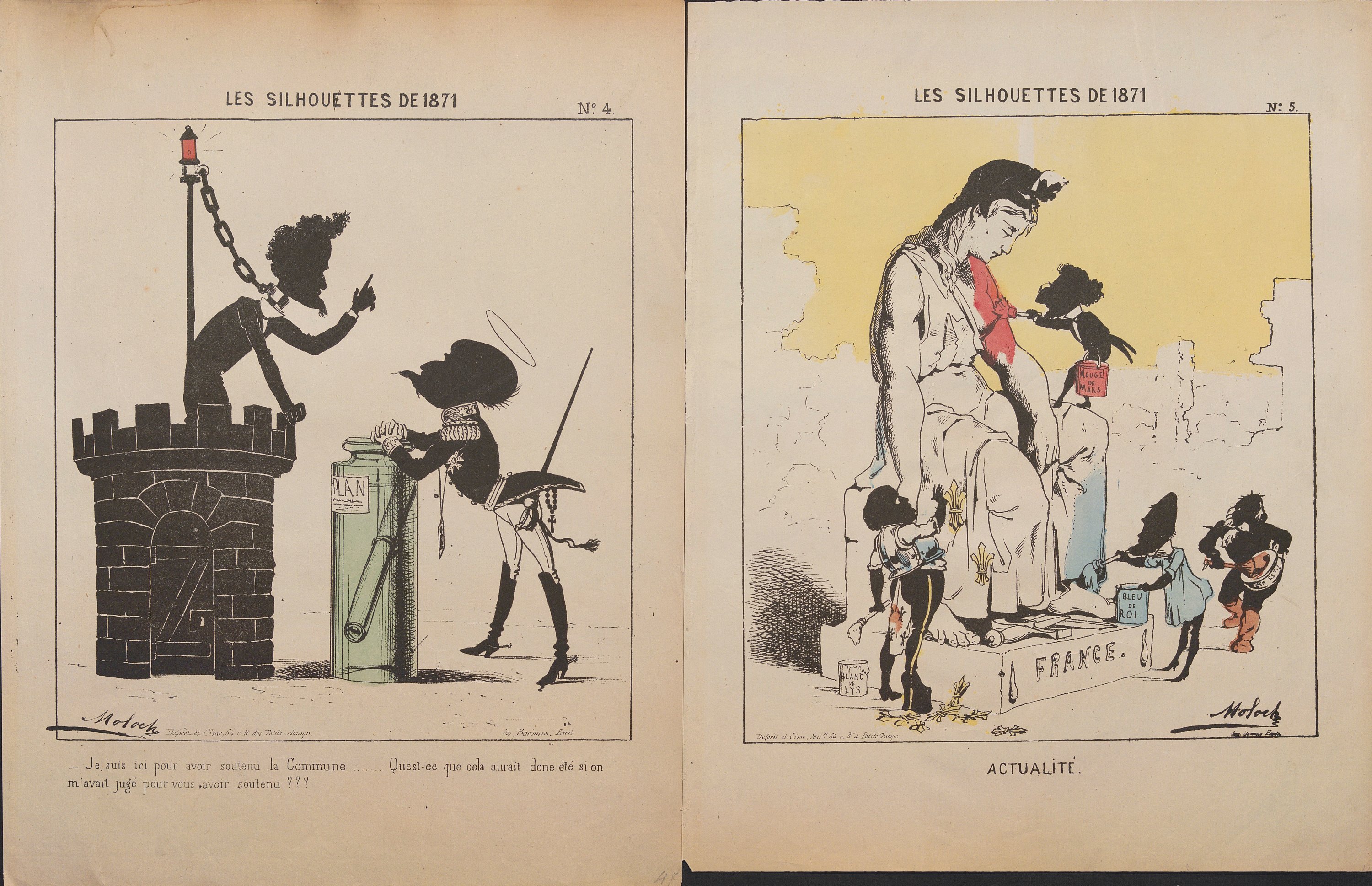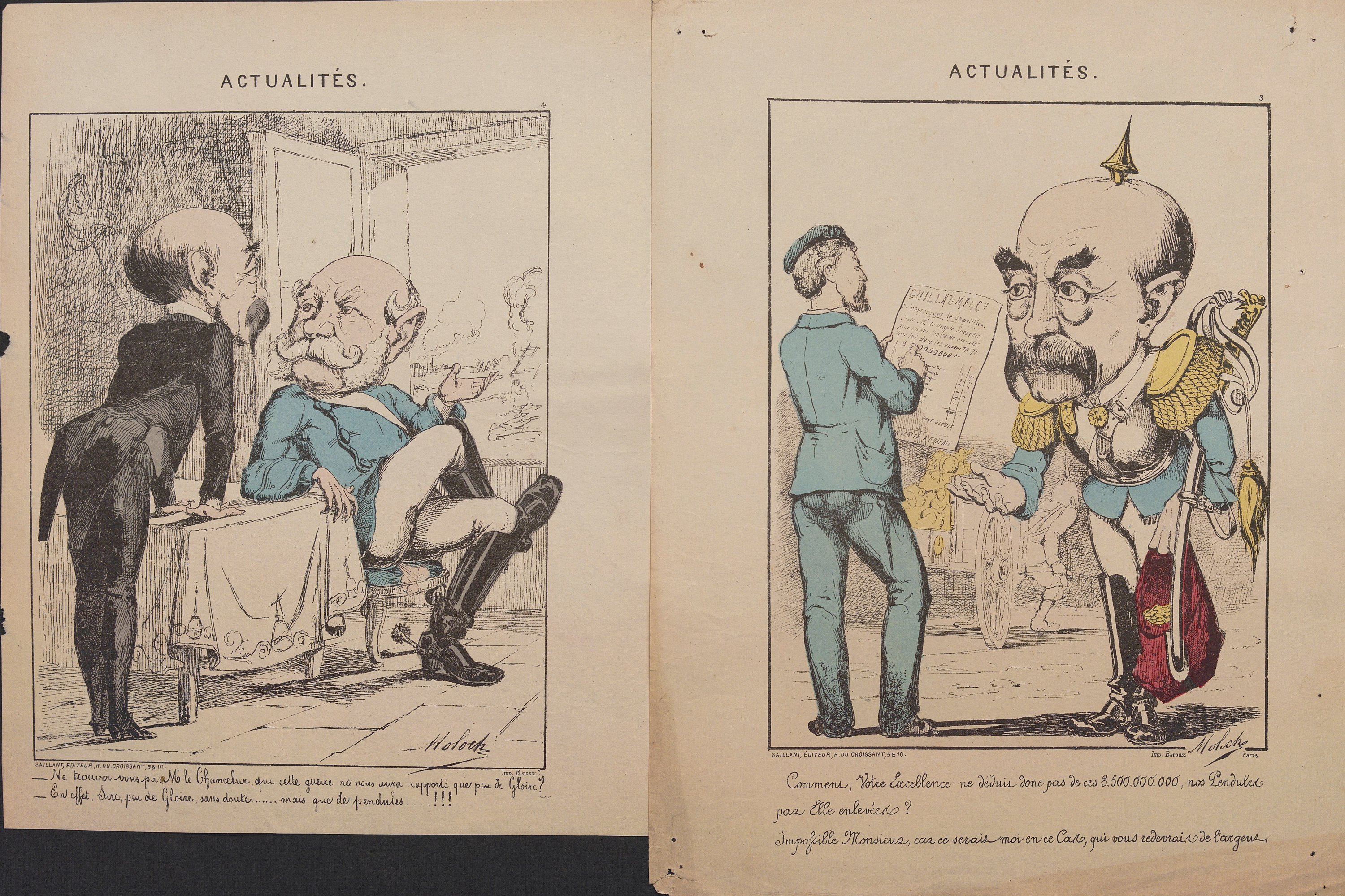 Série Actualités, 7 pl. (sur 8), env. 34 x 27 cm ; Joli cadeau fait à la Prusse !, en N&B, 33,5 x 25 cm (petits déf.) ; Ses maitresses !, 33,5 x 26,5 cm ; Les binettes du jour n°1, 33,5 x 27 cm ; Hommes politiques, Vox populi, vox démolie !!, 34 x 27 cm ; Hommes d’état, La grande colère du père Jules Bavre, 36 x 27 cm ; série Les Prêtres, n°1 au n°27 (mque 18, 26, 28 et 29), formats et petits déf. divers, certains contrecollés sur feuillet ; série Paris dans les caves, n°1 à 8 et n°11 (sur 39), 34,5 x 26 cm ; série Les Silhouettes de 1871, n°4 à 9, 13-14, 18-20 (sur 26), en majorité 35 x 26,5 cm (petits déf.) ; Badingoscope n°7, en N&B, 33,5 x 28 cm ; série Les Fils de Cerbère, n°8, 10, 12, 14 et 16 (sur 19), 35,5 x 27 cm ; série L.L. Ex. Ex. les Automédons, page de titre, n°2-5, 8-10, 12-19, 24 (sur 24), 34,5 x 27,5 cm (petits déf.).