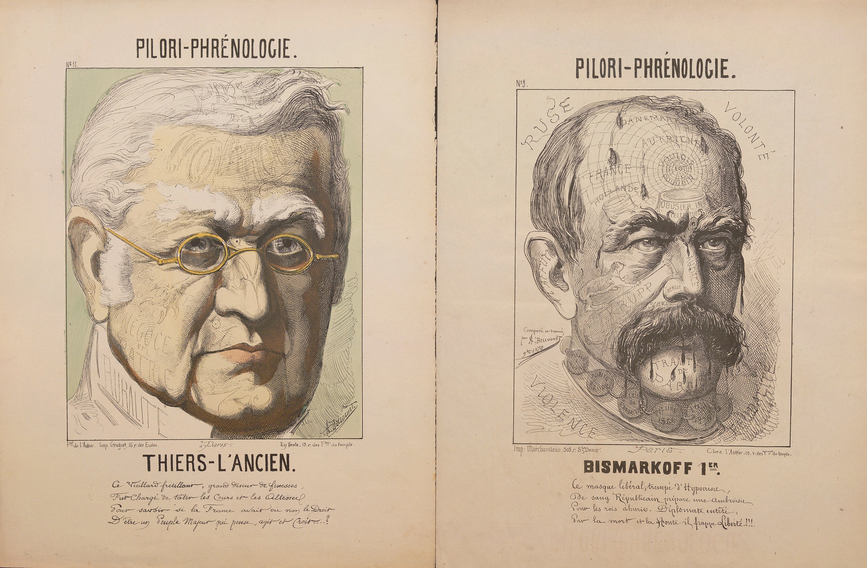 Série de Pilori-Phrénologie : Napoléon III (en coul. et en N&B) ; Pie IX (en coul. et en N&B) ; Olivier Iscariote (en N&B) ; S.S. Guillaume le Boucher (en coul.) ; Bismarkoff Ier (en N&B) ; Thiers l’Ancien (en coul.) ; Leboeuf ! (en coul.), env. 32 x 24,5 cm ;