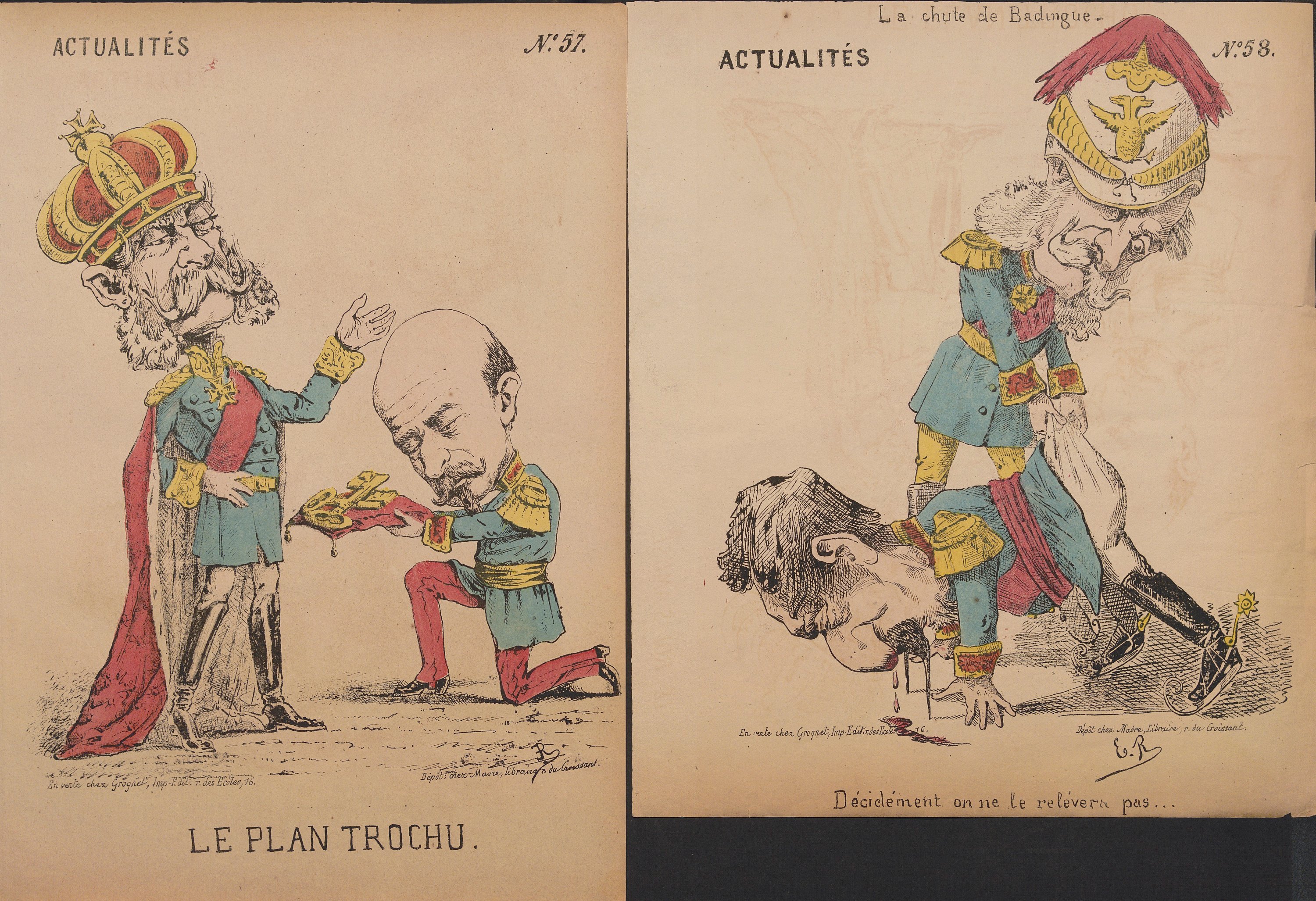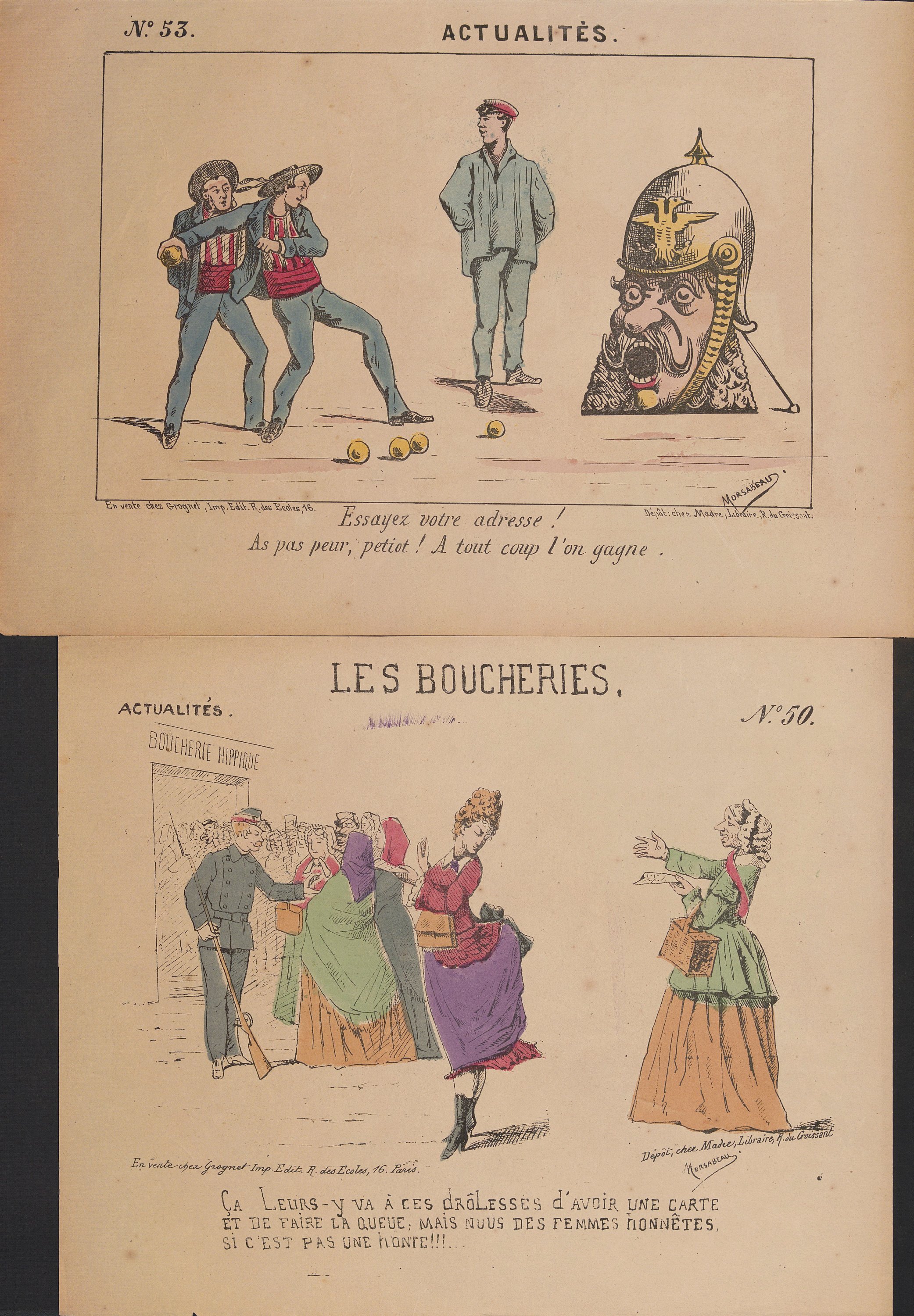 Actualités Grognet : n°50 Les boucheries , 27,5 x 34 cm ; n°52 La chasse aux Prussiens !!!..., 37,5 x 26 cm ; n°53 Essayez votre adresse !..., 26 x 37 cm ; n°57 Le plan Trochu, 37 x 26 cm ; n°58 La chute de Badingue, 33,5 x 28,5 cm ; n°59 Souvenir du siège, Le Bœuf Gras en 1871 !!!, 26,5 x 32 cm ; n°60 Le don des Anglais , 26 x 37 cm ; n°64, Le départ , 34xx 25,5 cm ;