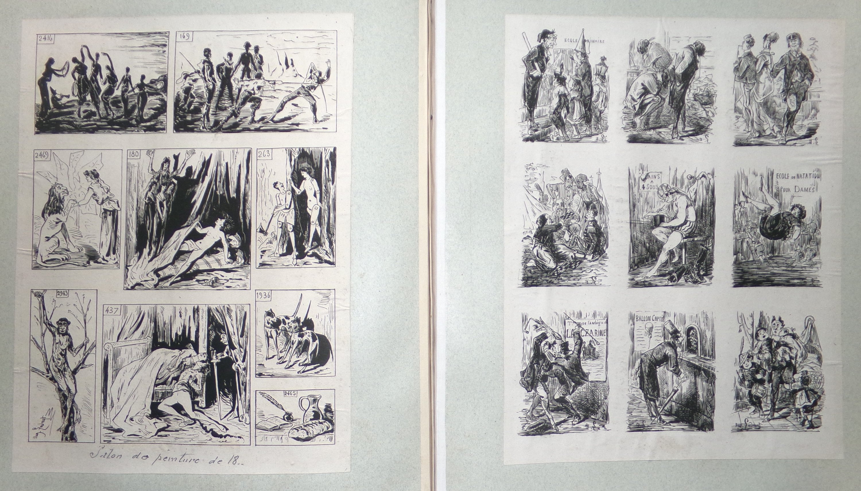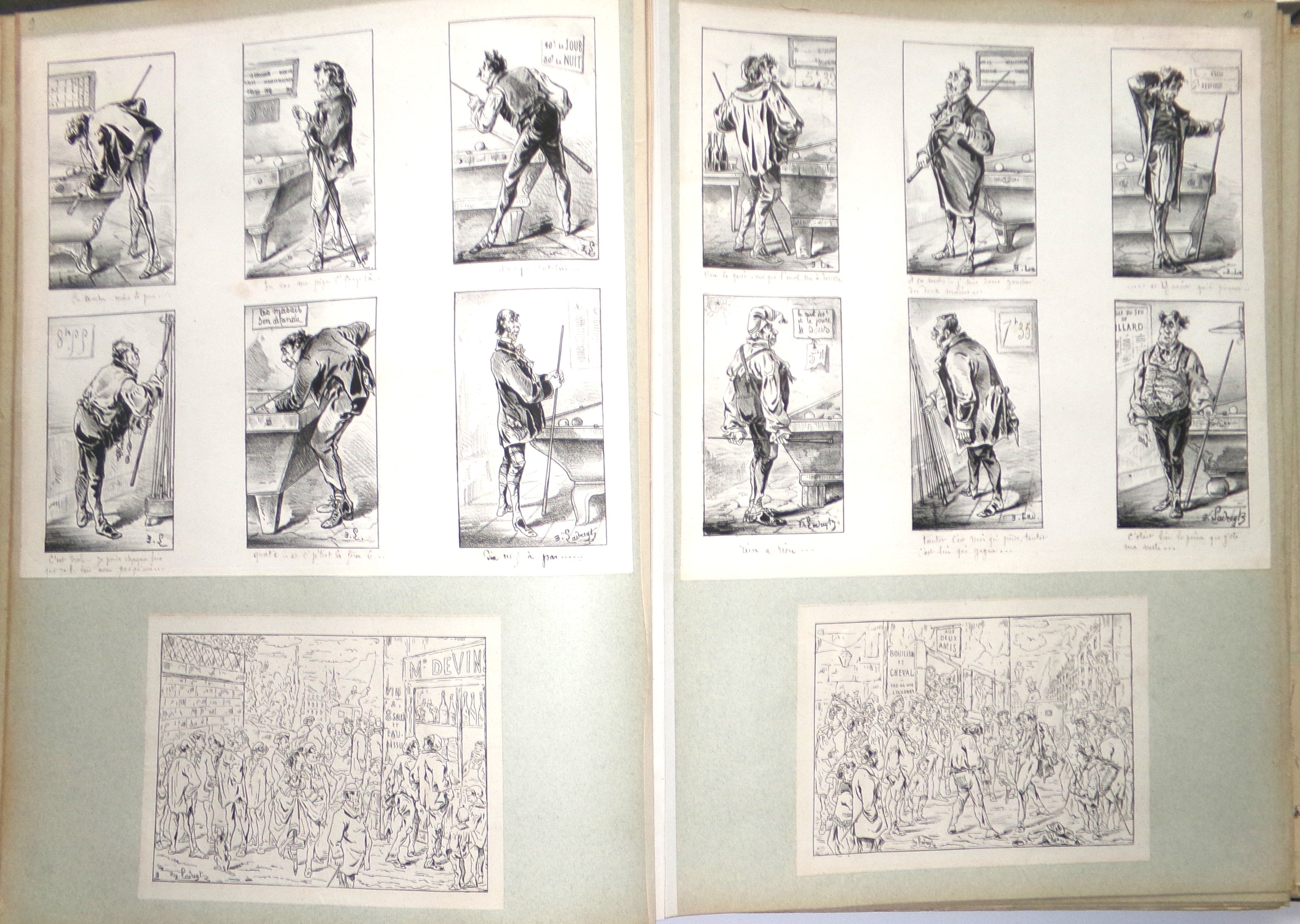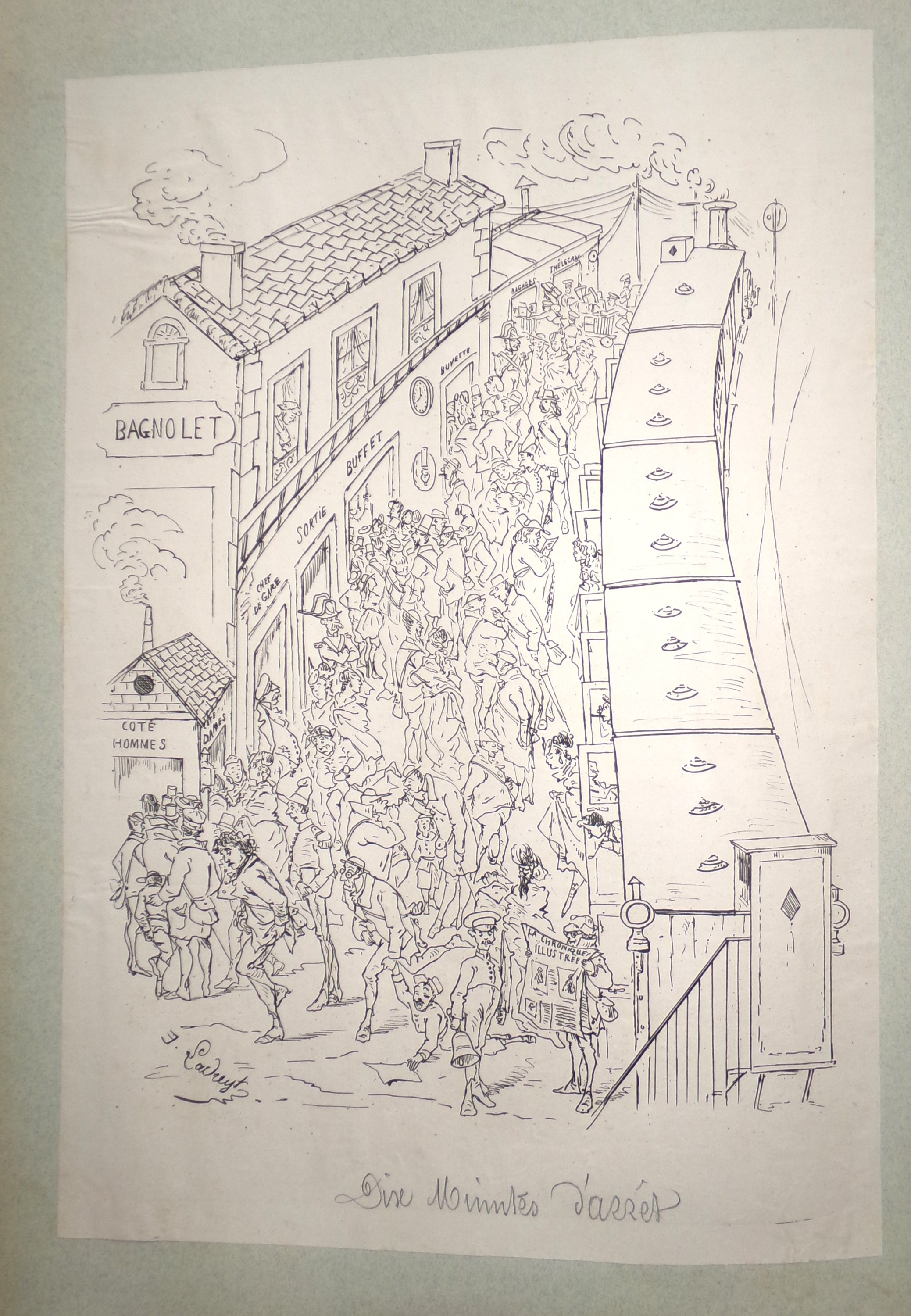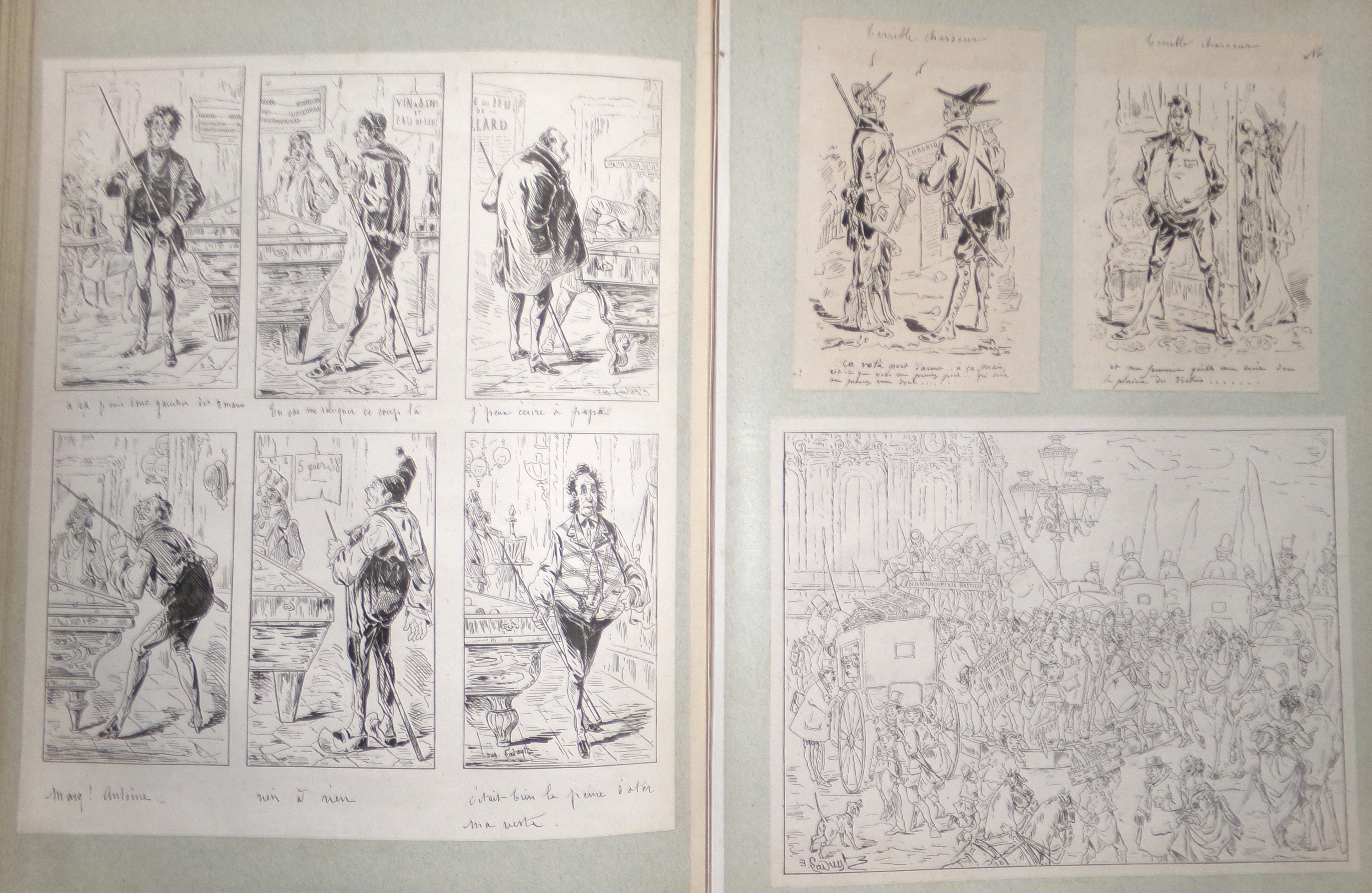 Rare réunion des dessins satiriques d’Eugène Ladreyt, publiés dans la presse de l’époque (La Revue Comique, L’Eclipse, Le Grelot, Le Sifflet, Paris-Comique, ou encore dans Guguss’!!! créé en 1870 par Ladreyt lui-même), figurant les scènes de mœurs de de l’époque : Saltimbanques ; Guignol ; Courses hippiques ; La foire aux jambons ; L’omnibus complet ; La partie de billard ; La farandole ; Le vitrier ; Dix minutes d’arrêts ; Récréations ; Les tambours du village ; Paris carnaval sortie d’un bal masqué ; Les quatre quartiers de lune ; Nos girouettes ; Embellissements de Paris, avenue Napoléon ; Bureau de nourrice ; Bureau de placement ; L’homme à la tête de bois ; Rue du Croissant ; Bains à 4 sous ; Nouvelle salle des Pas-Perdus ; Type des marchés ; Les joueurs de boules ; Le rat et le ratier ; Le lendemain des élections ; Courses de vélocipédistes place de la Bourse ; Foire au pain d’épice ; etc.