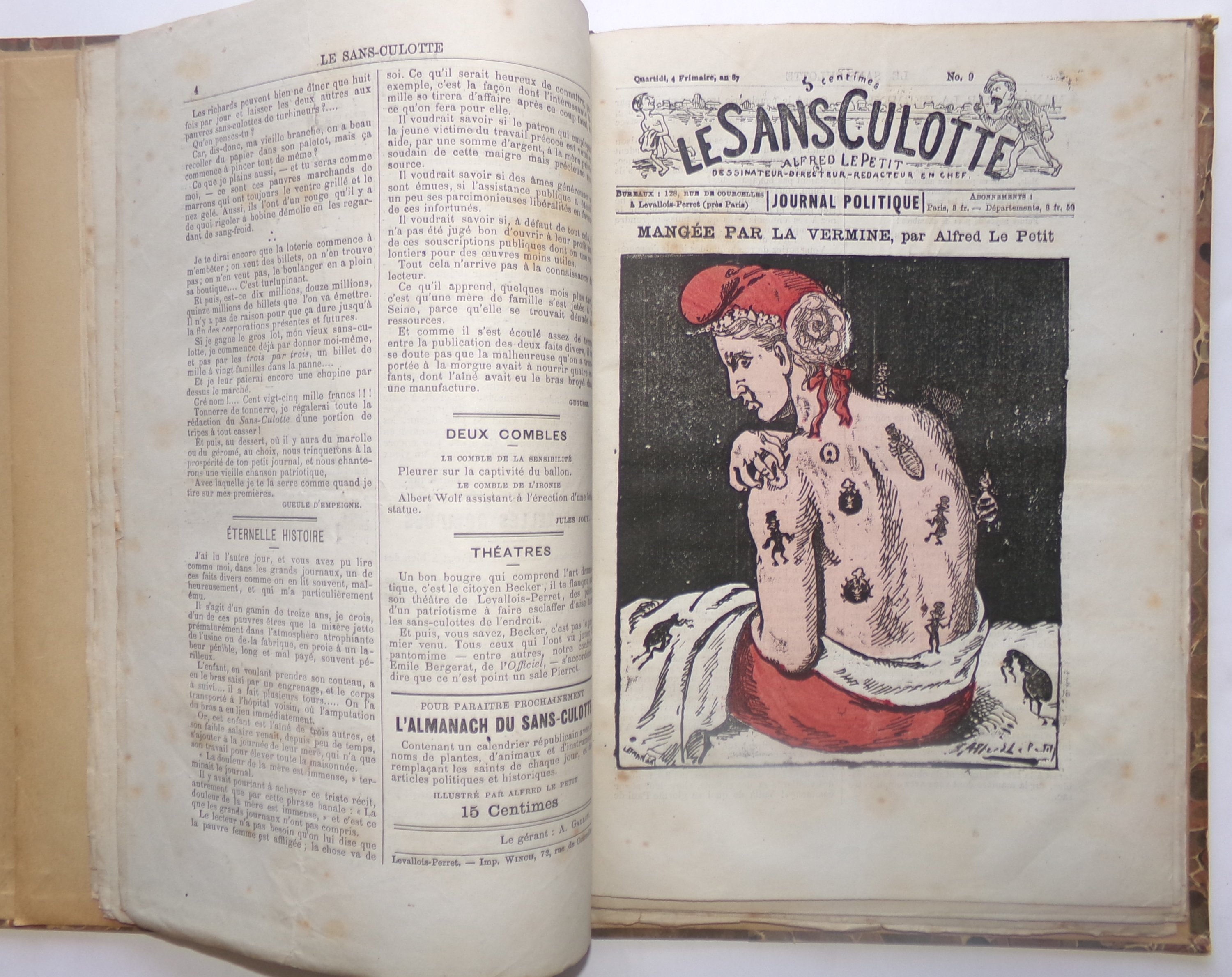 Le Sans-Culotte, n°1 à 29 (1878-1879), in-8 rel. ½ toile. Manque le dernier numéro (30). Dans la mouvance radical-socialiste, Alfred Le Petit vise, par le crayon et le texte, les monarchistes, les bonapartistes, le cléricalisme, militant pour l’amnistie totale des communards et s’intéressant au sort des « travailleurs ». Rare. T.B.E. (rousseurs) ;
