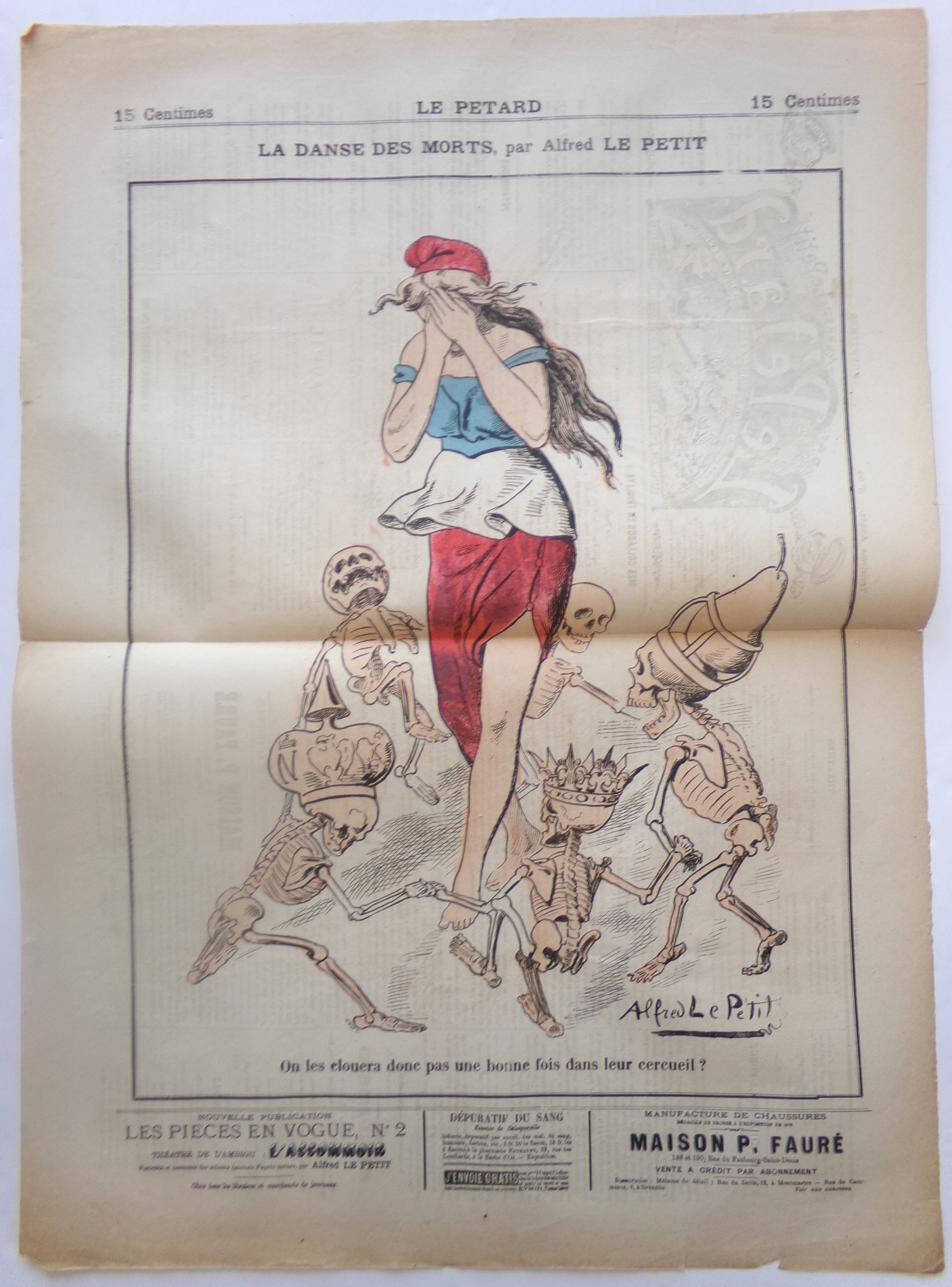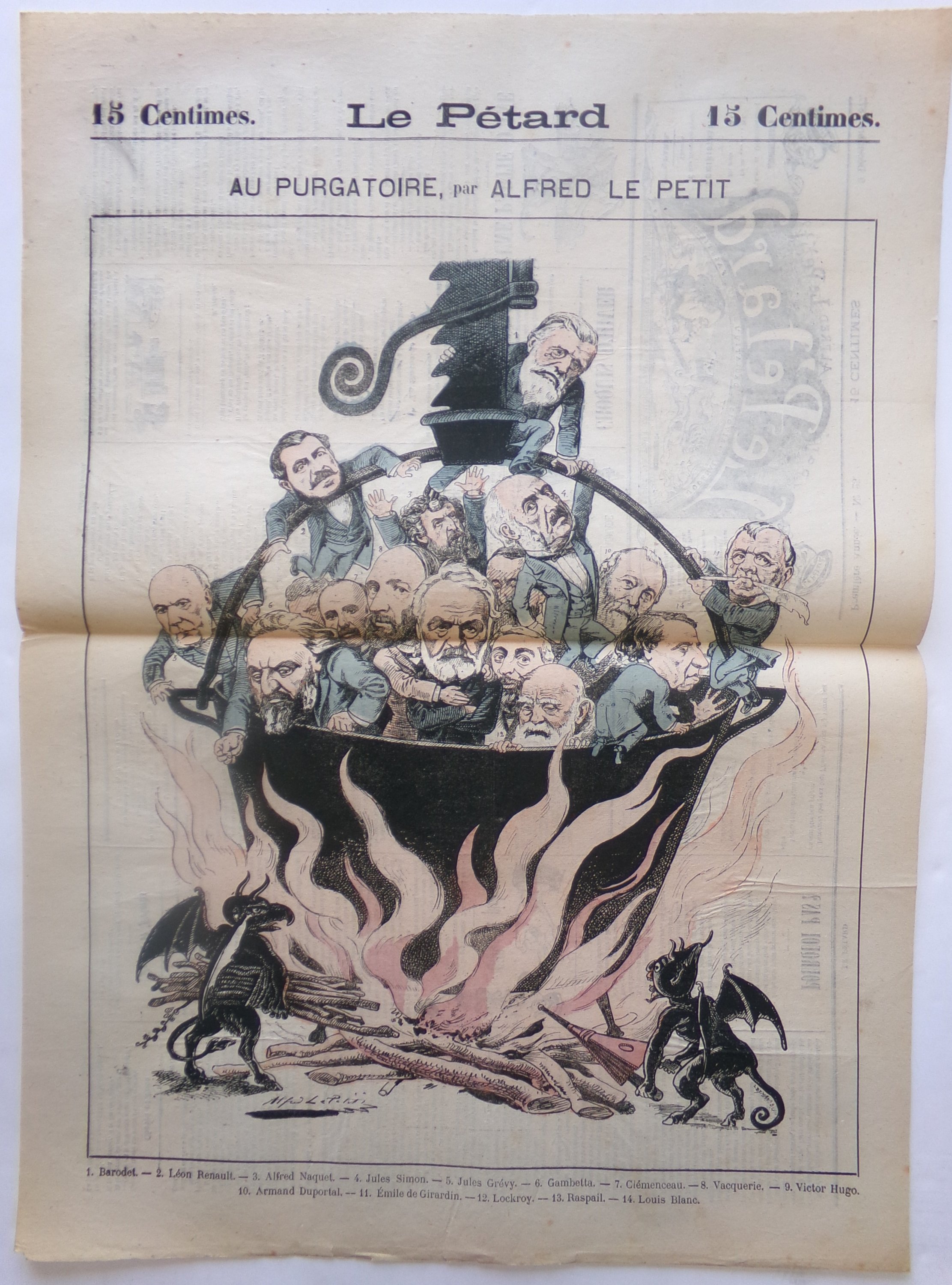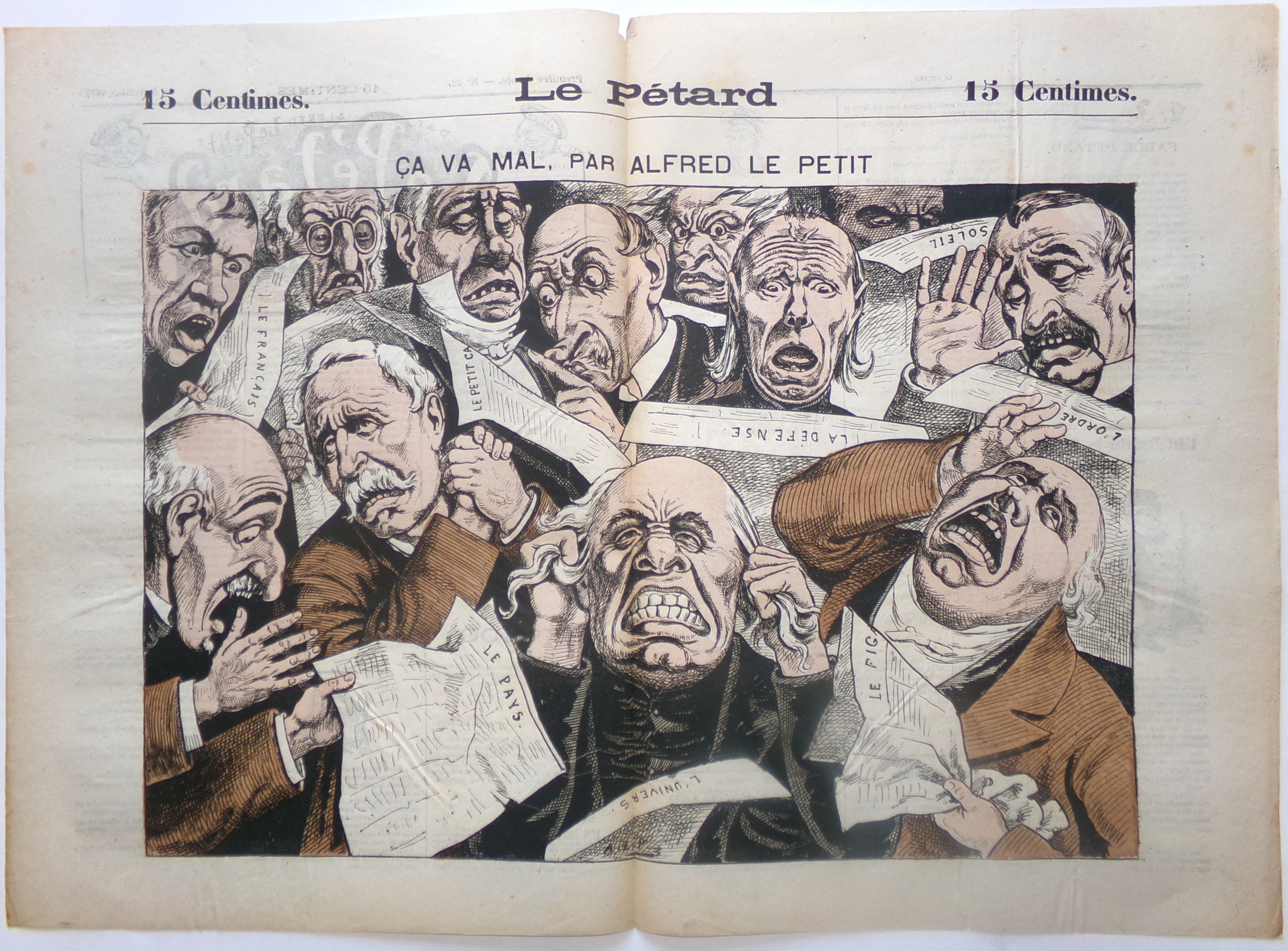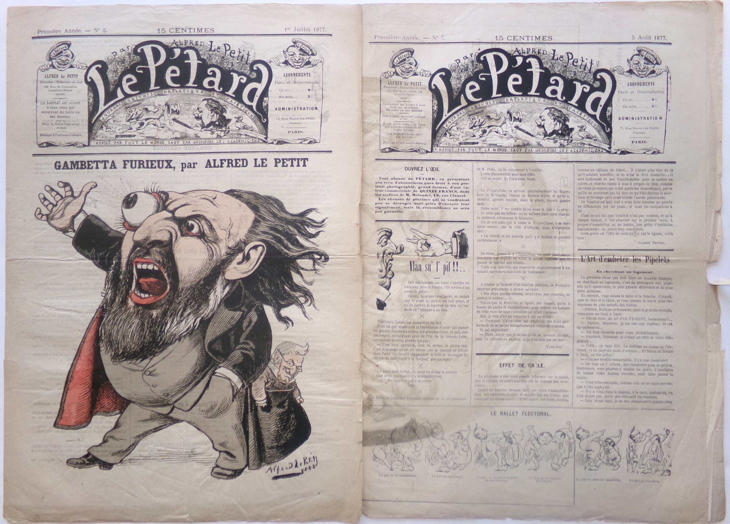 Le Pétard, 85 numéros (avec des doubles) entre le n°2 (1er juillet 1877) et n°99. Journal satirique fait entièrement par Alfred Le Petit qui est paru régulièrement jusqu’au n°97 (1879). Il lui a fallu ensuite attendre 9 ans pour publier les 15 derniers numéros qui se termine au n°112 d’août 1888. Peu courant. Etat moyen à T.B.E.