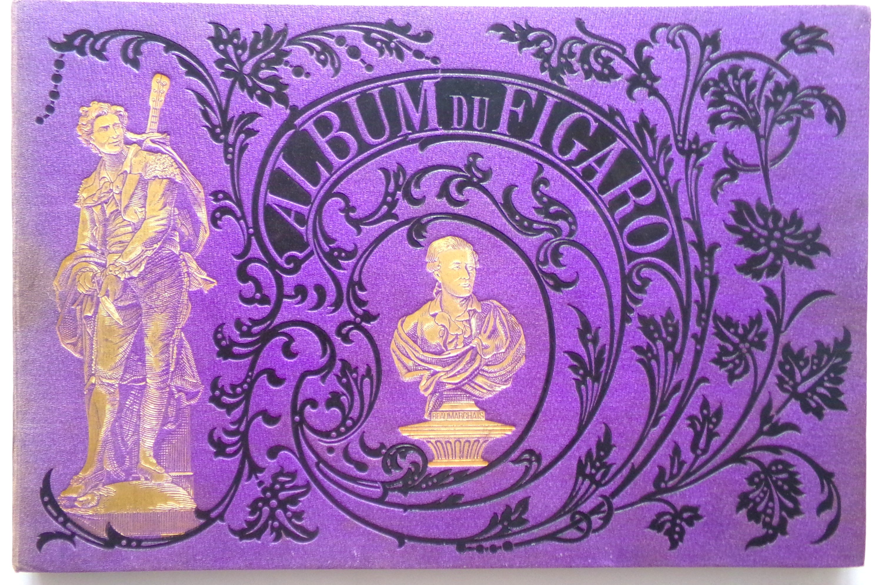 Alfred d’Aunay, L’album du Figaro. 1875. In-folio à l’italienne, 84 ff. et 24 pp. de publicité, percaline violette de l’éditeur, décor polychrome noir et or sur les plats ;