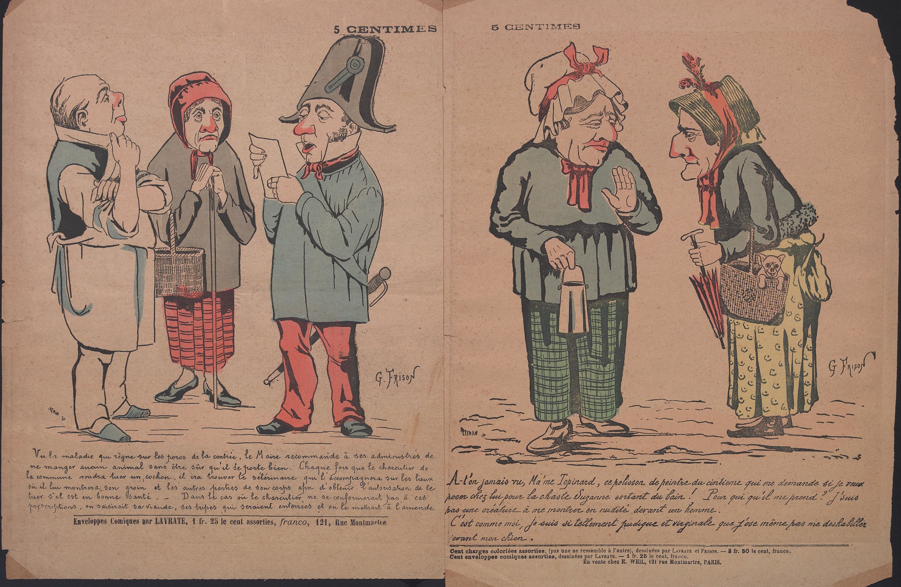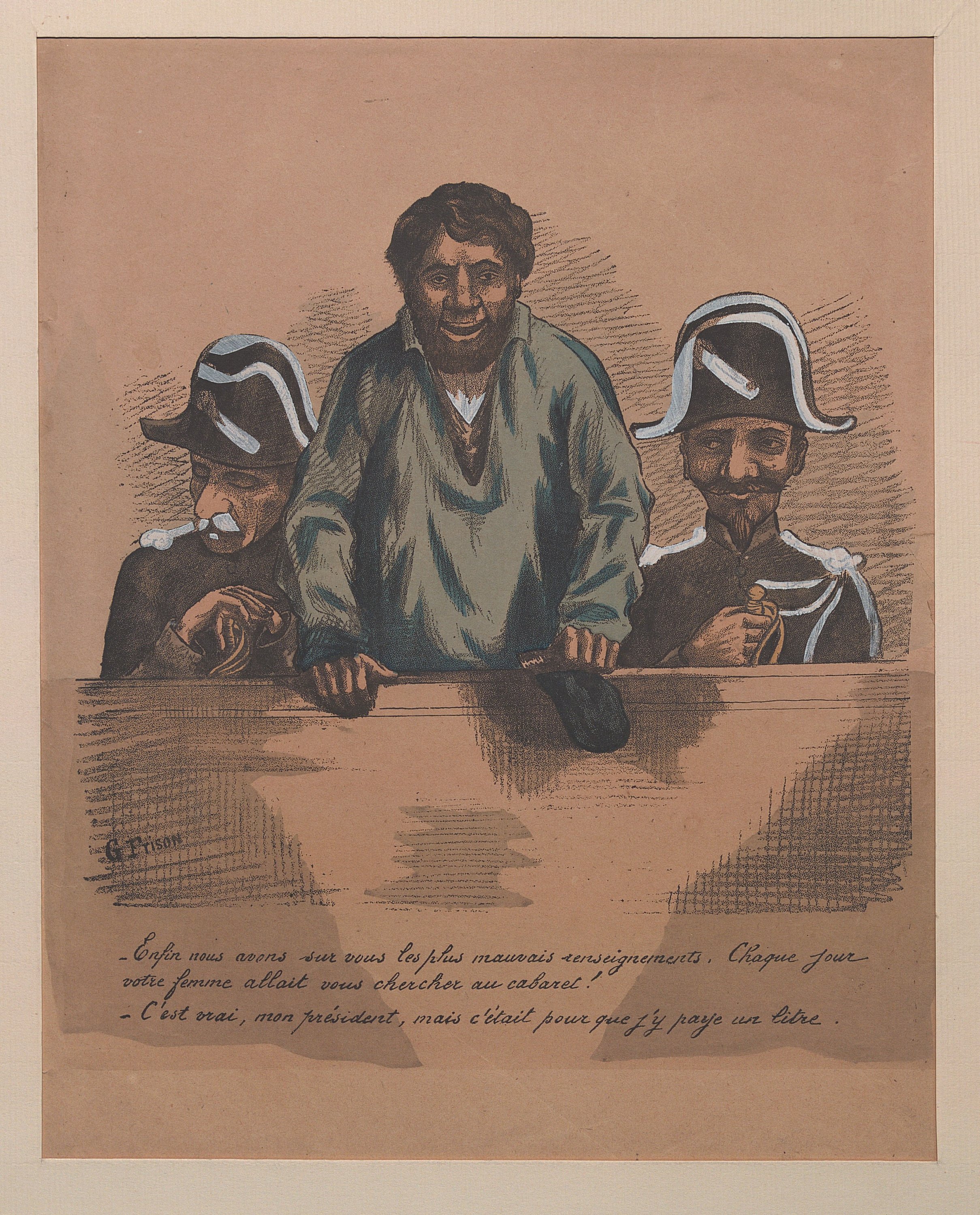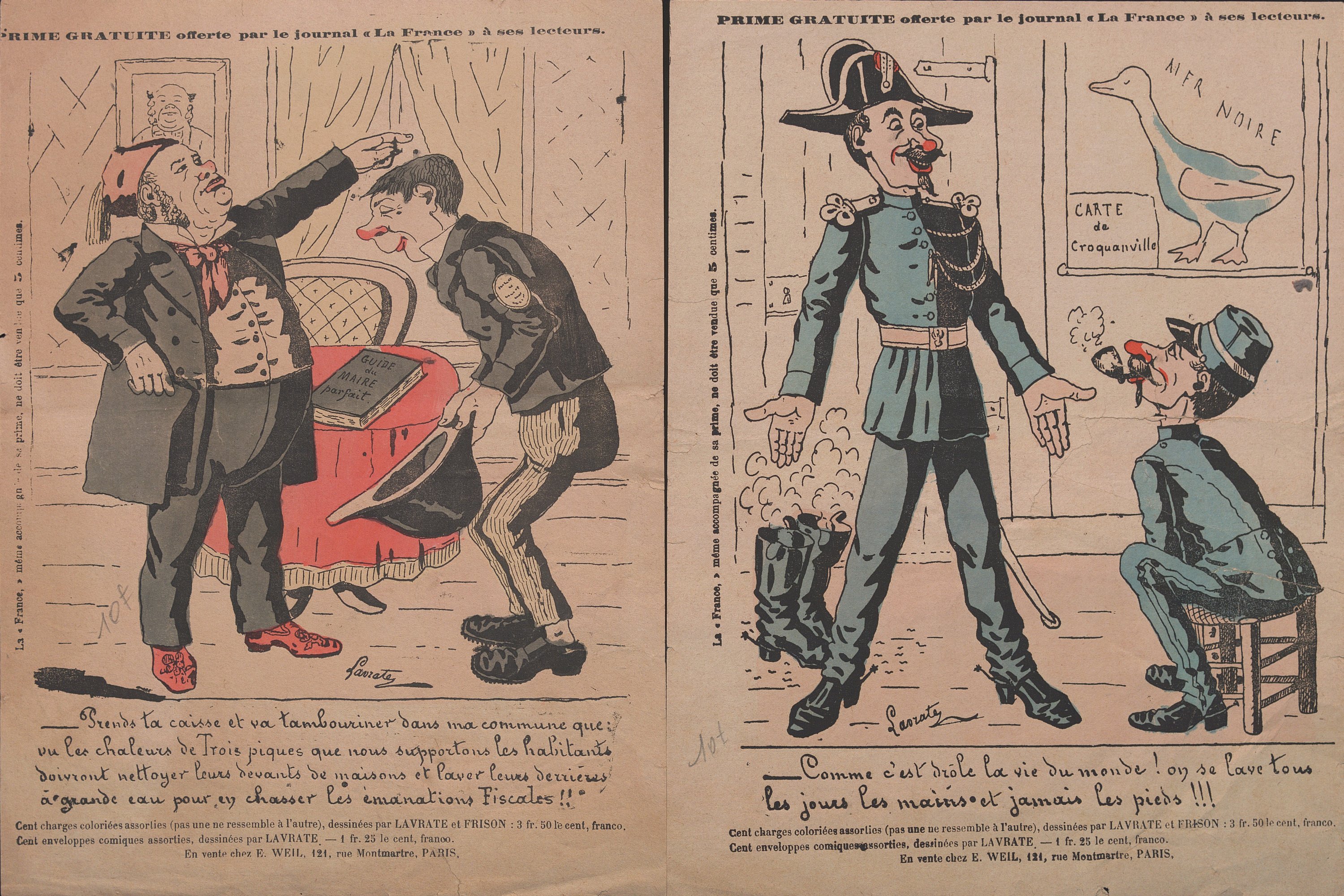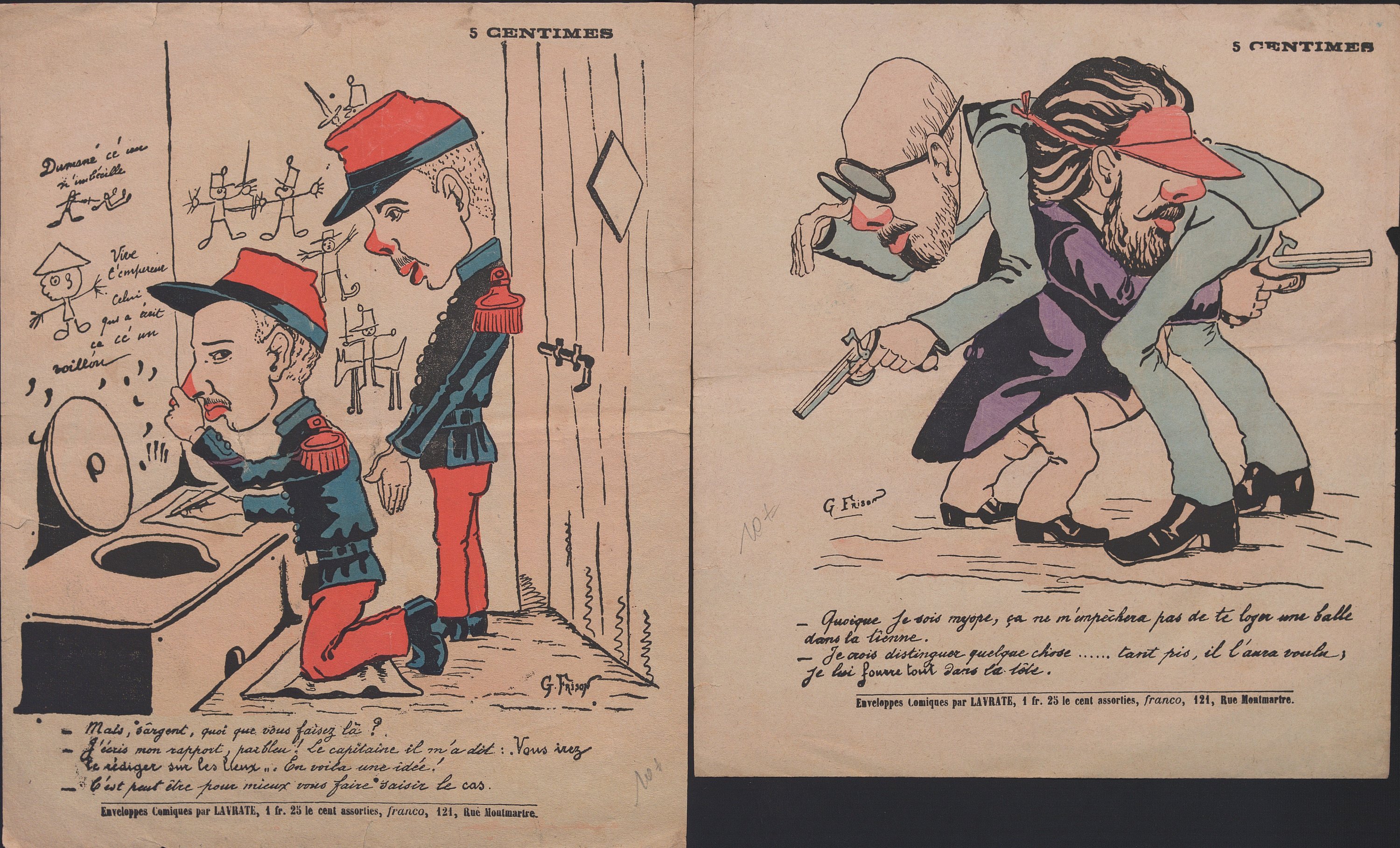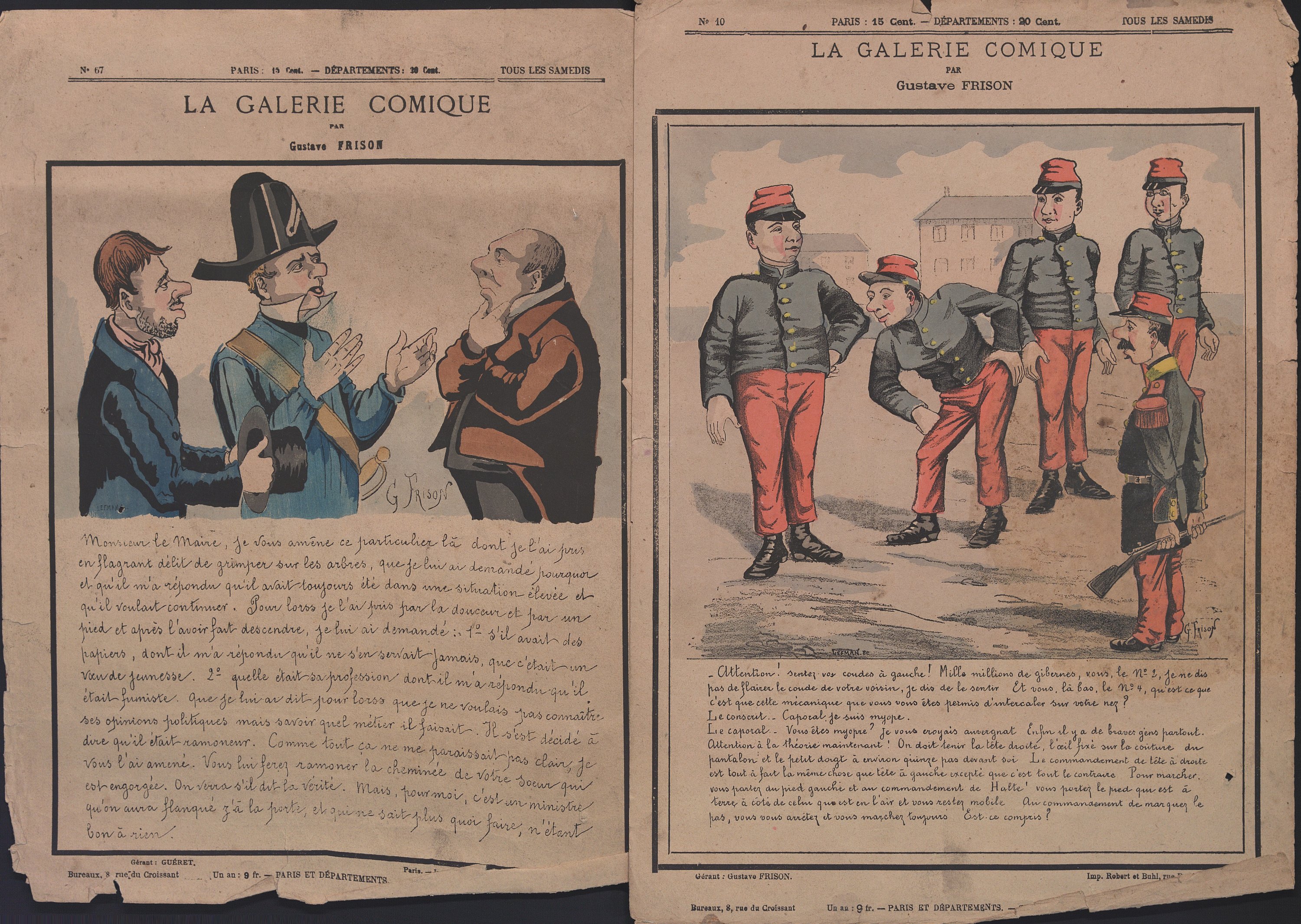 25 ex. par Gustave Frison et 10 ex. par Edmond Lavrate ; scènes de militaires, anticléricales, mariage, justice, etc.