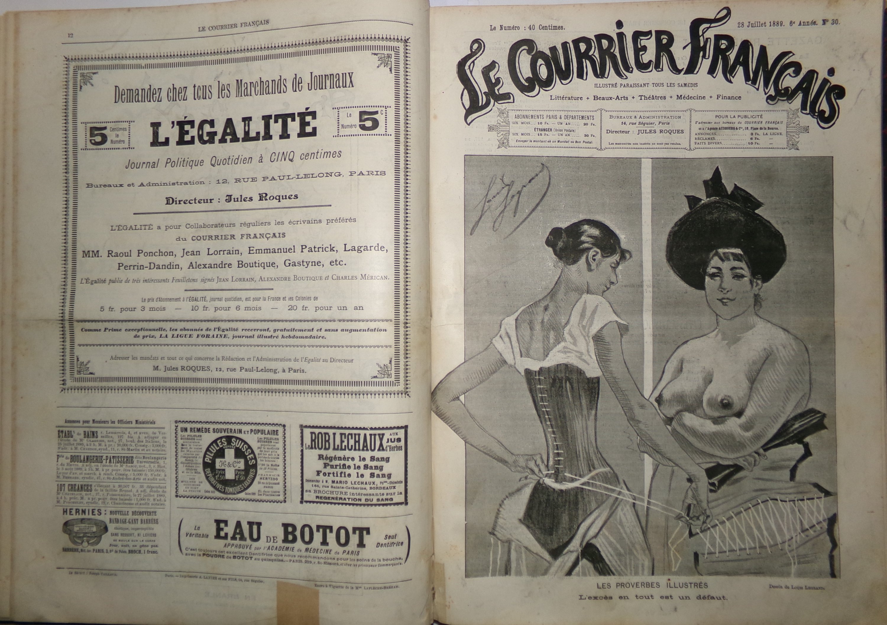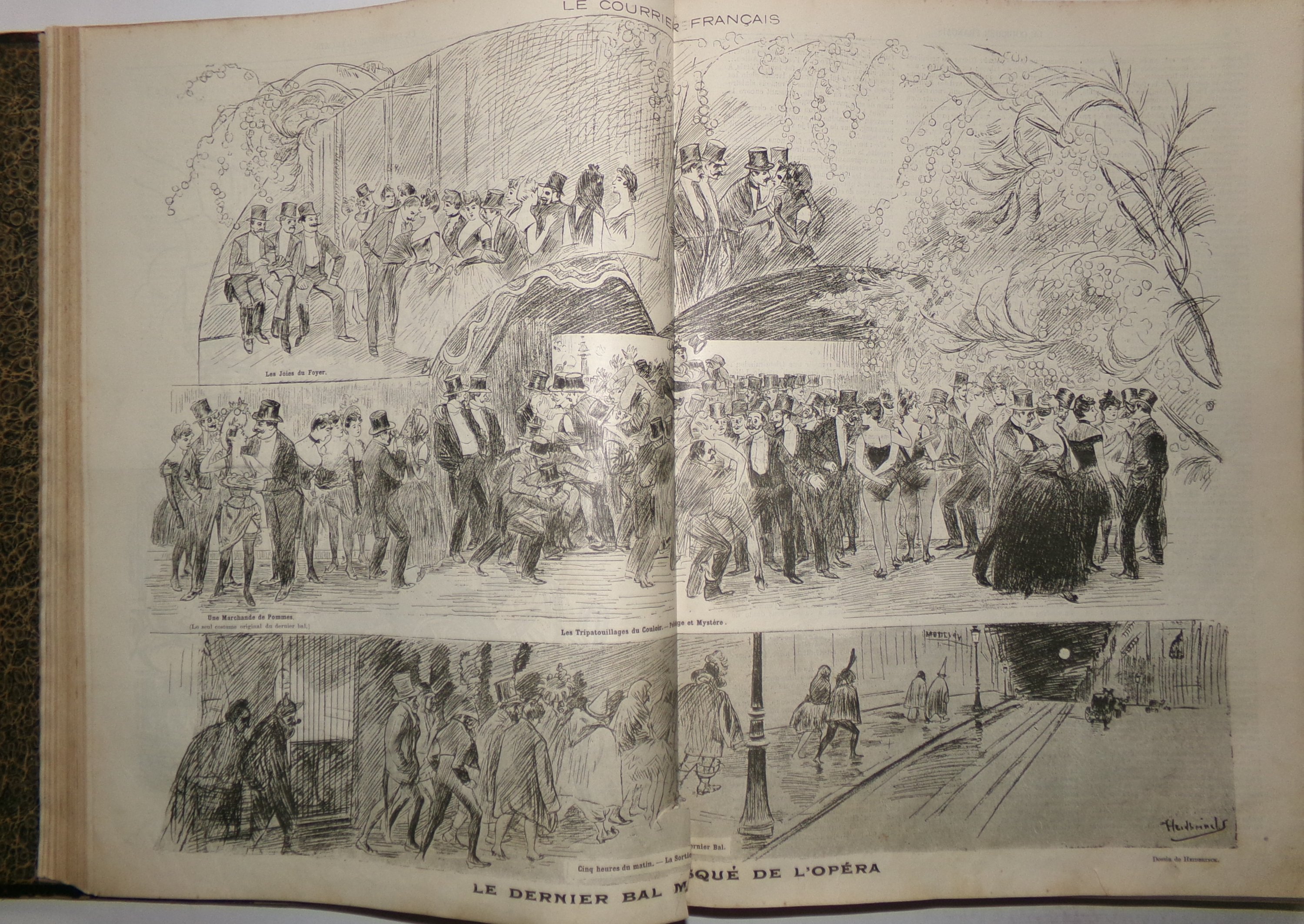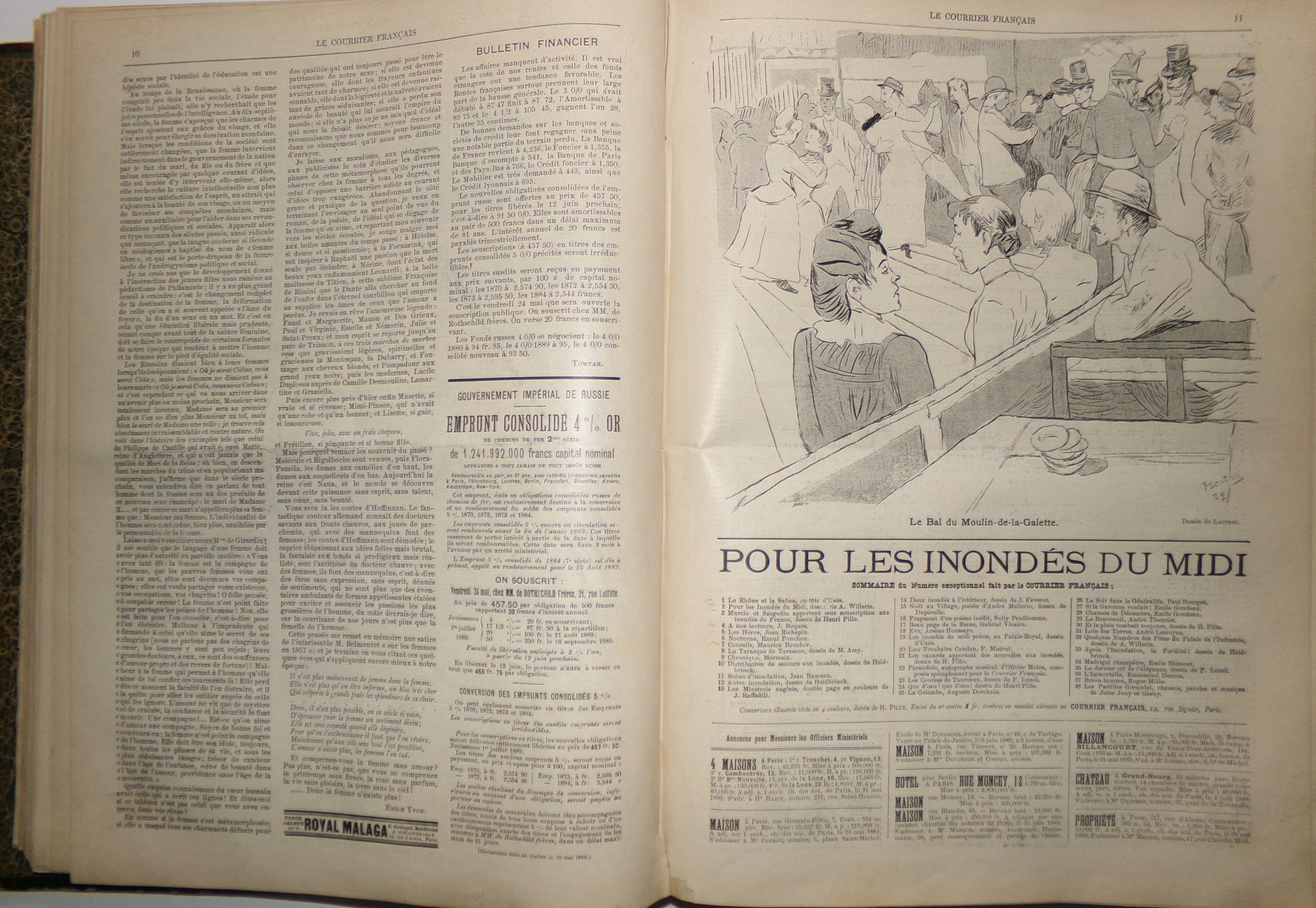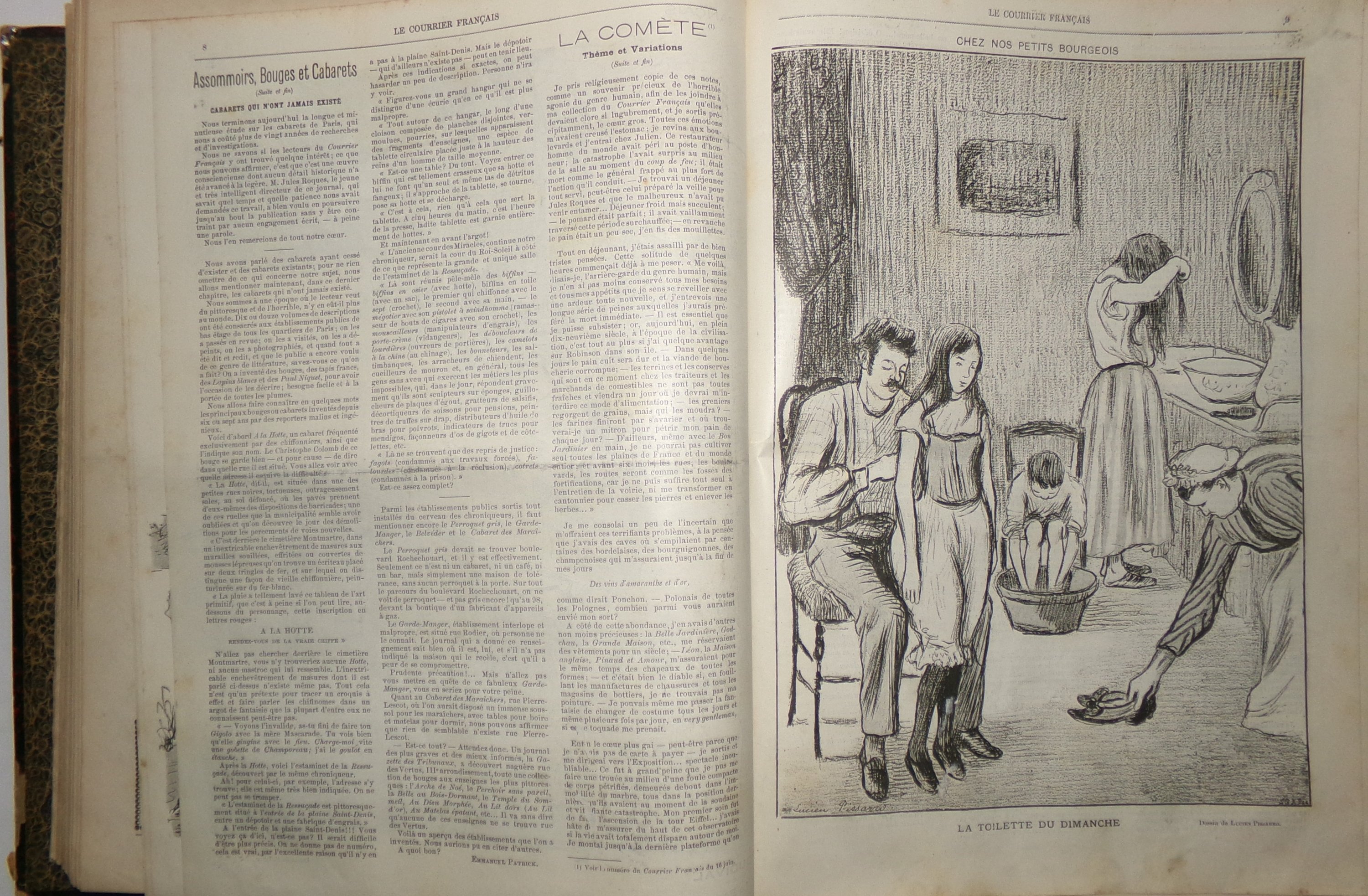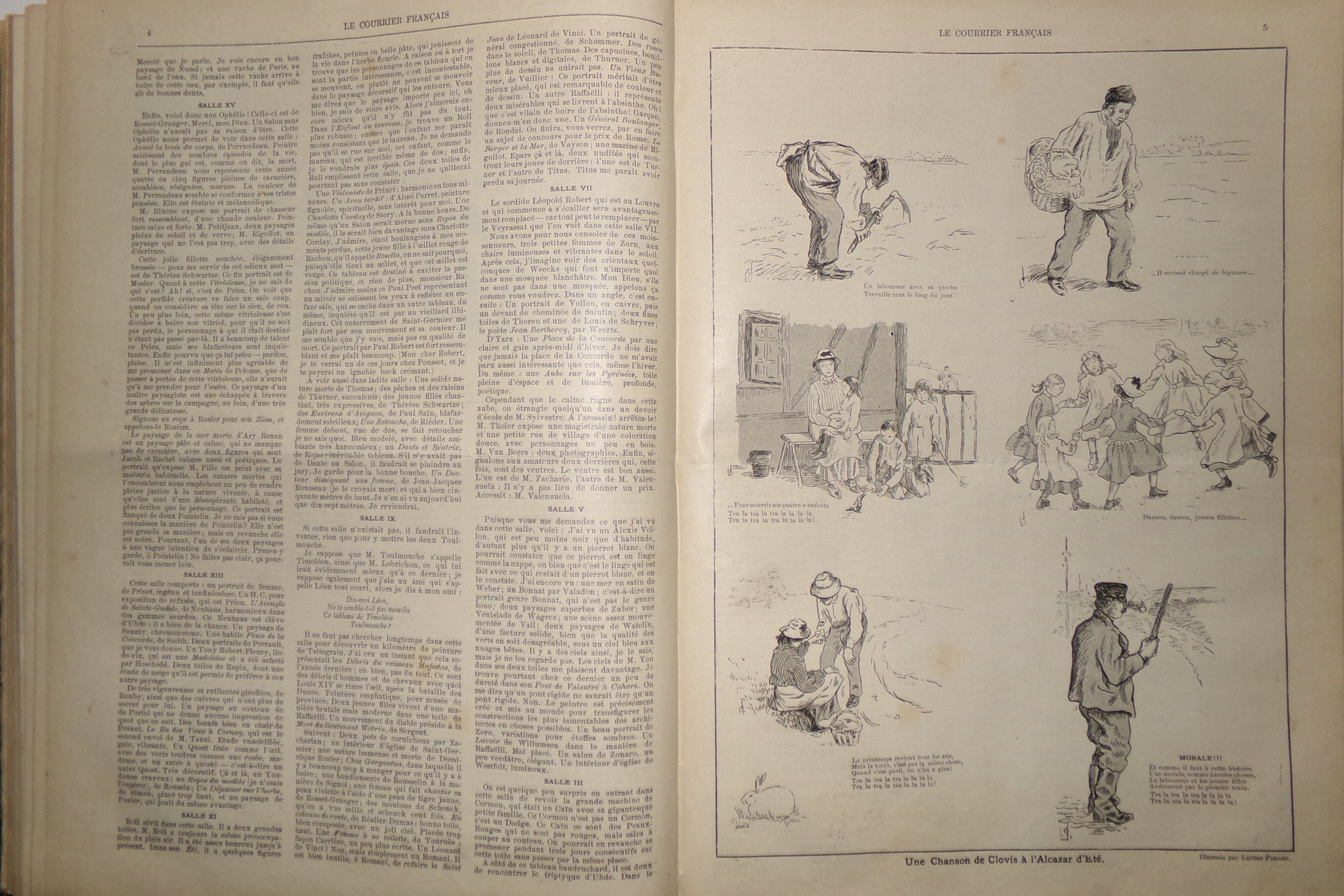 « Fondé par le publicitaire Jules Roques en novembre 1884, Le Courrier Français est un « hebdomadaire illustré humoristique, littéraire et artistique », issus de la sociabilité montmartroise des années 1880. Nous sommes donc au cœur de ce que l’on appelle improprement la « Bohème Montmartroise », même si les bureaux du journal sont au 14 rue Séguier. Sa dimension Montmartroise, outre la géographie de ses lieux d’élection et du séjour de ses auteurs, réside aussi dans les dessins qui évoquent régulièrement la population contrastée de la Butte (artistes, modèles, lingères, bourgeois, employés, ouvriers travaillant sur le chantier du Sacré Cœur), moulins, bals, cabarets artistiques et bouges infâmes, assommoirs, les salles du boulevard Rochechouart, Moulin Rouge et surtout l’Elysée Montmartre. » (Extrait « Le Courrier Français » par Laurent Bihl, 2007)
