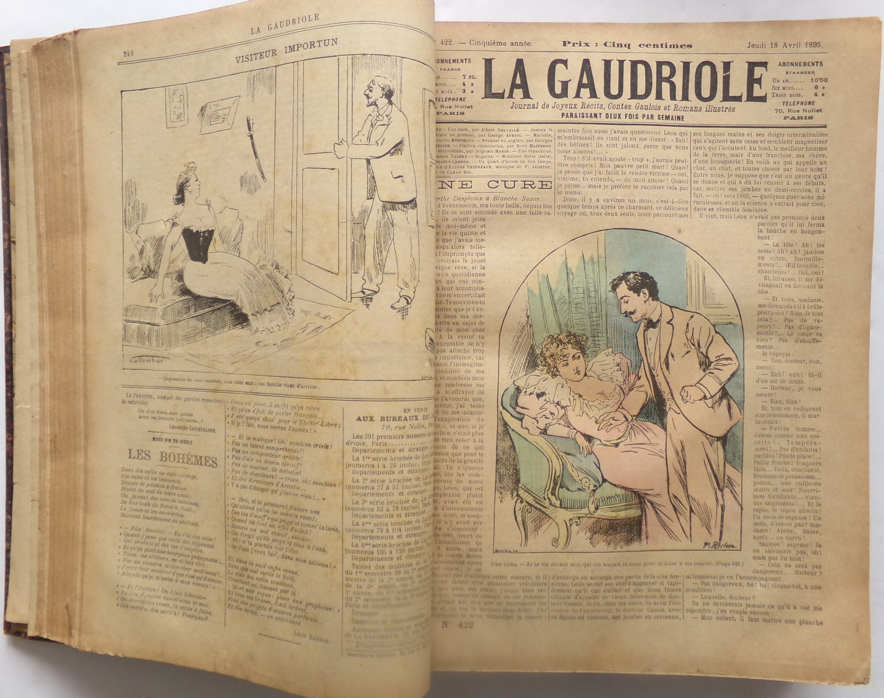 La Gaudriole, journal de joyeux récits, contes gaulois et romans illustrés, 3 vol. in-4 rel. 1 broch., 1891-1901 : n°51 (27 sept. 1891) au n°100 (17 mars 1892), complet ; (1 vol.) n°392 (3 janv. 1895) au n°600 (31 déc. 1896), incomplet ; (1 vol.) n°809 (1er janv. 1899) au n°913 (31 déc. 1899), complet ; n°1018 (3 janv. 1901) au n°1121 (29 déc. 1901), complet ;