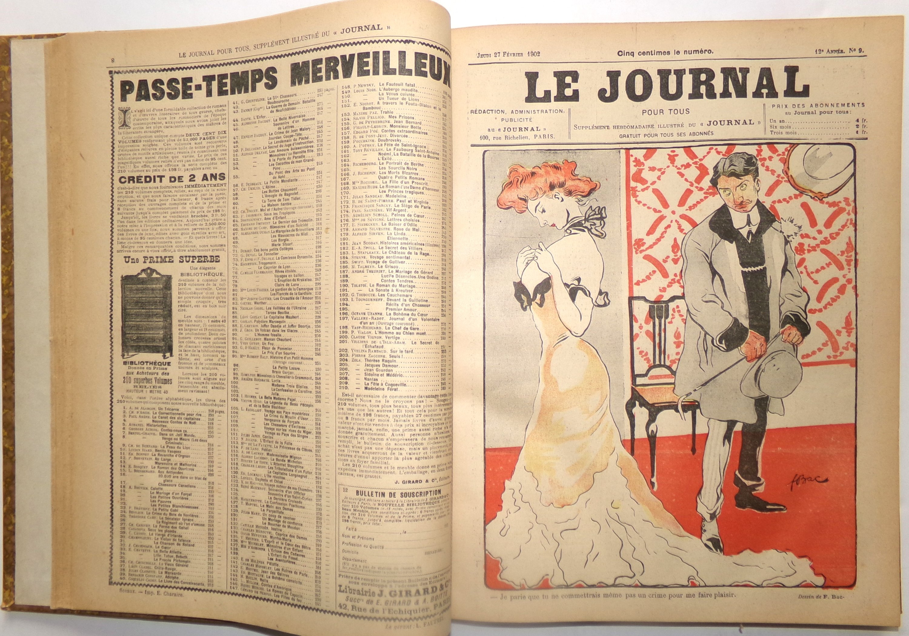 Le Journal pour tous, hebdomadaire illustré, 2 vol. in-4 rel. : (1 vol.) n°1 (17 janv. 1901) au n°50 (26 déc. 1901), complet ; (1 vol.) n°1 (2 janv.1902) au n°52 (25 déc. 1902) (mque 15) Ill. de Gottlob, Radiguet, Benjamin Rabier, Ferdinand Bac, Edouard Bernard, Guydo, d’Ostoya, Poulbot, Weiluc, etc.