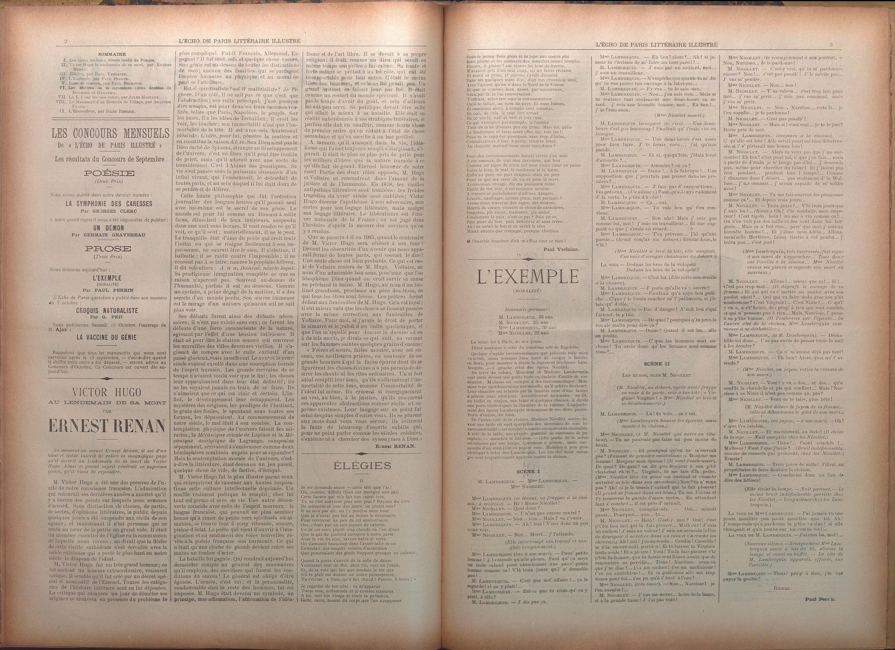 1 vol. grand in-4 rel. ½ toile contenant n°1 (31 janv. 1892) au n° 79 (6 août 1893), tête de collection complète de cette revue codirigée par Marcel Schwob et Catulle Mendès, dans laquelle est publiée notamment les textes littéraires (proses et poésies) des gagnants du concours littéraire organisé en octobre 1892. Entr’autres ceux d’Henri Barbusse mais surtout les premiers textes d’Alfred Jarry où apparaît le père Ubu et le terme de pataphysique pour la première fois. Jarry remporte trois fois de suite ce concours, deux pour le prix de prose (« Guignol » paru le 28 avril 1893 ; « Lieds funêbres » paru le 25 juin 1893) et un pour le prix de poésie (« La régularité de la châsse »). Ainsi lancé dans le milieu littéraire, le jeune auteur présente en 1894 chez Alfred Valette directeur du Mercure de France et sa femme Rachilde, une pièce intitulée Ubu Roi. La pièce fut jouée ensuite pour la première fois, le 10 décembre 1896, au Théâtre de l’Œuvre.