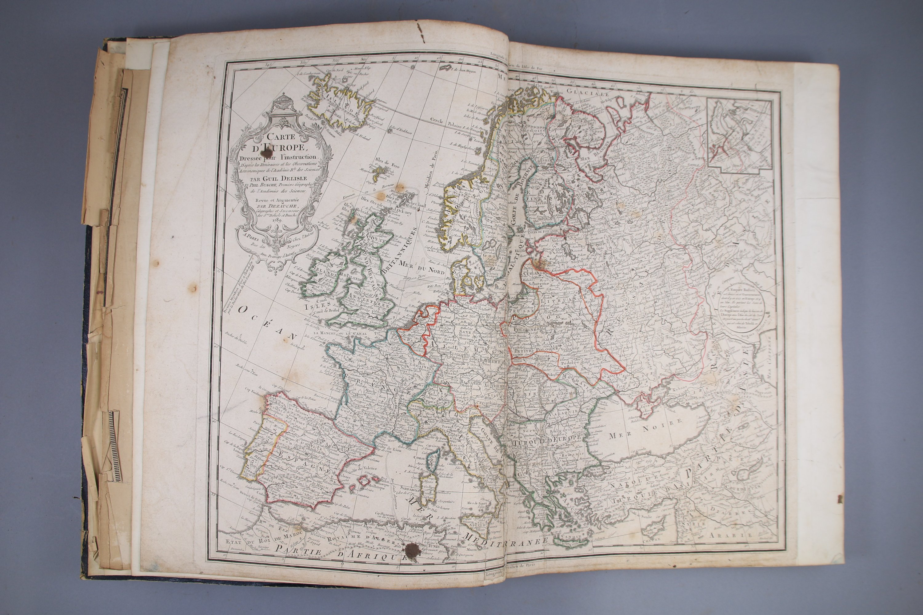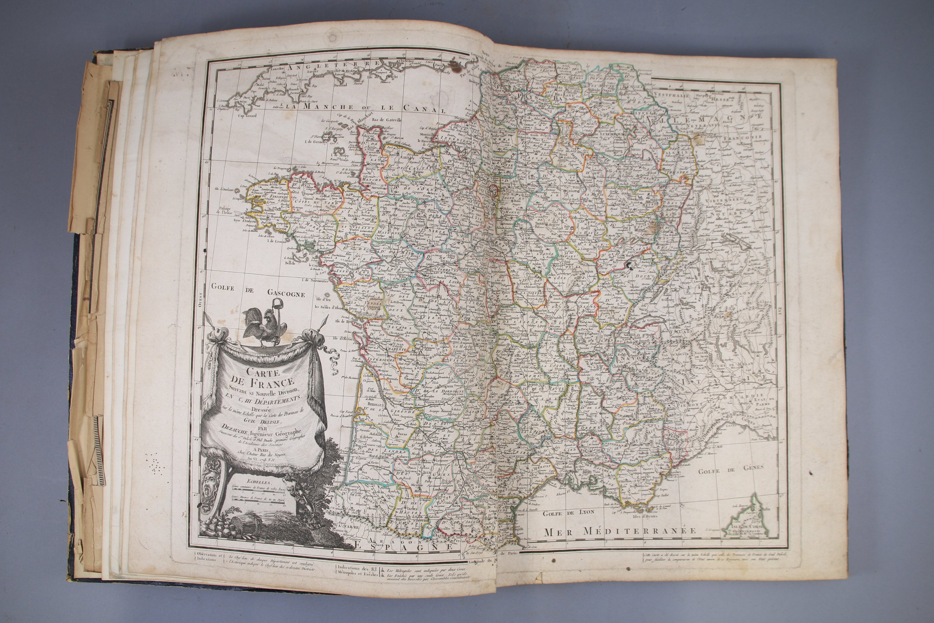 Recueil factice grand in-folio (550 X 375 mm) de 35 cartes géographiques XVIIIème, en coloris du temps, la plupart tirées par Dezauche. Les cartes ont été encollées au recto des feuilles ouvertes, mesurant donc environ 550 X 750 mm.