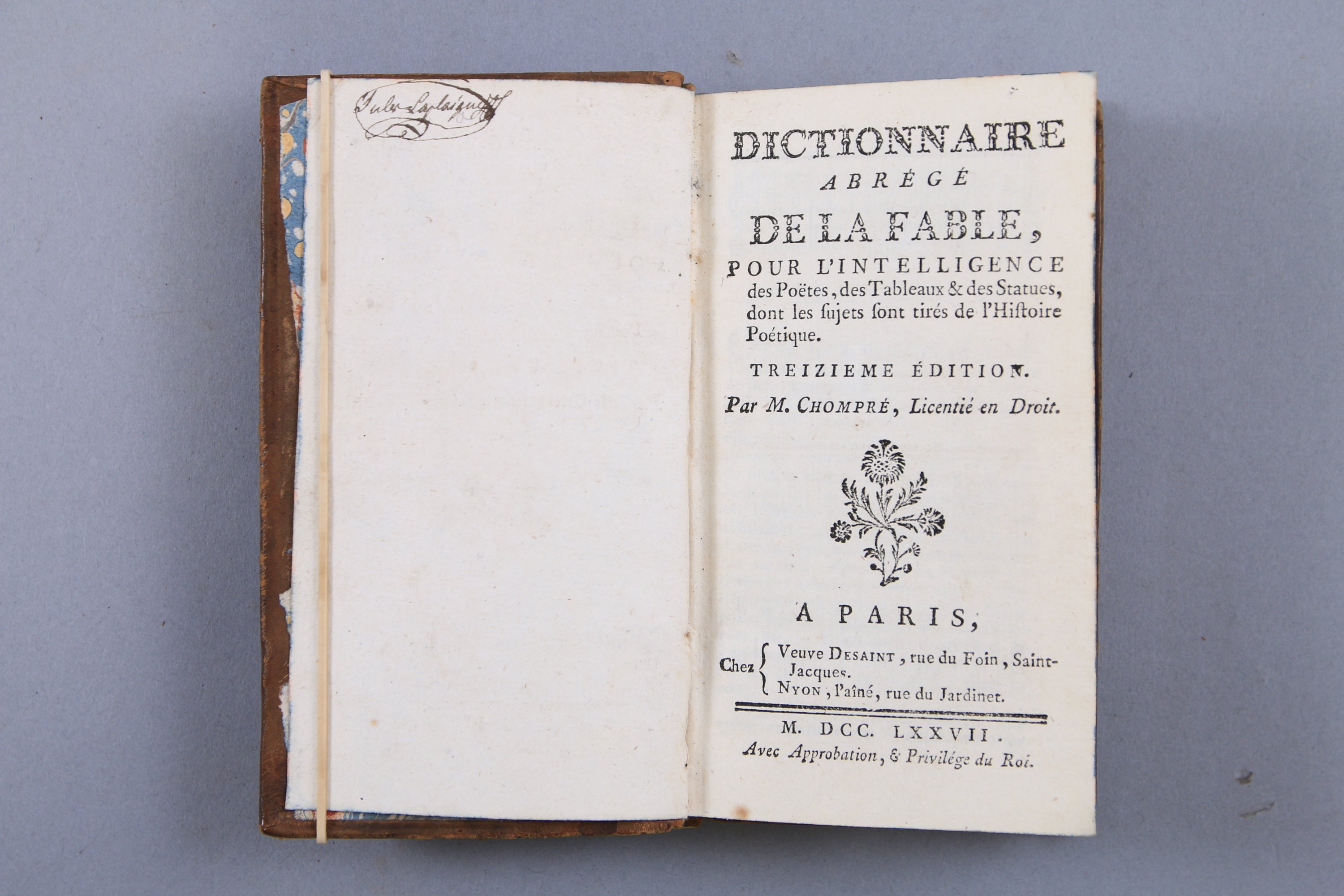 -Chompré : Dictionnaire de la Fable, Paris, Veuve Desaint et Nyon, 1777. In-12. Veau du temps.