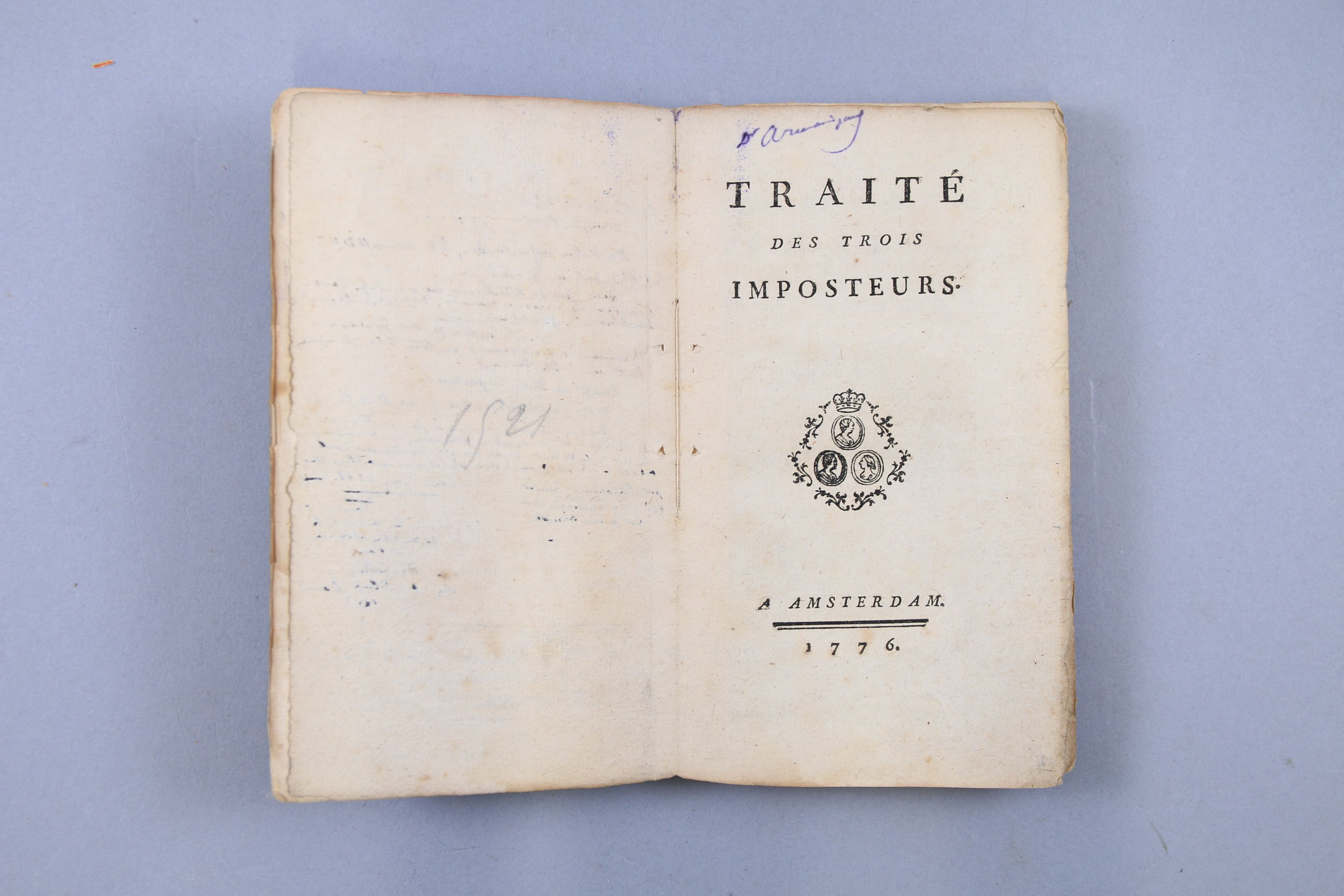 - [SPINOZA]. Traité des trois imposteurs, Amsterdam, 1776, in-12 ;