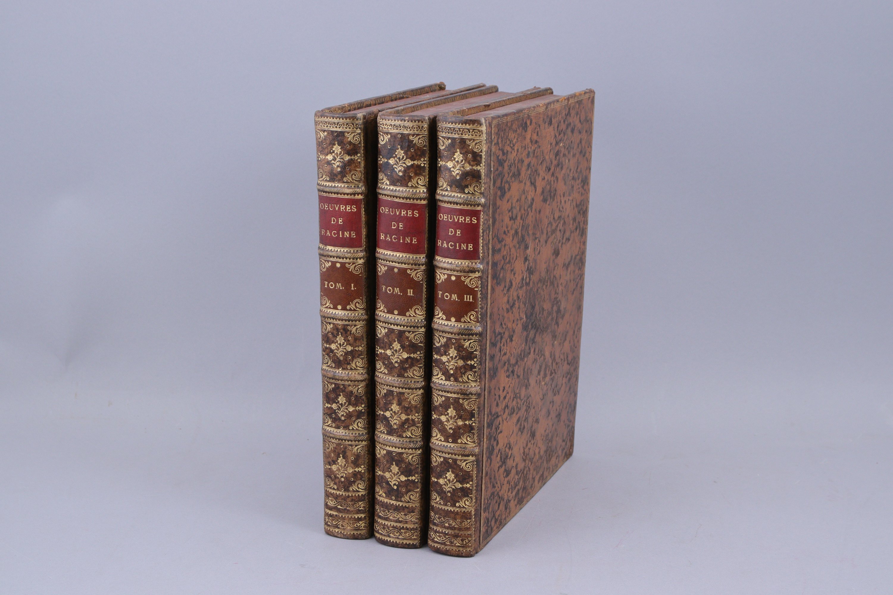 3 volumes grand in-4° (290 X 215 mm). XVIII, (6) et 414 pages ; IV et 447 pages ; IV et 412 pages.Plein veau raciné ; triple filet d'encadrement. Dos à 5 nerfs, orné de fleurons dans les caissons, et de fines guillochures sur les nerfs. Gardes d'origine en papier marbré. Tranches rouges. (Les dos sont des dos pastiches, parfaitement établis par un excellent restaurateur.) .