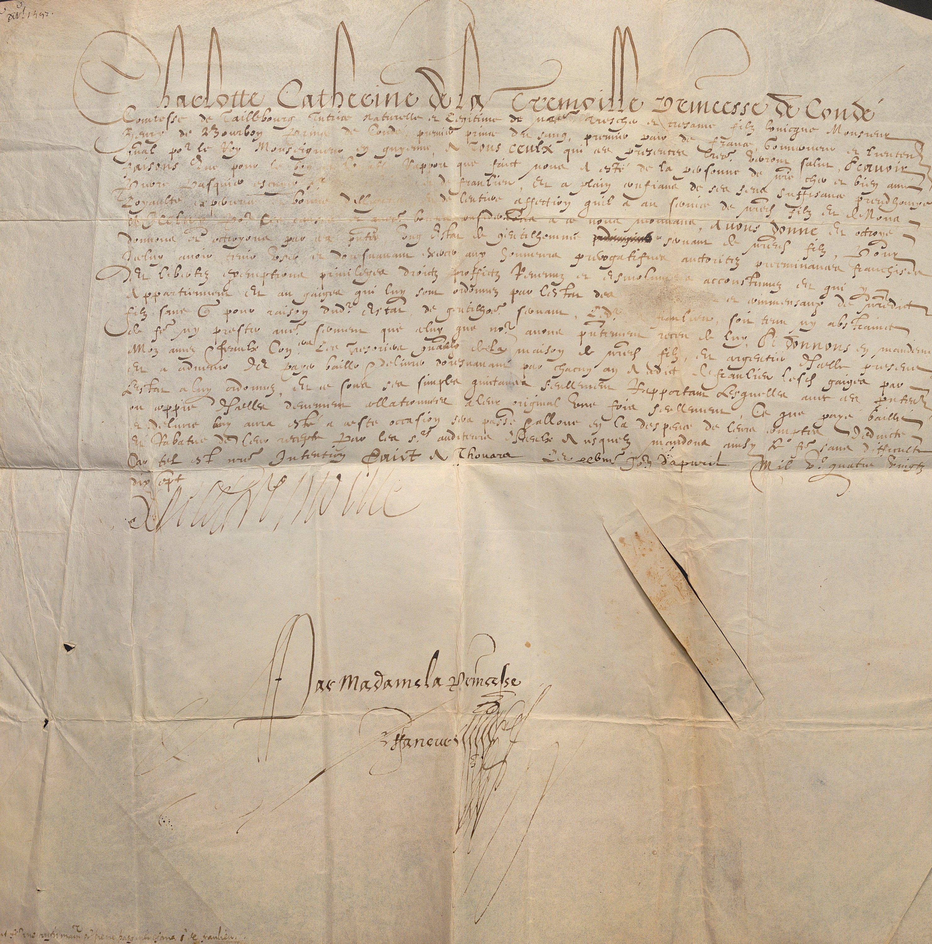 P.A.S., Thouars, 28 avril 1597, Charlotte-Catherine de la Trémoille (1565-1629), princesse de Condé (1565-1629), fille de Louis III de La Trémoille, épouse en 1583 d’Henri Ier de Bourbon prince de Condé (1552-1588), tutrice de son fils unique Henri de Bourbon prince de Condé, premier prince du sang ; brevet de l’état de gentilhomme de la maison de Condé accordé à Pierre Pasquier de Franclieu, écuyer, sieur de Villaines, parchemin, 34 x 34 cm ;
