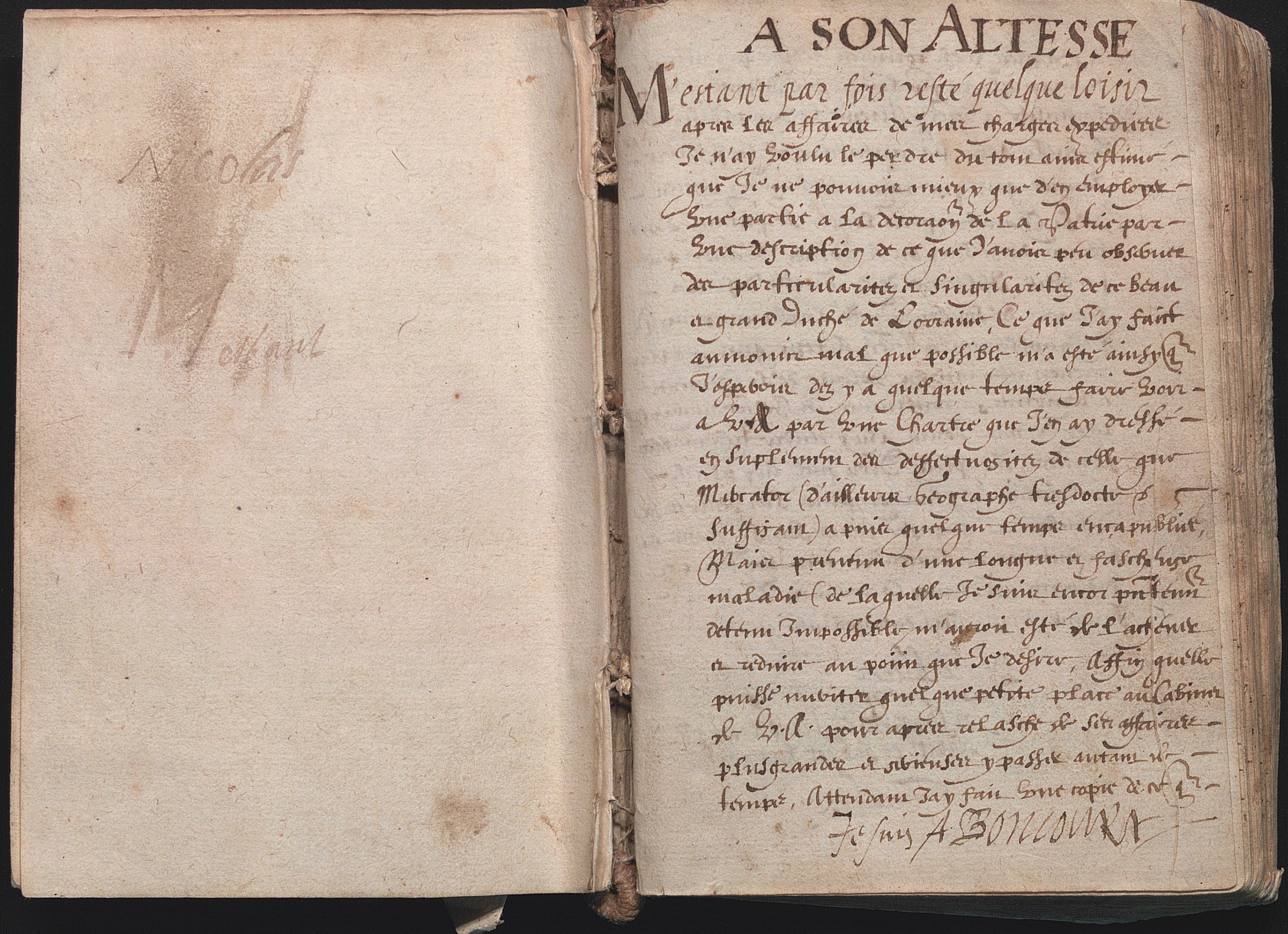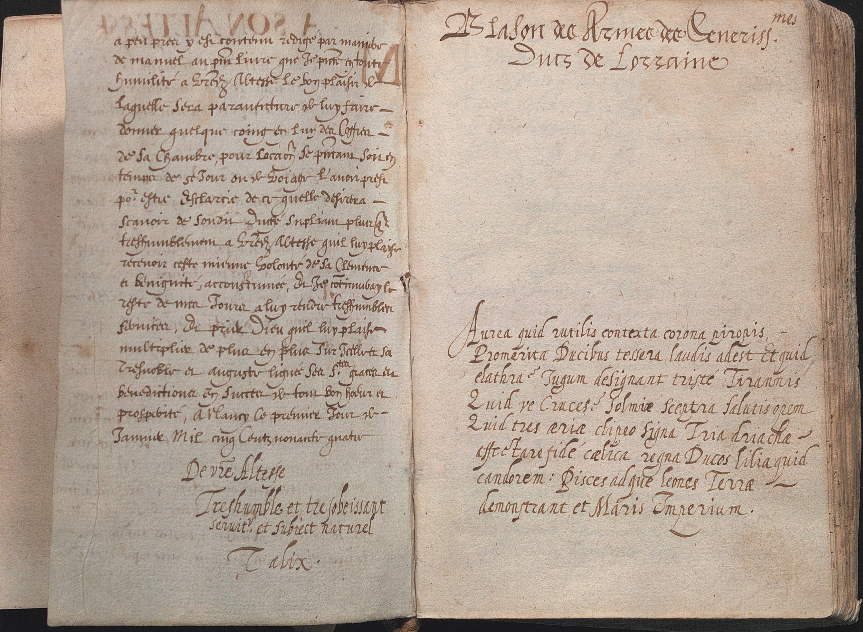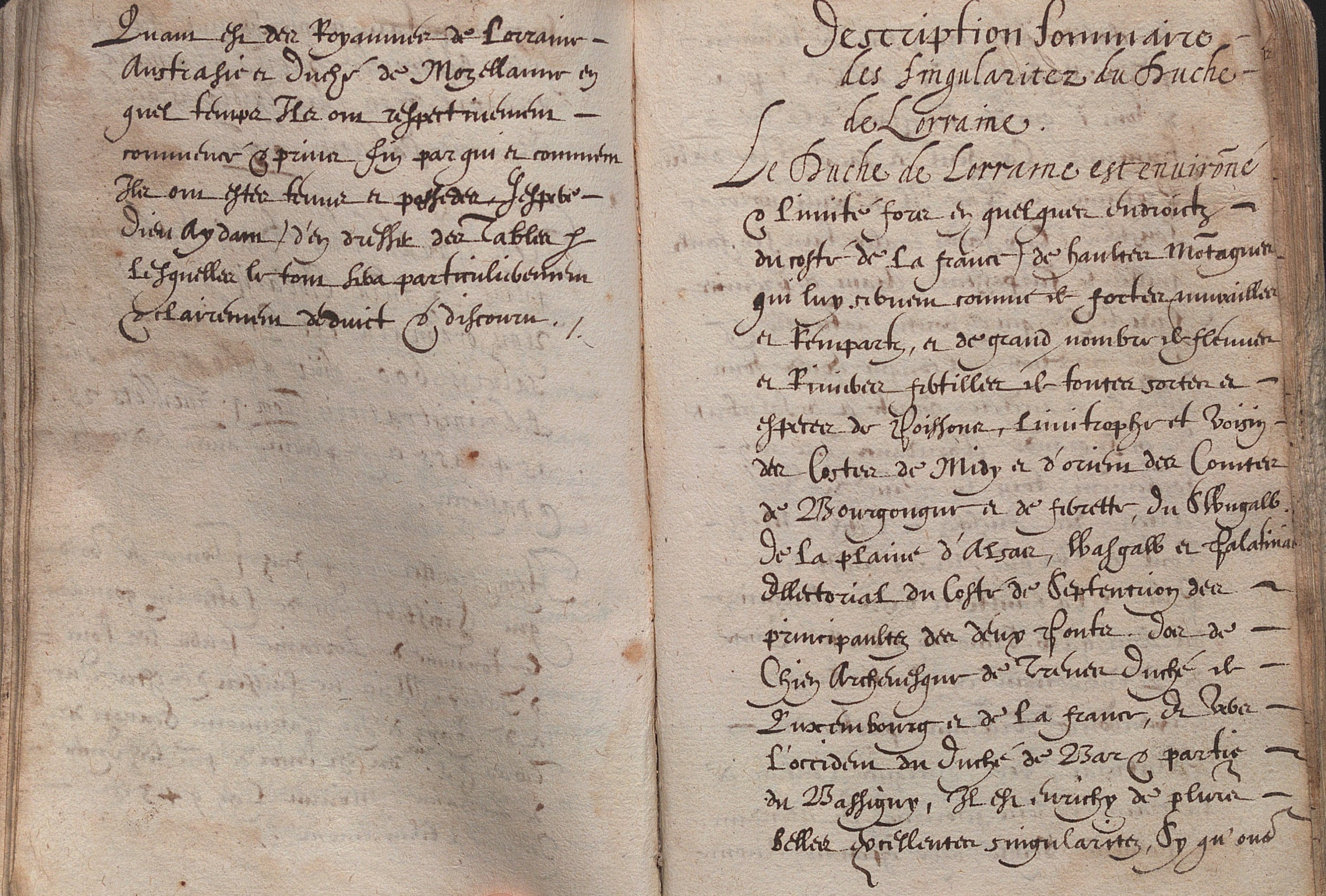 Copie manuscrite à la plume, papier vergé, 234 pp. in-12, fin du 16e - 1ère moitié du 17e siècle ; comprenant les parties : Epilogue à la louange du duché de Lorraine Blason des armes des sérénissimes ducs de Lorraine Epitre dédicatoire Discours de l’antiquité et origine du duché de Lorraine Description sommaire des singularités du duché de Lorraine De quelles provinces et bailliages est composé le duché de Lorraine avec le dénombrement des villes, bourgs, châteaux et village, rangés respectivement sous leurs bailliages, châtellenies et prévôtés Lorraine et païs adjacents.