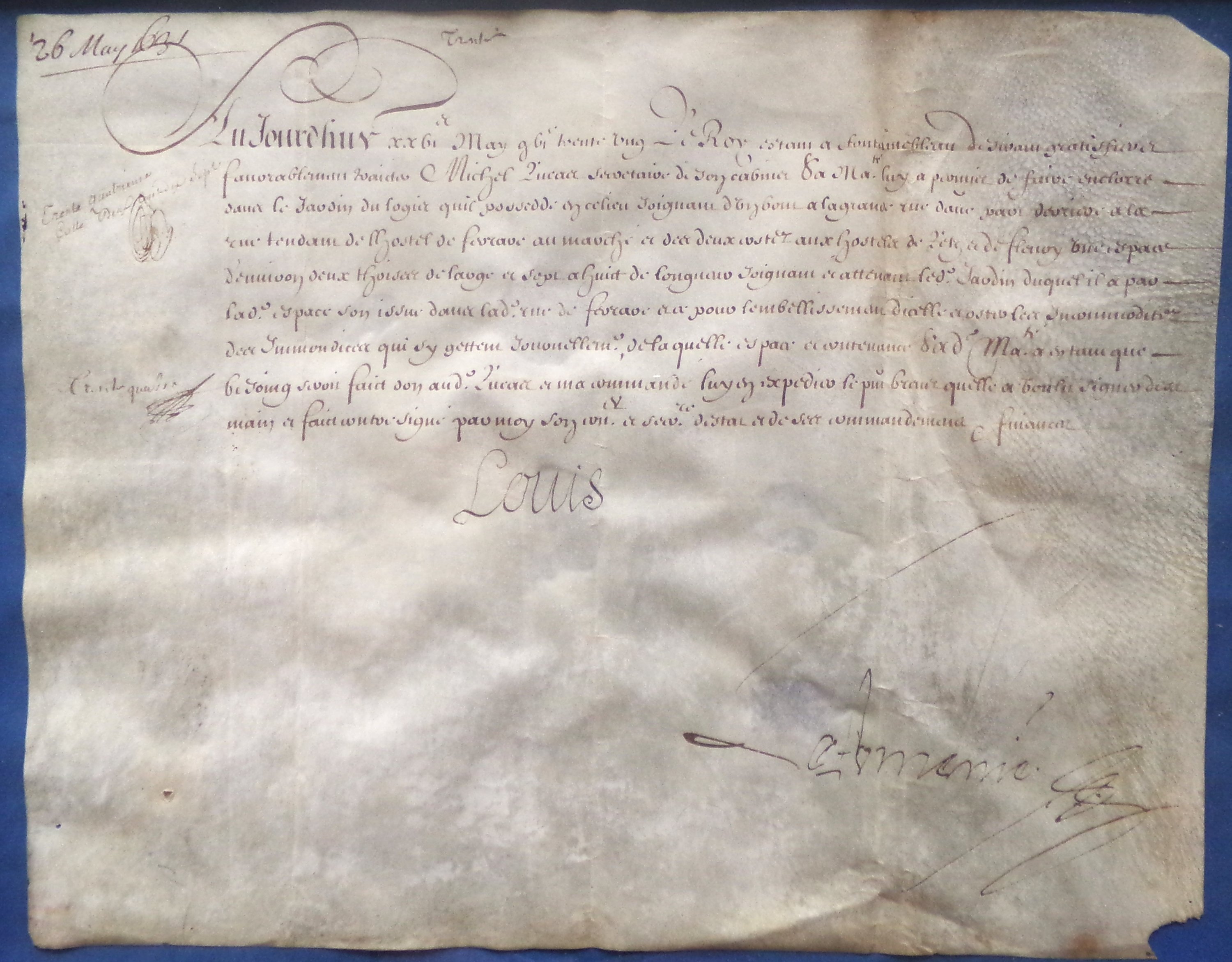 P.S. « Louis », Fontainebleau, 26 mai 1631, contresignée par Antoine de Loménie de la Ville-aux-Clercs, ministre en charge de la maison du roi, 24,5 x 30,5 cm, sous cadre ; commandement de gratification accordée par Louis XIII à Michel Lucas, secrétaire du cabinet du roi : « désirant gratifier favorablement traiter Michel Lucas secrétaire de son cabinet Sa Majesté lui a permis de faire enclore dans le jardin du logis qu’il possède en ce lieu joignant d’un bout à la grande rue d’une part, par derrière à la rue tendant de l’hôtel de Ferrare au marché et des deux côtes aux hôtels de Retz et de Fleury, un espace d’environ deux toises de large et sept à huit de longueur joignant et attenant ledit jardin duquel il a par ledit espace son issue dans la rue de Ferrare et a pour l’embellissement d’icelle à ôter les incommodités des immondices qui s’y jettent journellement ( ) brevet qu’elle a voulu signer de sa main et fait contresigné par moi son conseiller et secrétaire d’état »
