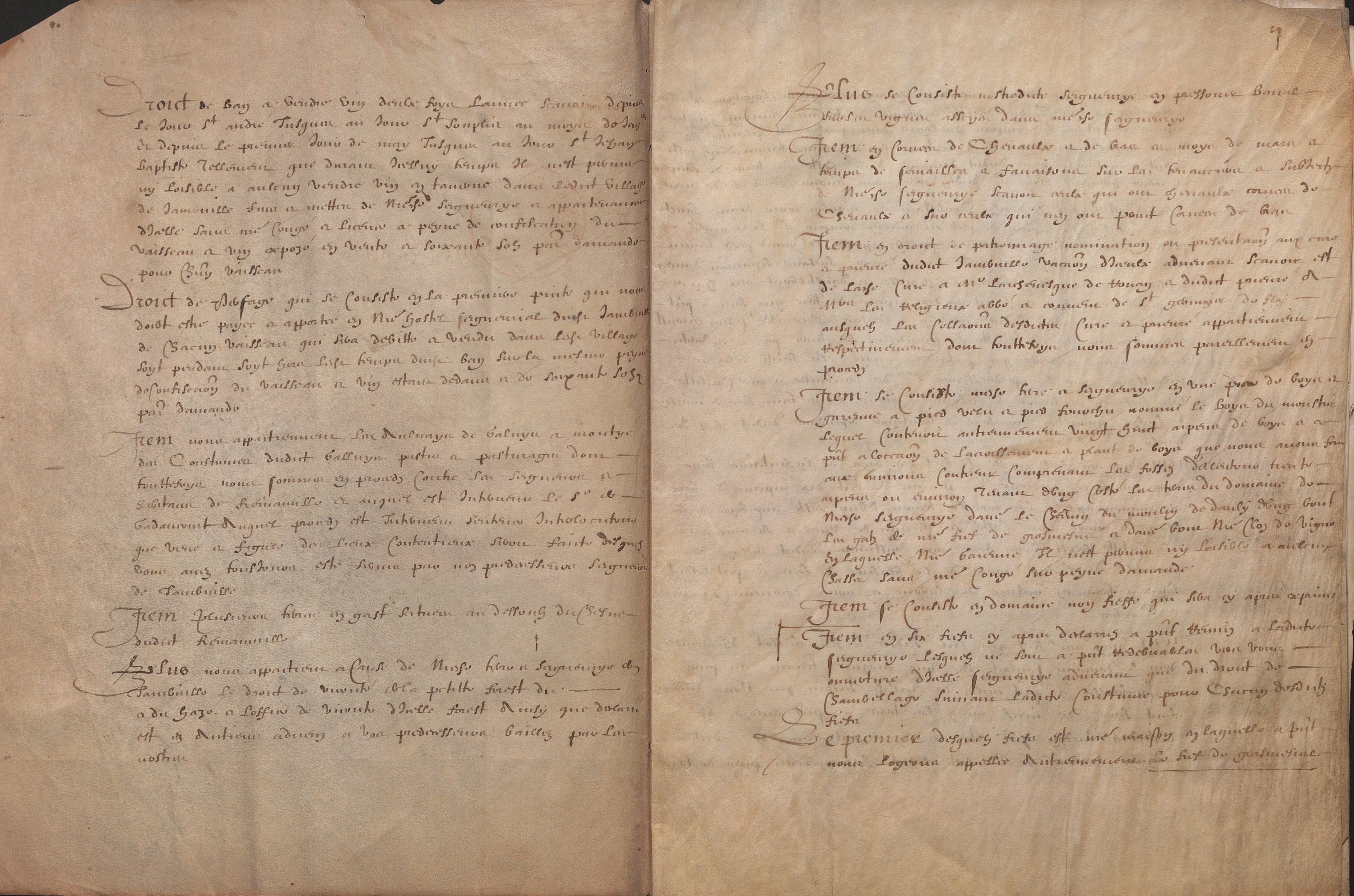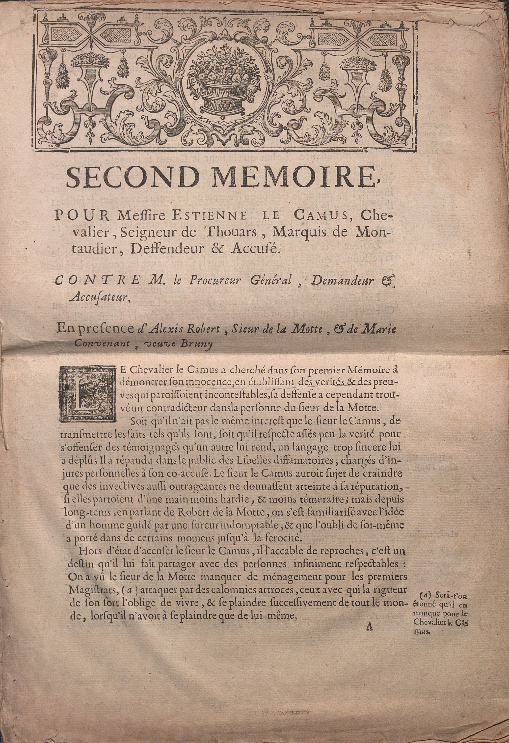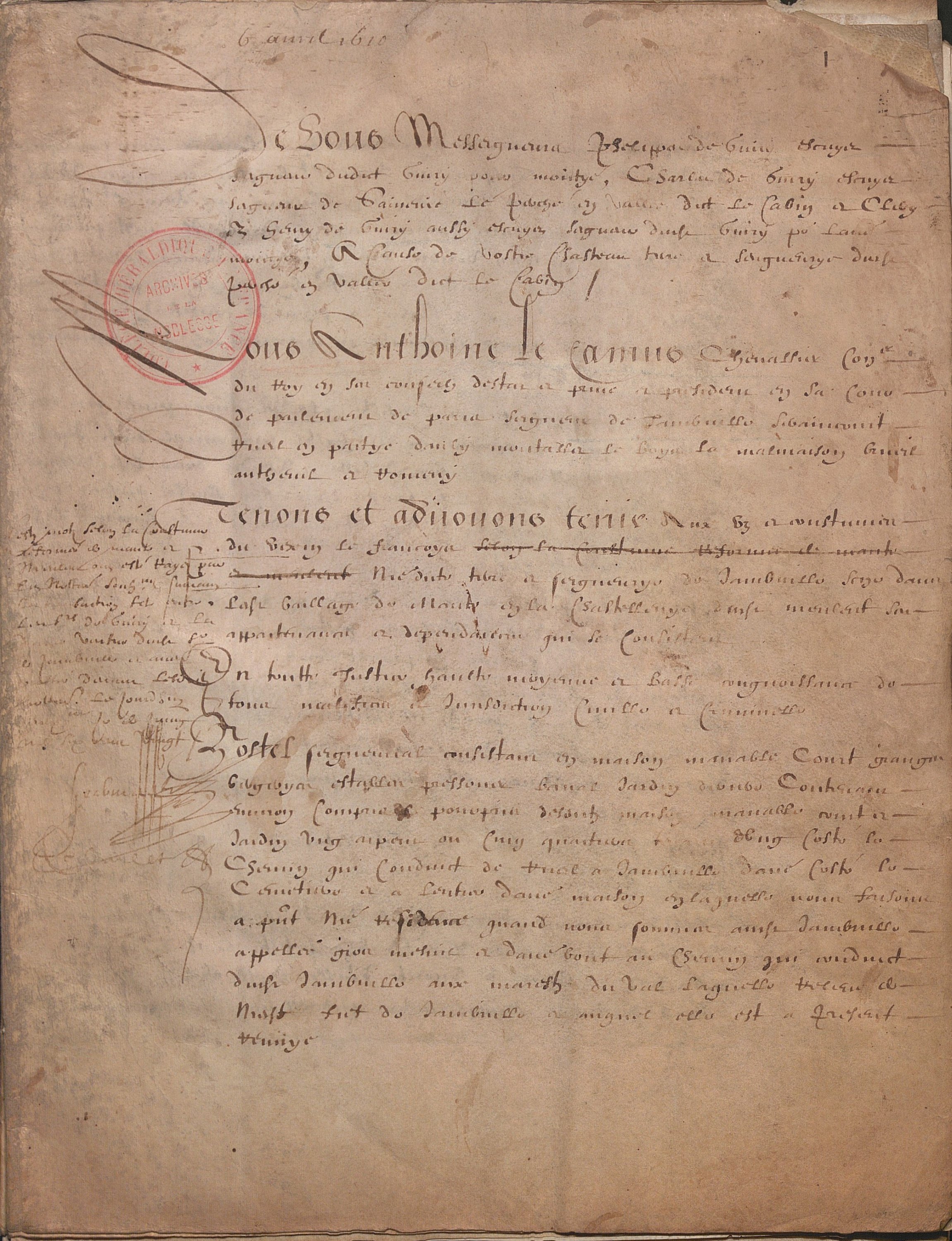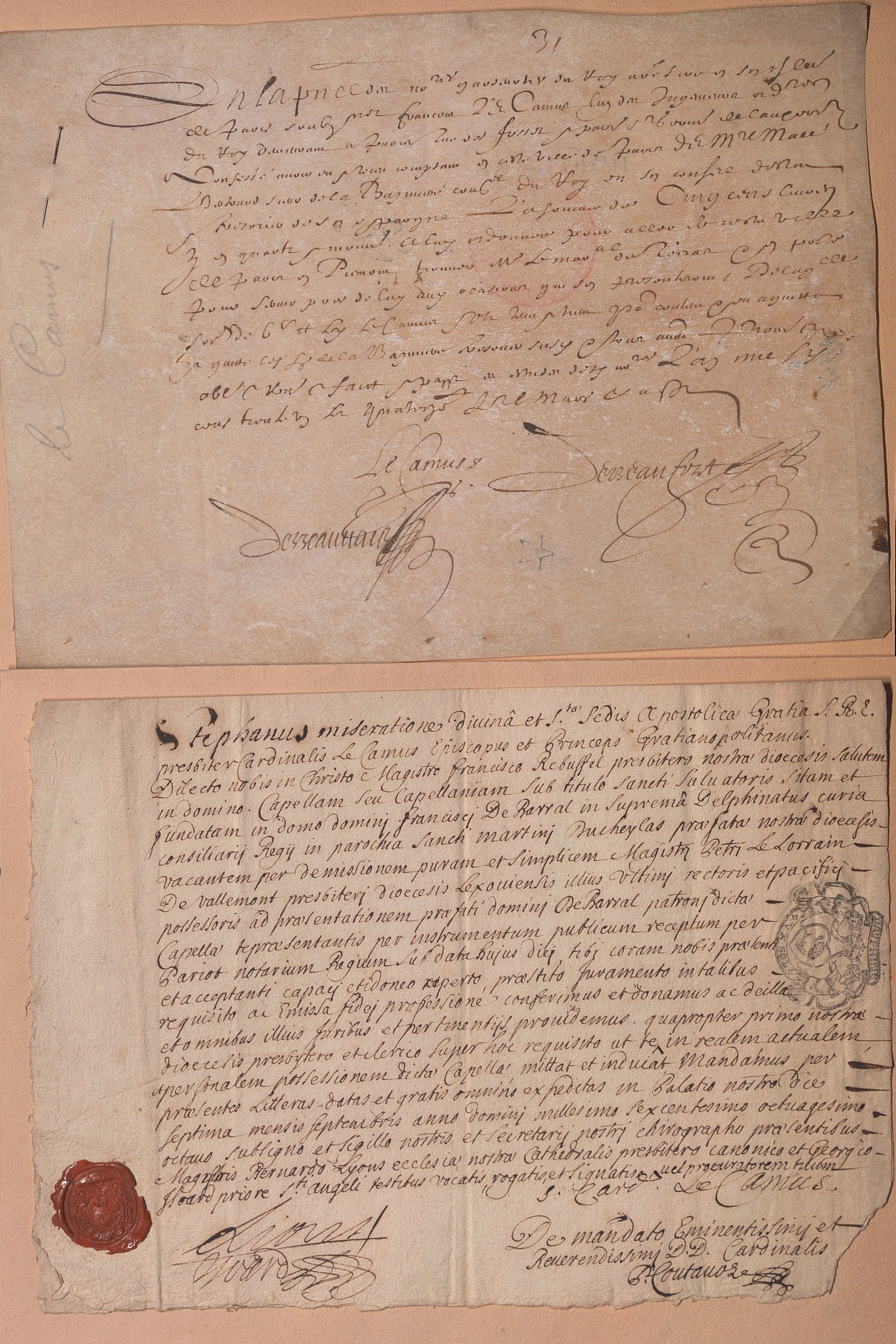 1 classeur contenant 20 pièces manuscrites et imprimées, parchemin et papier, formats divers, 15e siècle - 18e siècle, relatives à des membres de la famille Le Camus, originaire de la région parisienne, la plupart officiers du roi, dont : Aveu féodal, 1er mars 1478, rendu par Thomas Le Camus à noble et puissant seigneur Guillaume de Bigars de la Londe ; Procuration faite par Antoine Le Camus chevalier conseiller d’état du roi seigneur de Jambville (1602) ; Quittance reçue par Nicolas Le Camus, notaire du roi et scripteur de l’Université de Paris (1605) ; Aveu rendu par Antoine Le Camus chevalier conseiller du roi et président en la cour de parlement de sa seigneurie de Jambville Séraincourt avec description du domaine seigneurial et des tenanciers (1610) ; Quittance, Paris, 14 mars 1631, de 500 livres reçues par François Le Camus l’un des ingénieurs ordinaires du roi pour son voyage de Paris à Mantoue au Piémont auprès de Jean de Saint Bonnet de Toiras, maréchal de France ; Quittance reçue par Marie de Rubentel veuve Henri Le Camus seigneur de Romainville (1637) ; Quittance, Saint Germain en Laye, 2 mars 1649, de 700 livres reçues par Jean Le Camus « à la cour et suite de Sa Majesté » « pour ses frais et dépenses de voyages faits de Saint Germain en Laye à Nancy, delà à Saint Dyé et à Badonvilliers » ; Quittance reçue par André Gérard Le Camus chevalier conseiller ordinaire du roi et secrétaire de Colbert (1650) ; 2 quittances reçues par Nicolas Le Camus procureur général puis président de la cour des aydes (1652, 1677) ; Nomination d’un chapelain, 7 septembre 1688, signée par Etienne Le Camus (1632-1707), évêque de Grenoble puis cardinal en 1686, beau cachet de cire rouge ; 2 quittances reçues par Jean Le Camus, lieutenant de la prévôté et vicomté de Paris (1689 et 1693) ; Mémoire imprimé concernant le procès contre Etienne Le Camus, chevalier seigneur de Thouars marquis de Montaudier, accusé de rapt (1734) ; etc.