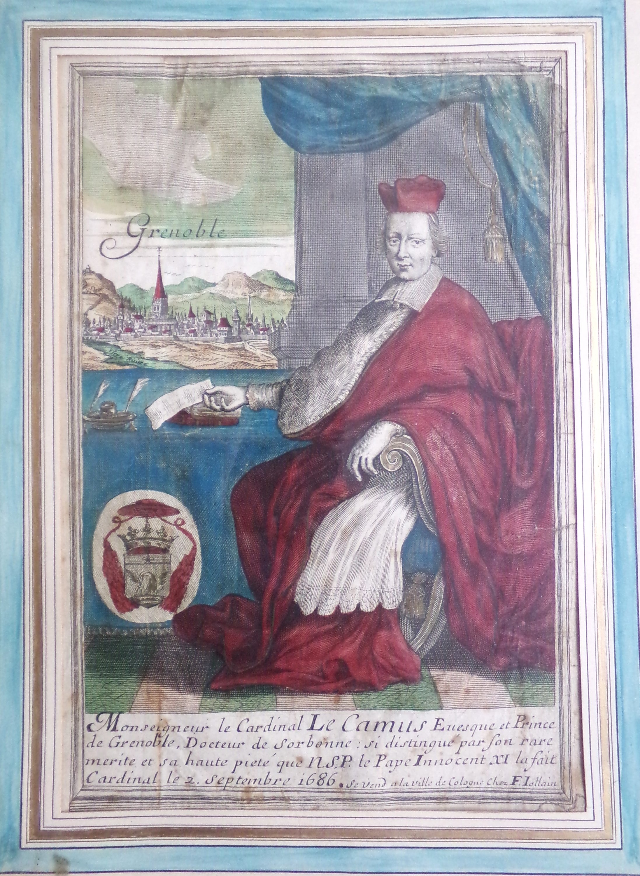 Portrait du cardinal Le Camus, gravure à rehauts de couleurs d’époque, « se vend en la ville de Cologne chez F. Jollain », fin du 17e siècle, 31 x 21 cm (à vue), sous cadre.