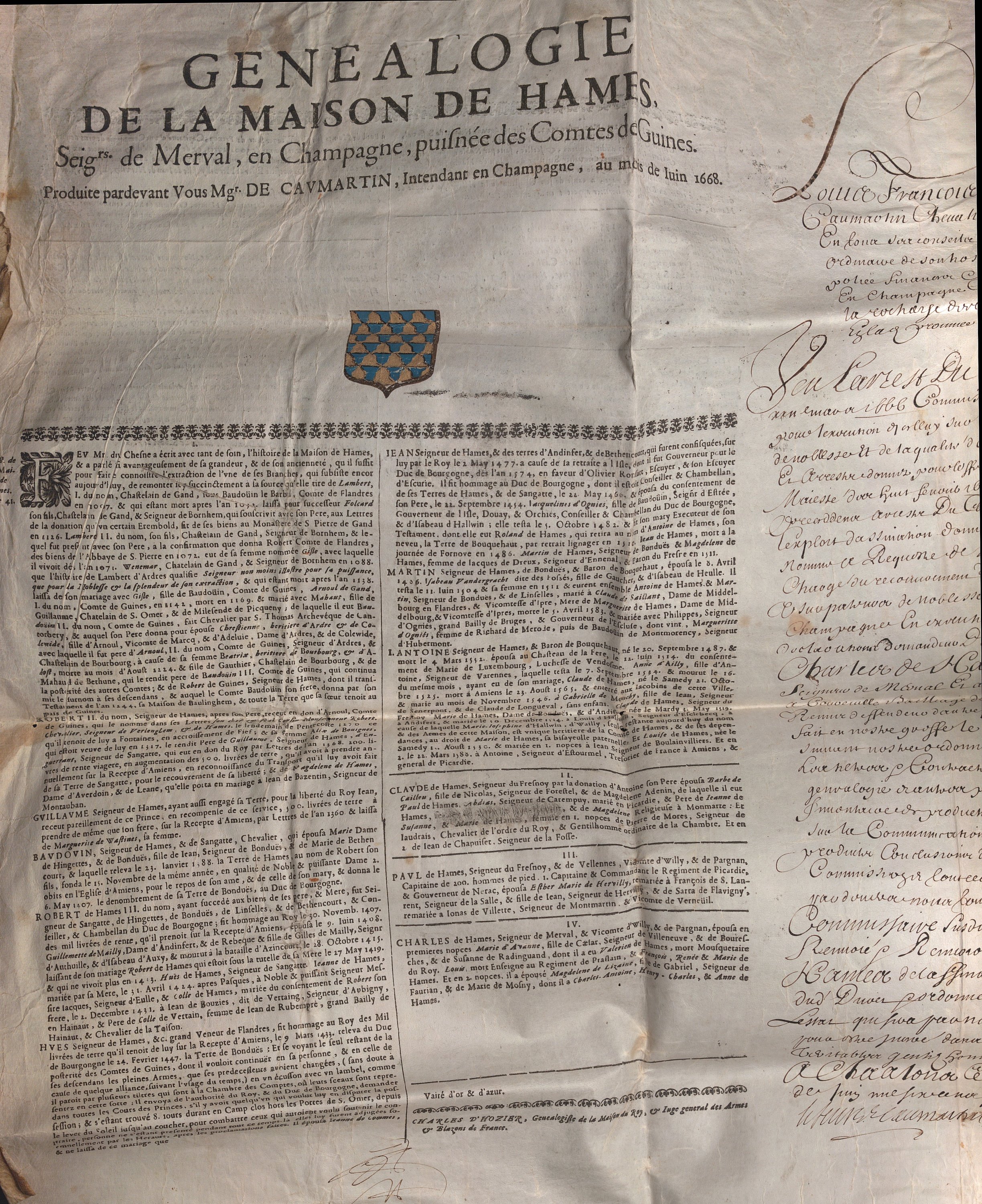 Confirmation de noblesse, grand parchemin, 64,5 x 53 cm, Châlons-en-Champagne, 15 juin 1668, en partie imprimée et manuscrite, titré « Généalogie de la maison de Hames, Seigrs de Merval, en Champagne, puisnée des Comtes de Guines », suivi des armoiries dessinées à la plume et rehaussées à la gouache : Vairé d’or et d’azur, et en impression de la généalogie ascendante de Charles de Hames, seigneur de Merval, demeurant à Coureville, bailliage de Fismes et élection de Reims, validée par Charles d’Hozier juge d’armes du roi.