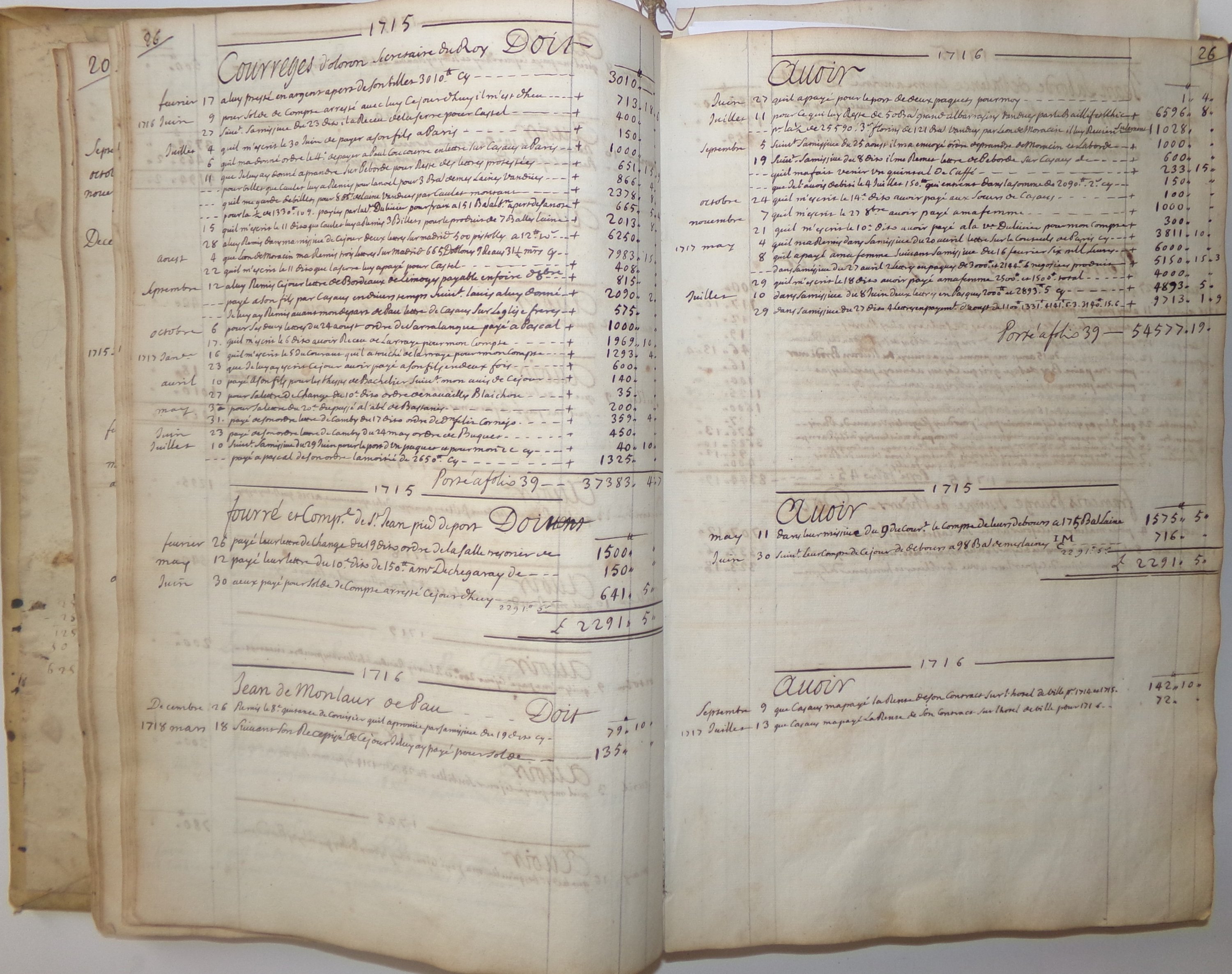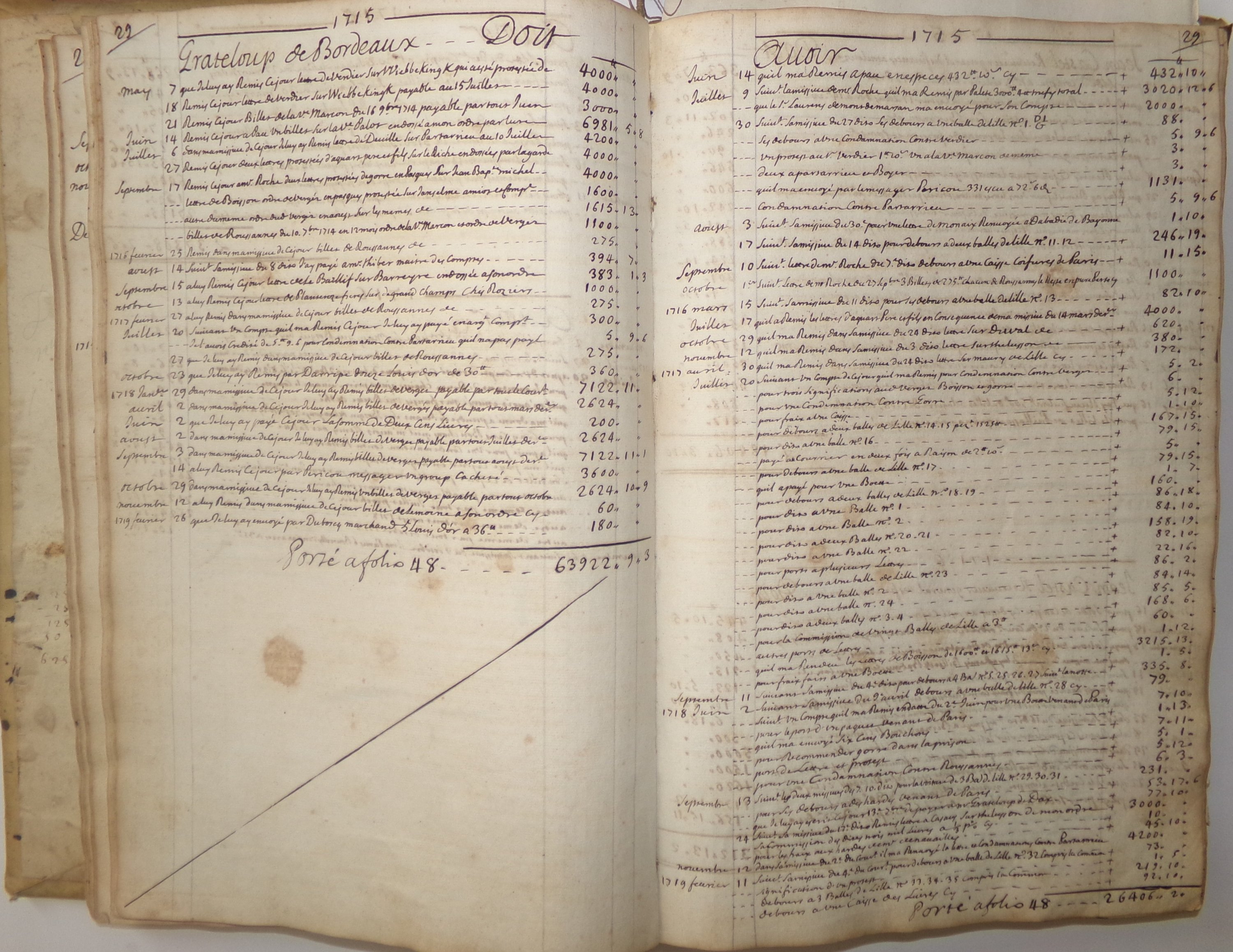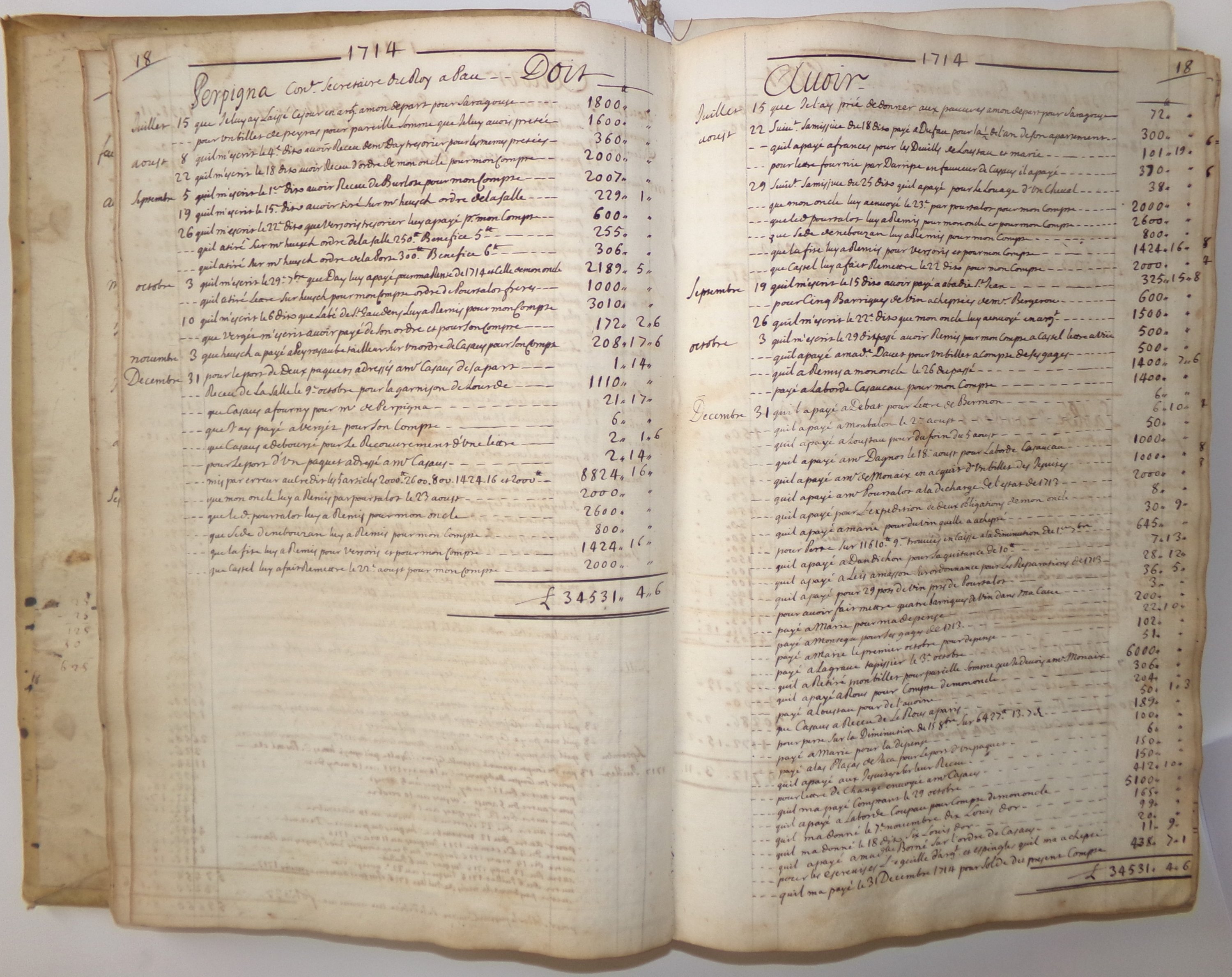 Intéressant et rarissime livre de compte relatant l’activité commerciale et financière du baron de Doumy, qui poursuit le commerce de la laine, société fondée par son père, Jean Courrèges (1649-avant 1695) marchand grossiste à Saragosse, époux de Marie Elisabeth Blusson, en association avec Jean de Claverie négociant en laines d’Espagne.