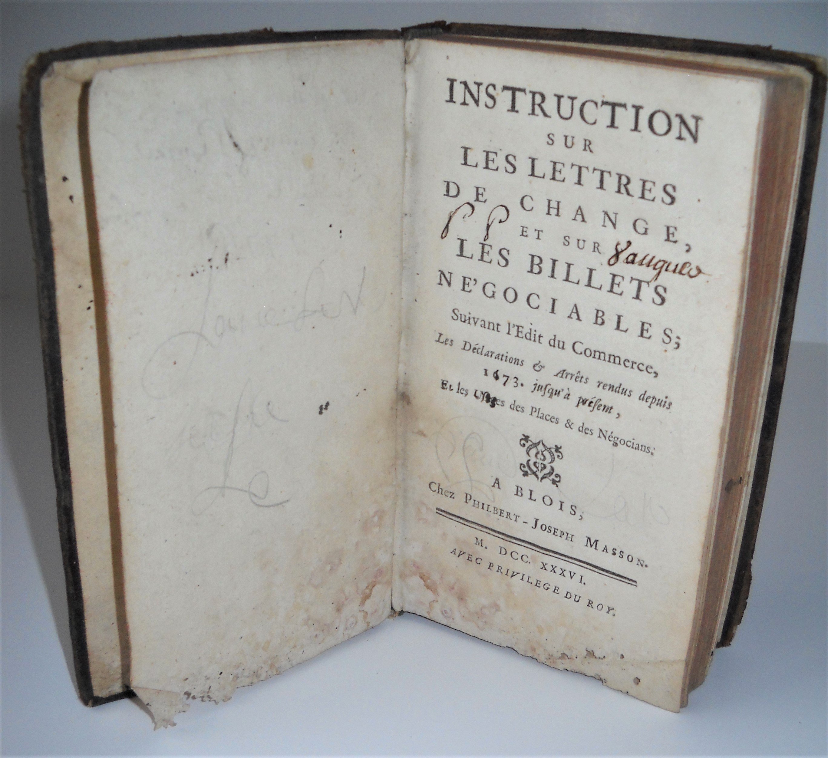 Instruction sur les lettres de change, et sur les billets négociables ; suivant l’édit du commerce, les déclarations & arrêts rendus depuis 1673, jusqu’à présent, et les usages des places et des négocians, Blois, Philibert Joseph Masson, 1736, 1ère édition, in-12, 209 pp., rel. plein veau d’époque (en l’état, manque) ;