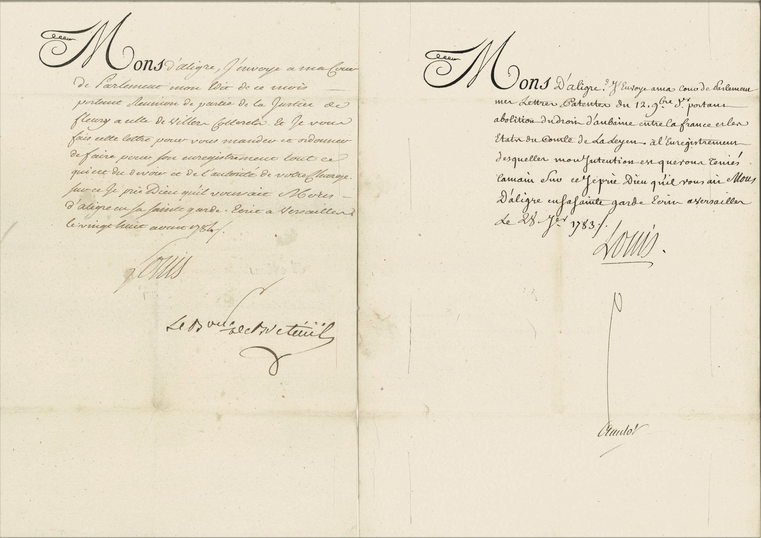 Réunion de 5 L.S., Versailles, 1783-1784, « Louis » (secrétaires du roi), contresignées par les secrétaires d’Etat à la Maison du roi Antoine-Jean Amelot de Chaillou et Louis Auguste Le Tonnelier baron de Breteuil, adressées à Etienne comte de Marans et marquis d’Aligre (1727-1798), président du parlement de Paris, 5 pages in-folio, relatives à la liquidation de la donation de l’archevêque de Paris, à la réunion de la justice de Fleury à celle de Villers-Cotterêts, à l’abolition du droit d’Aubaine entre la France et la principauté de la Leyen (Etat allemand), à l’acquisition d’un terrain pour la nouvelle halle aux cuirs à Paris, au canal de Provins.
