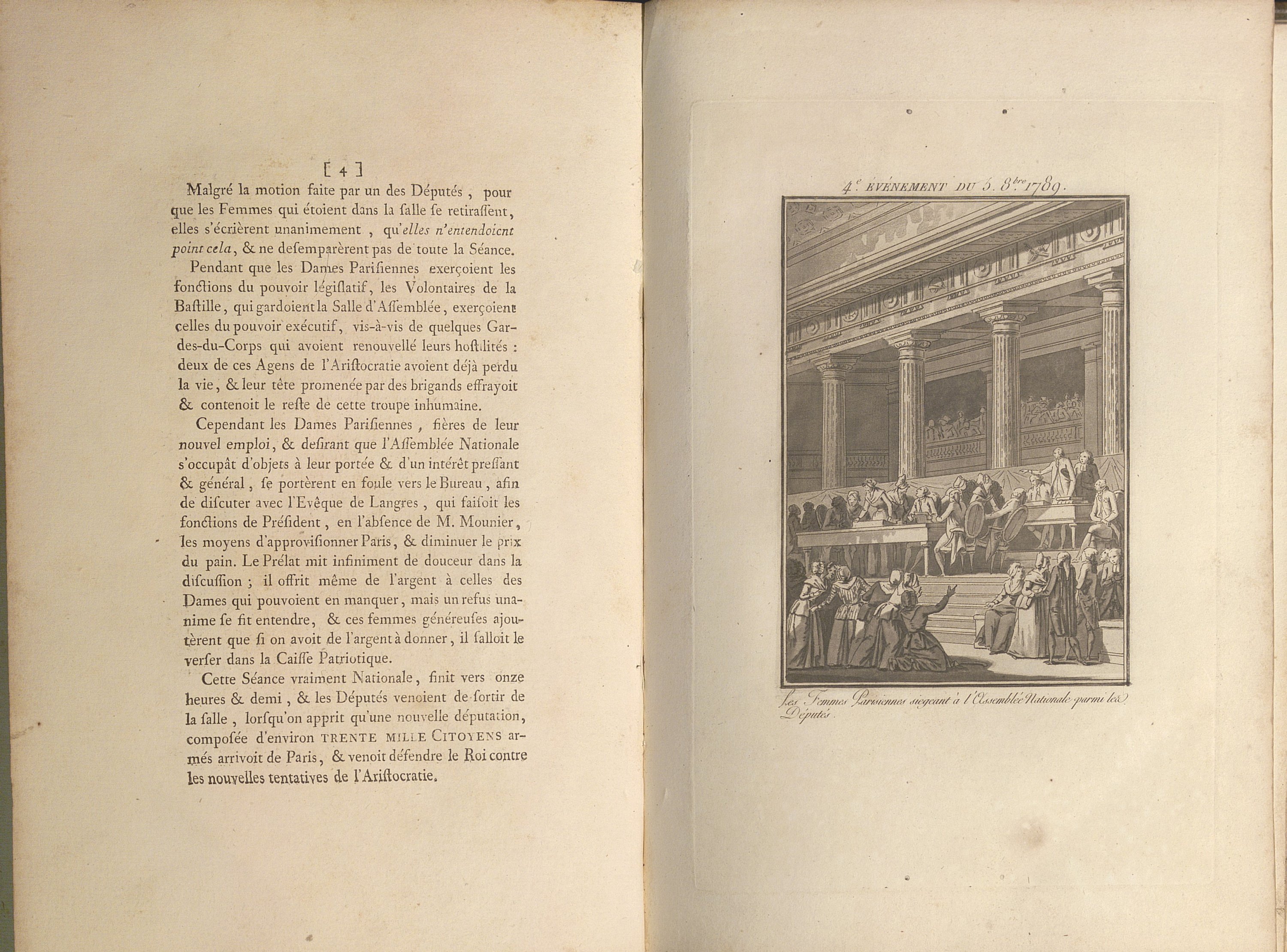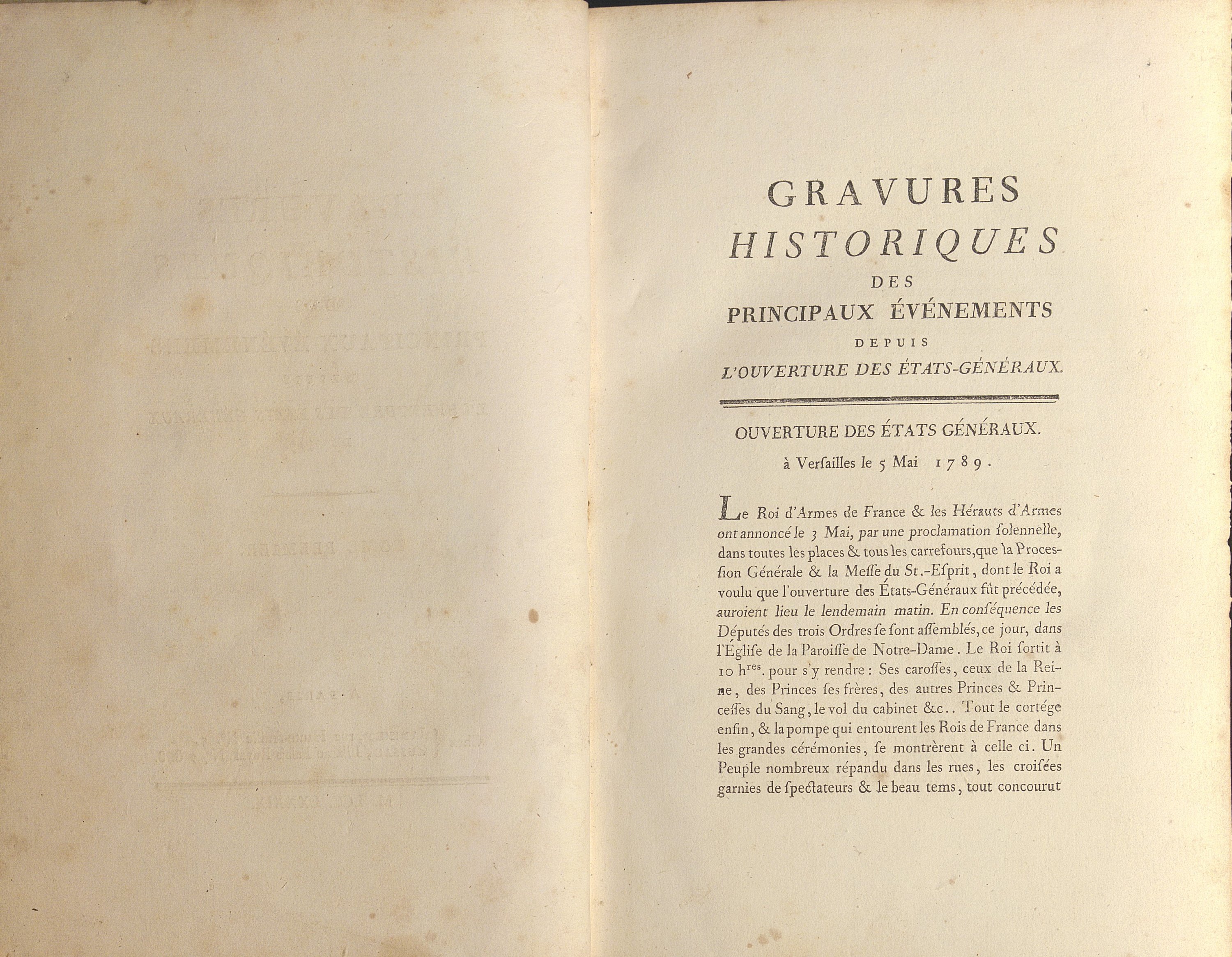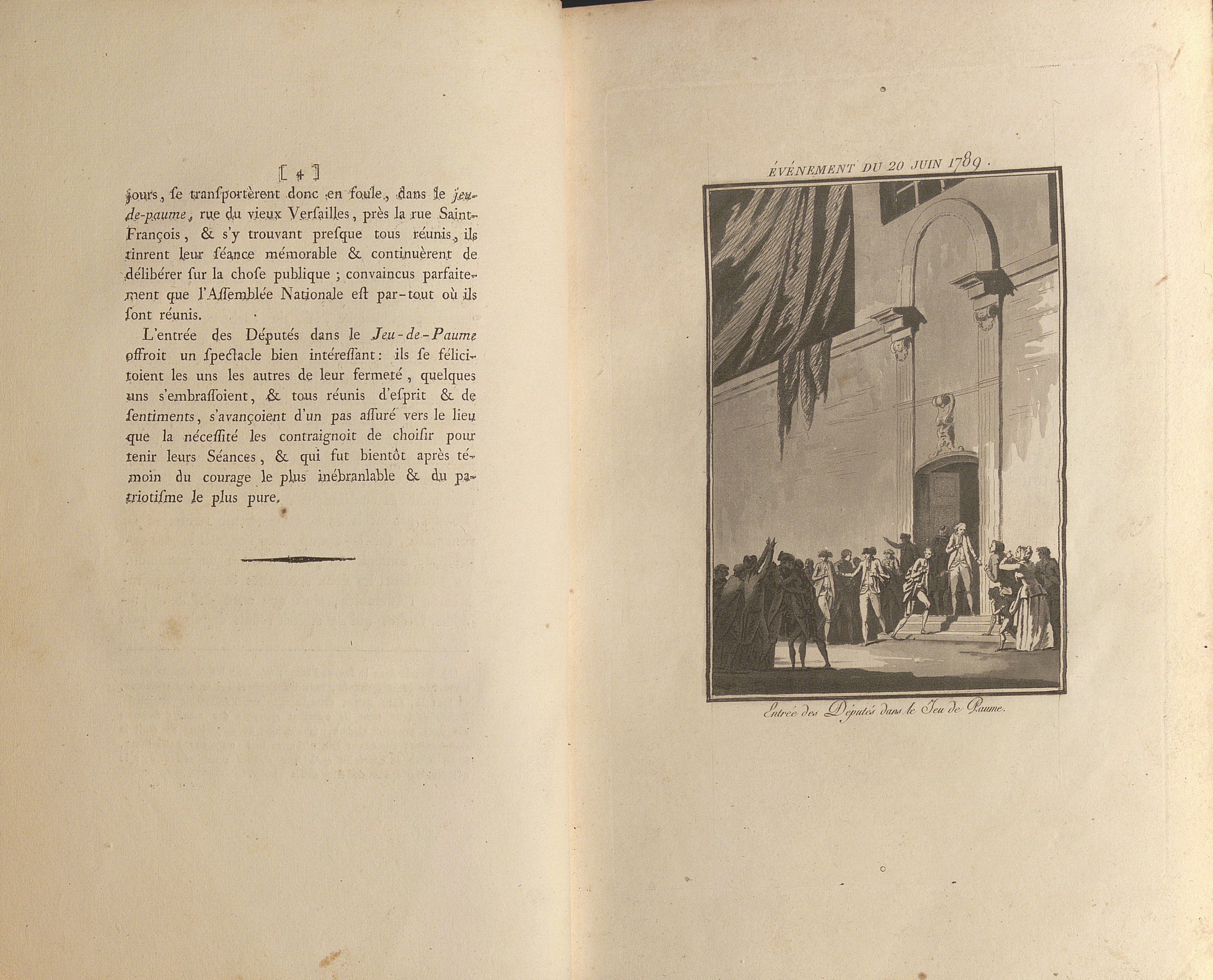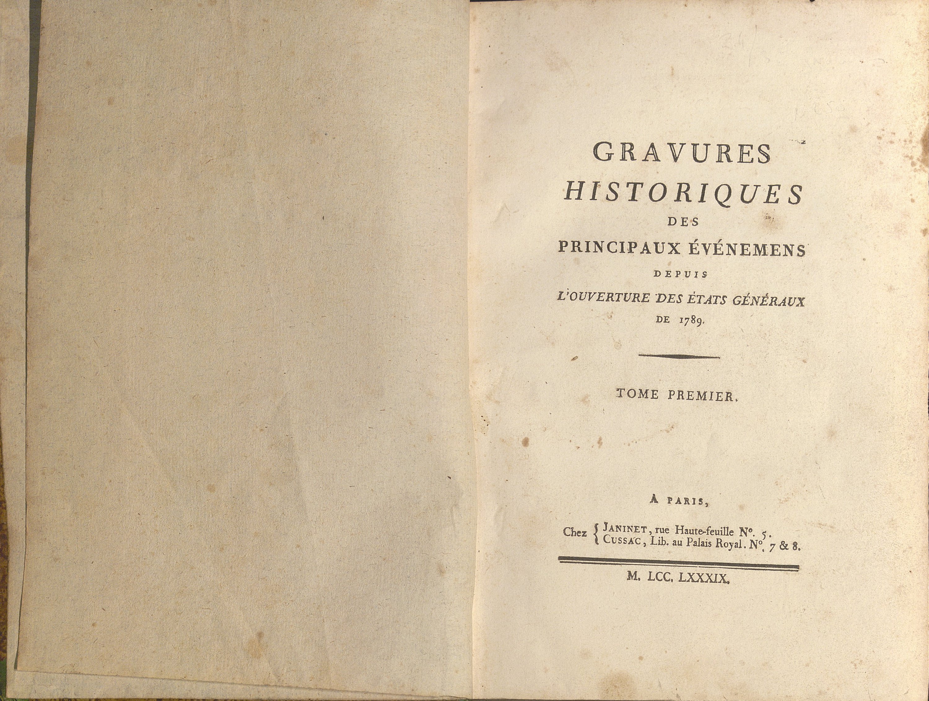Recueil factice rel. carton. in-4 contenant : Gravures historiques des principaux événemens depuis l’ouvertures des états généraux de 1789, tome 1er, Paris, Janinet et Cussac, 1789, comprenant jusqu’à l’événement du 12 janvier 1790 ; Code national ou loix décrétées par l’Assemblée nationale, tome 1er, Paris, Janinet et Cussac, 1789, 96 pp.