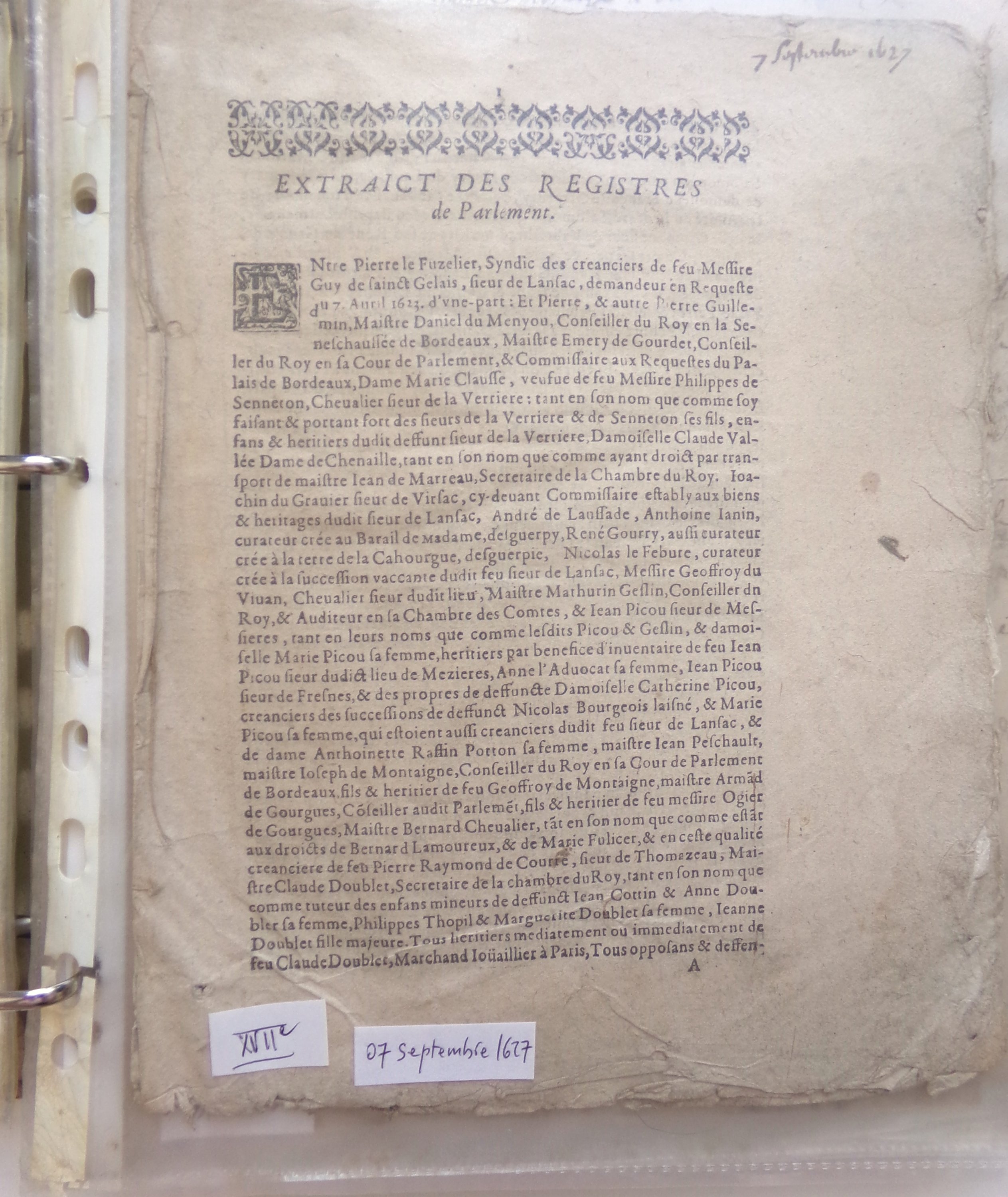 Classeur contenant près de 40 pièces manuscrites et imprimées, 16e au 19e siècle.