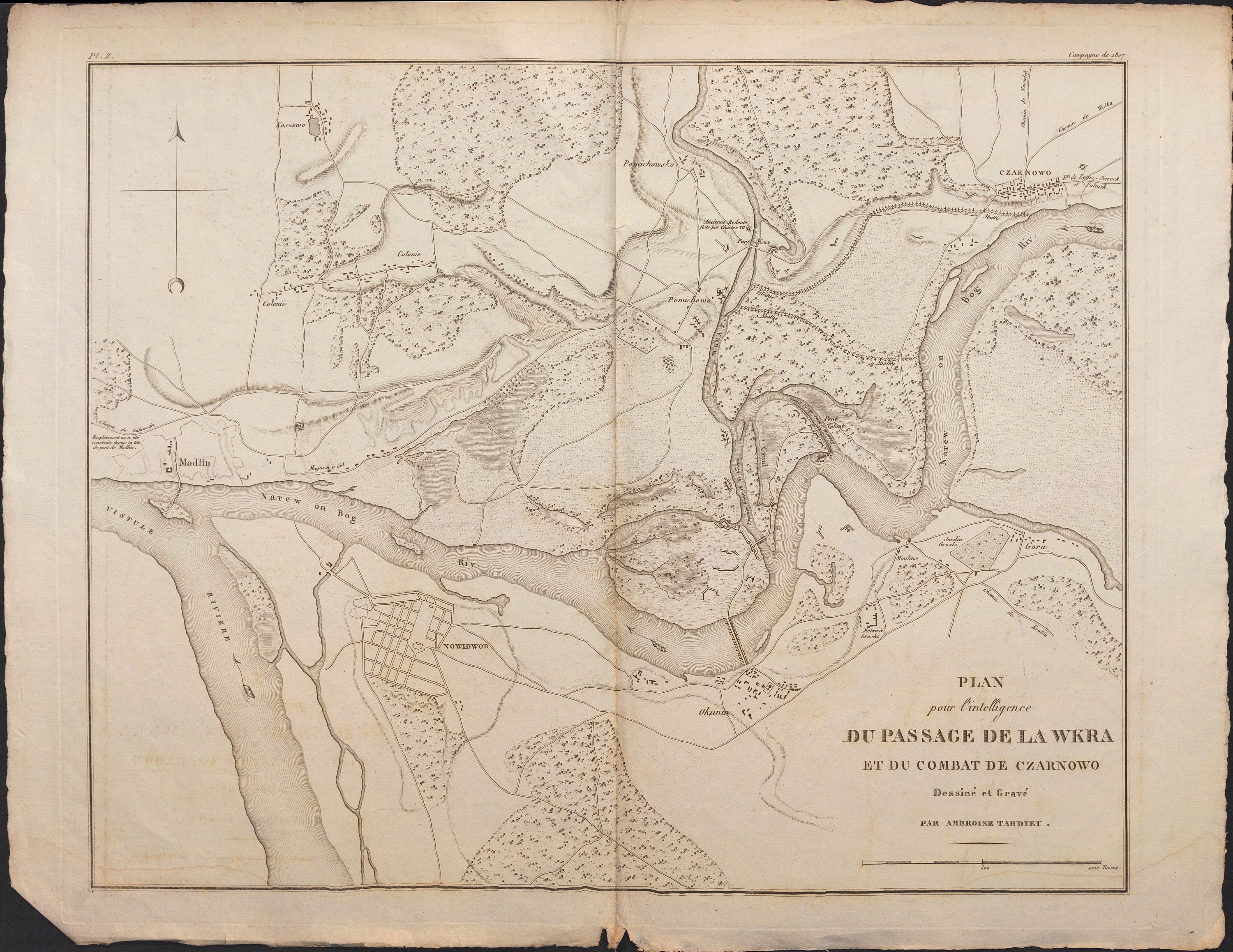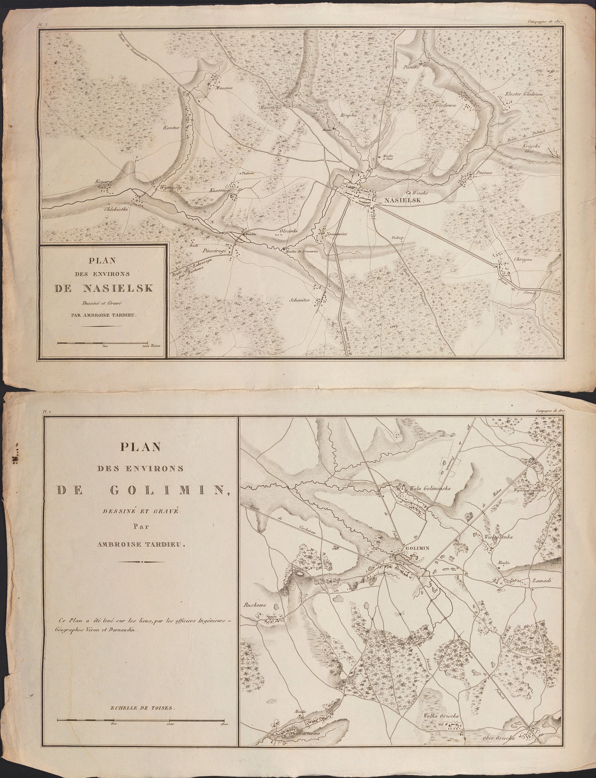12 plans militaires dessinés et gravés par Antoine Tardieu (1788-1841), cartographe et graveur pour le Dépôt de la Marine et le Dépôt des Fortifications, dont il dirigea les travaux de 1811 à 1814 : plan du passage de la Wkra et du combat de Czarnowo ; du camp de Montreuil commandé par le maréchal Ney (1819) ; des environs de Nasielsk ; du champ de bataille de Pultusk ; des environs de Golimin ; des environs de Soldau ; de Mohrungen ; de la ville et du port et des camps de Boulogne ; d’Ostende et de ses environs où sont placés le quartier général de l’Empereur ; etc. 27 x 41 et 42 x 54 cm.