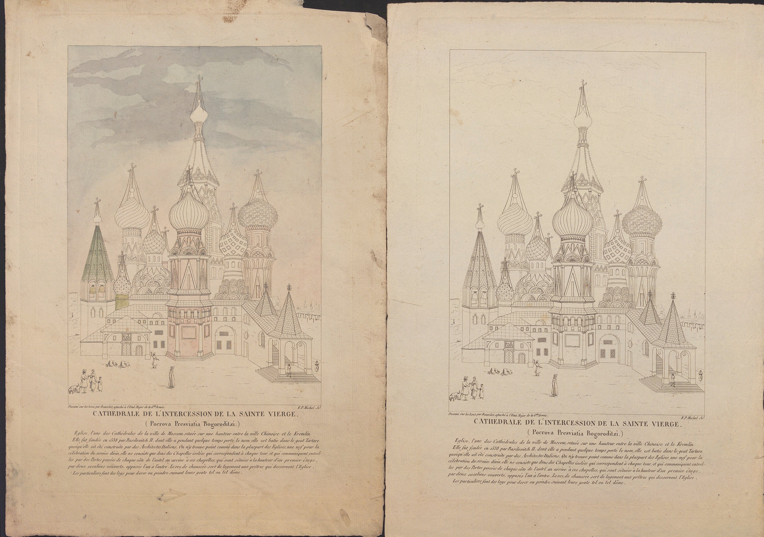 2 gravures de la « Cathédrale de l’intercession de la Sainte Vierge » à Moscou « dessinée sur les lieux par Beuvelot, attaché à l’état-major de la 6e armée », 34 x 24 cm.