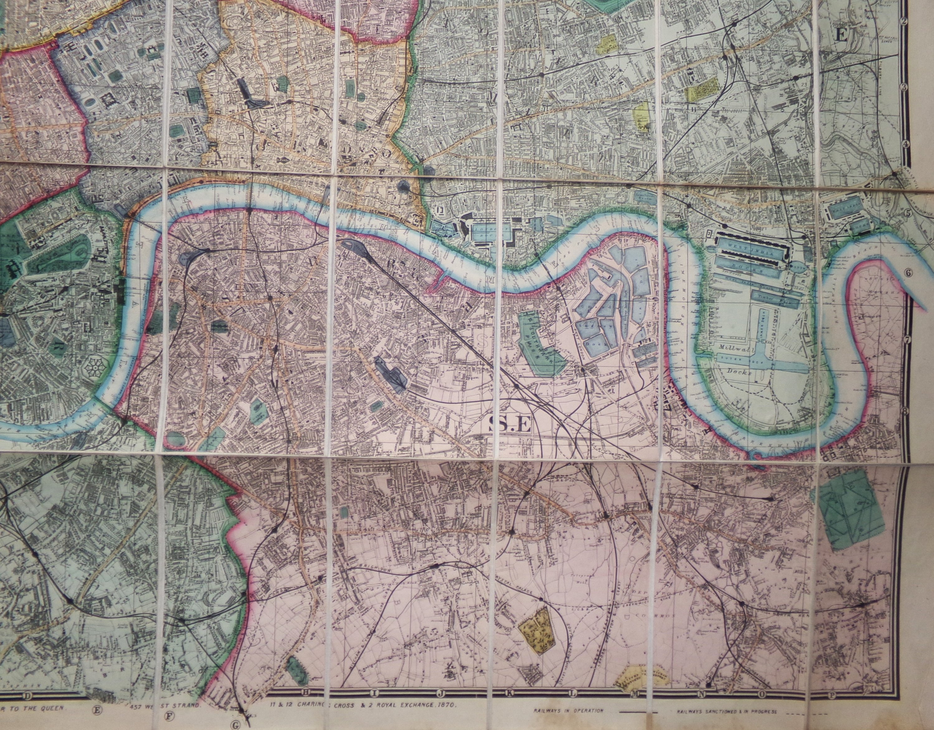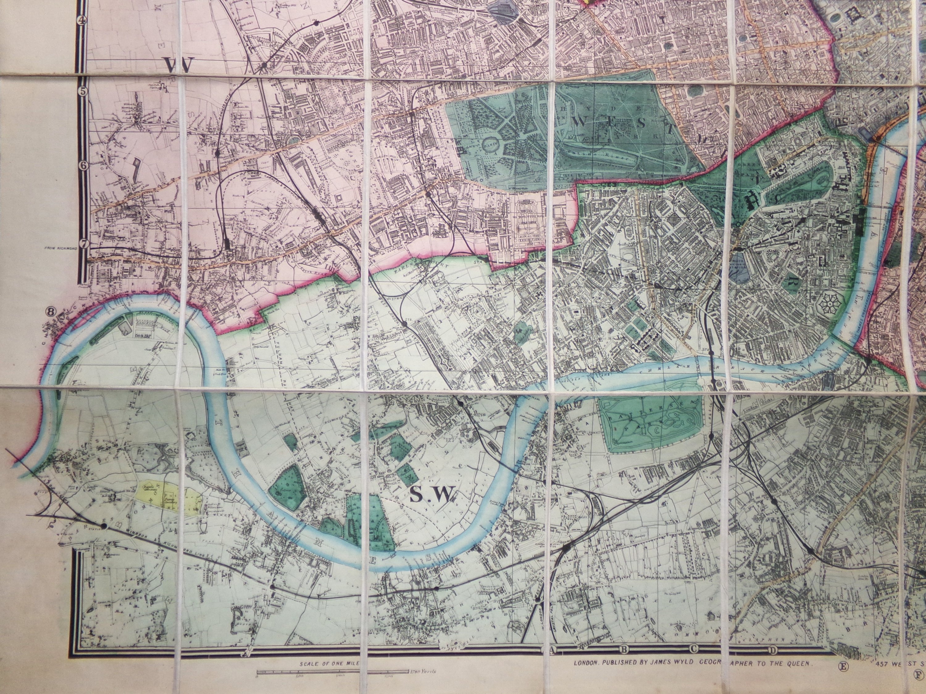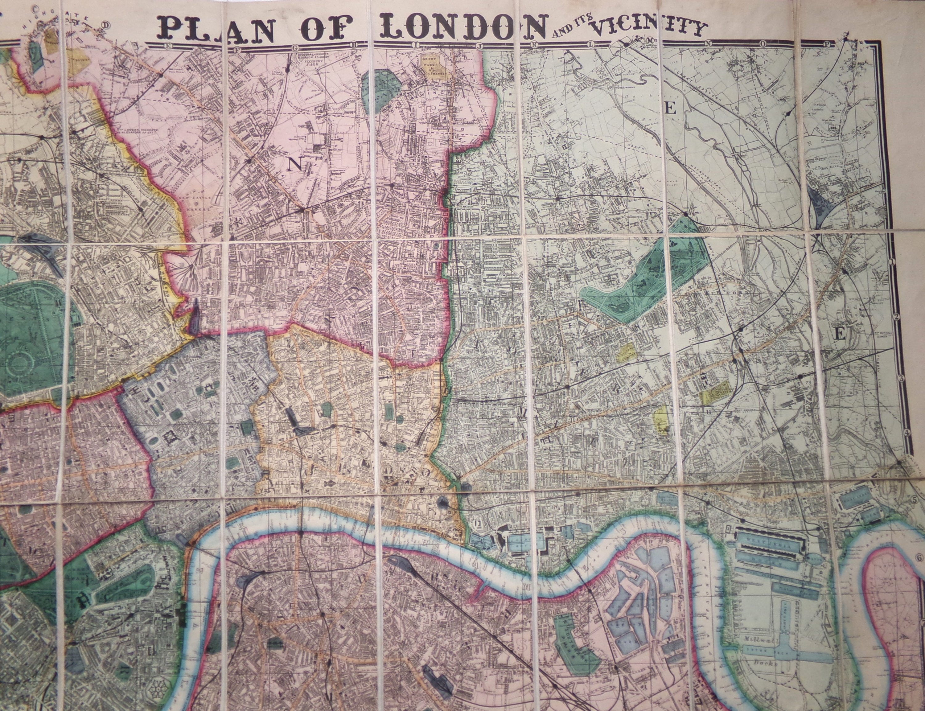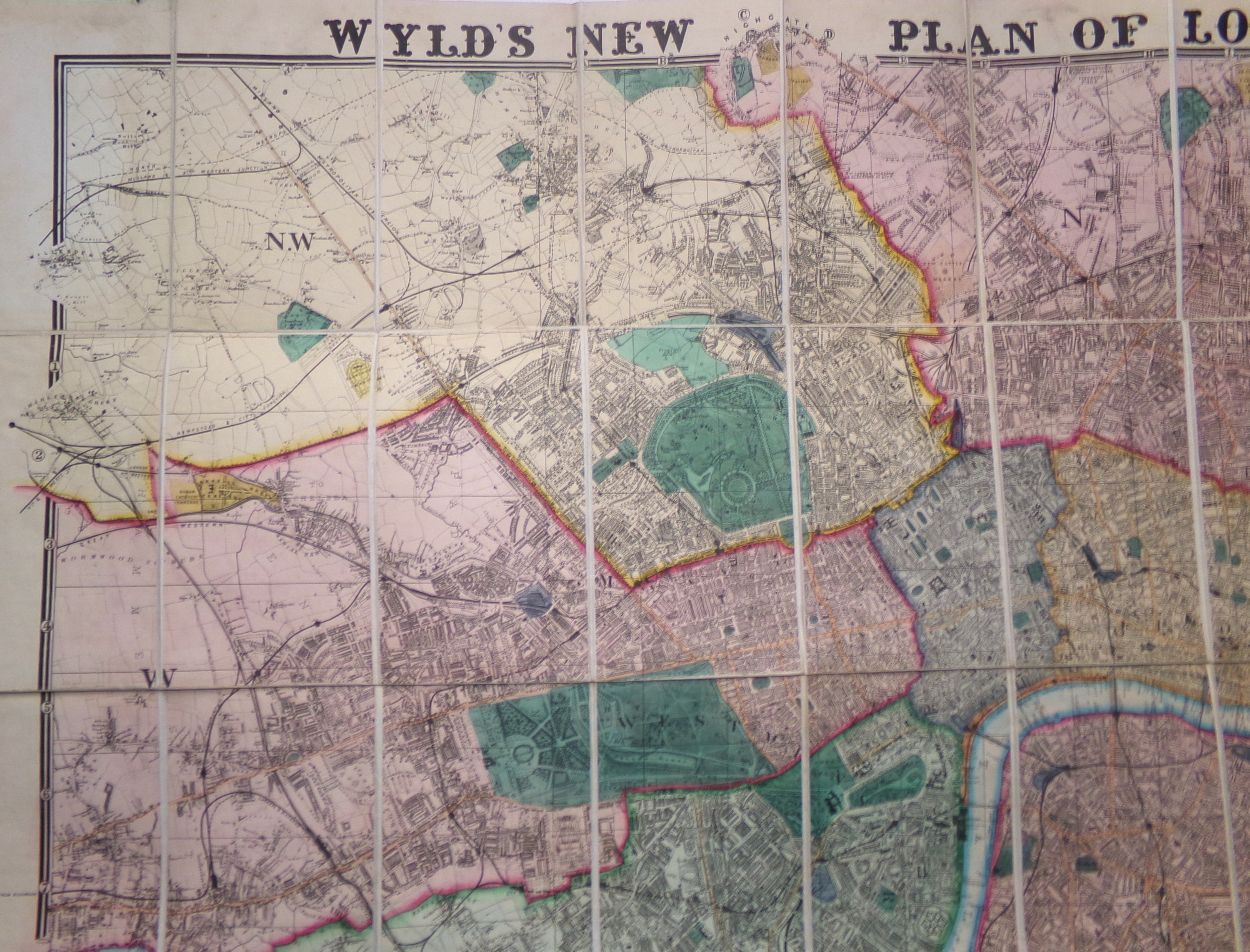 « Wyld's New Plan of London and its Vicinity », Londres, publiée par James Wyld, géographe de la Reine, 1870. Grande carte dépliante gravé à rehauts de couleurs d’époque, divisée et découpée en 40 sections contrecollées sur toile, couv. rel. originale avec étiquette de l’éditeur. Le plan couvre les quartiers de la ville de Londres allant de Hihgate à Brixton et de Victoria Docks à Wormwood Scrubs. 81 x 118 cm (qqs rousseurs).