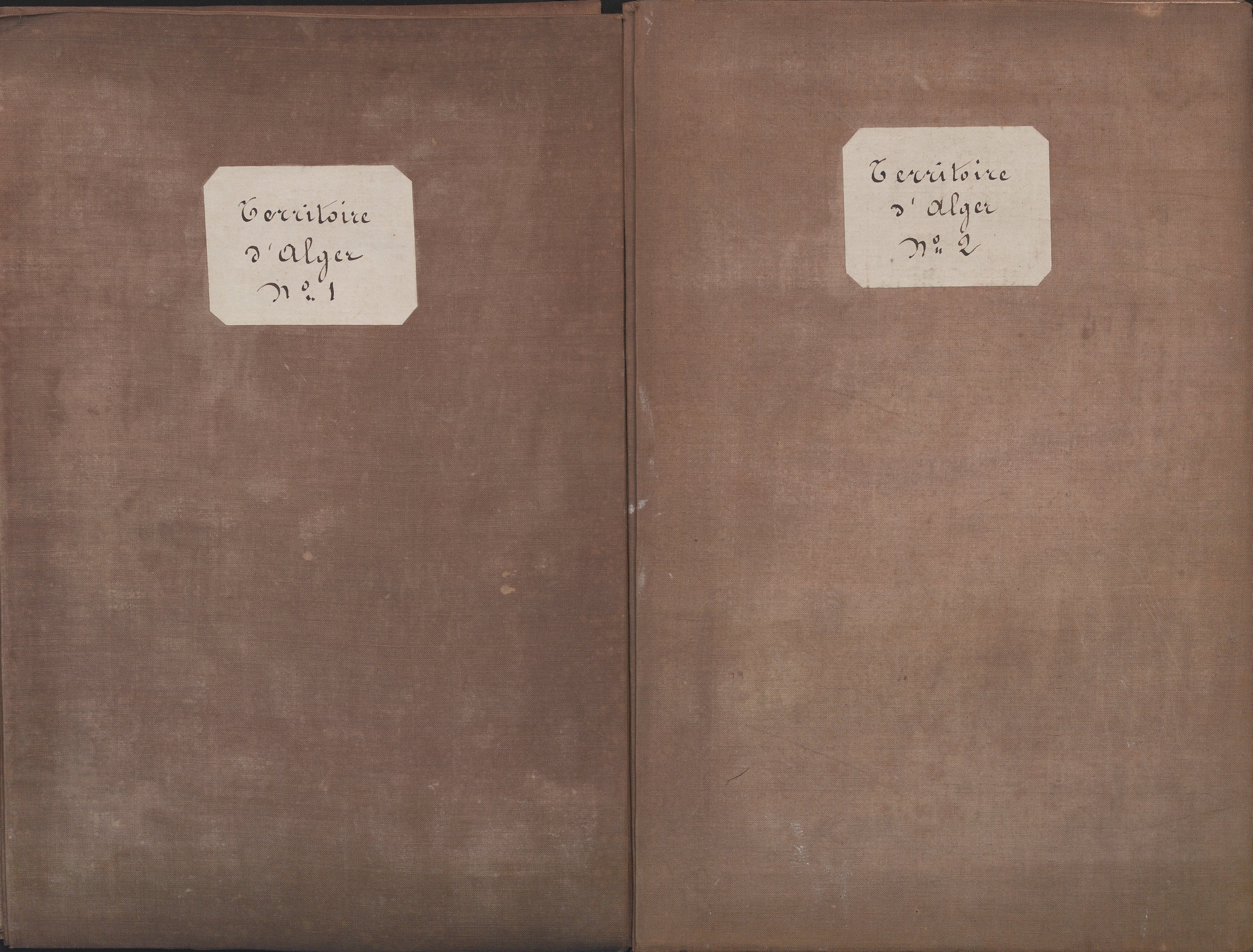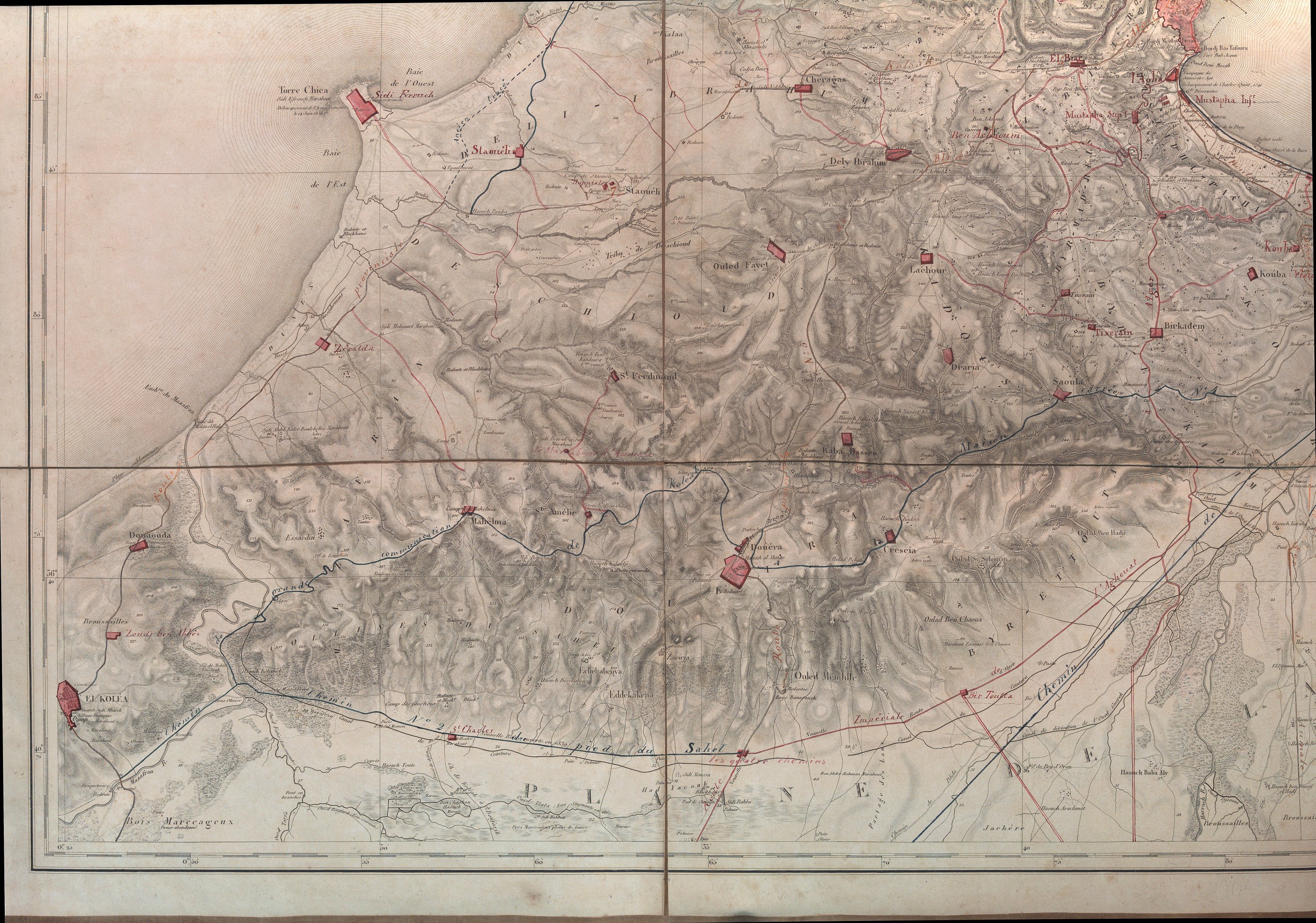 Carte d’état-major du territoire d’Alger en 2 parties, dressées sur ordre du duc de Dalmatie, imp. à Paris en 1834 ; contrecollées sur toile et pliées ; ajouts manuscrits à l’encre rouge et bleu des routes, chemins et positions des camps fortifiés.