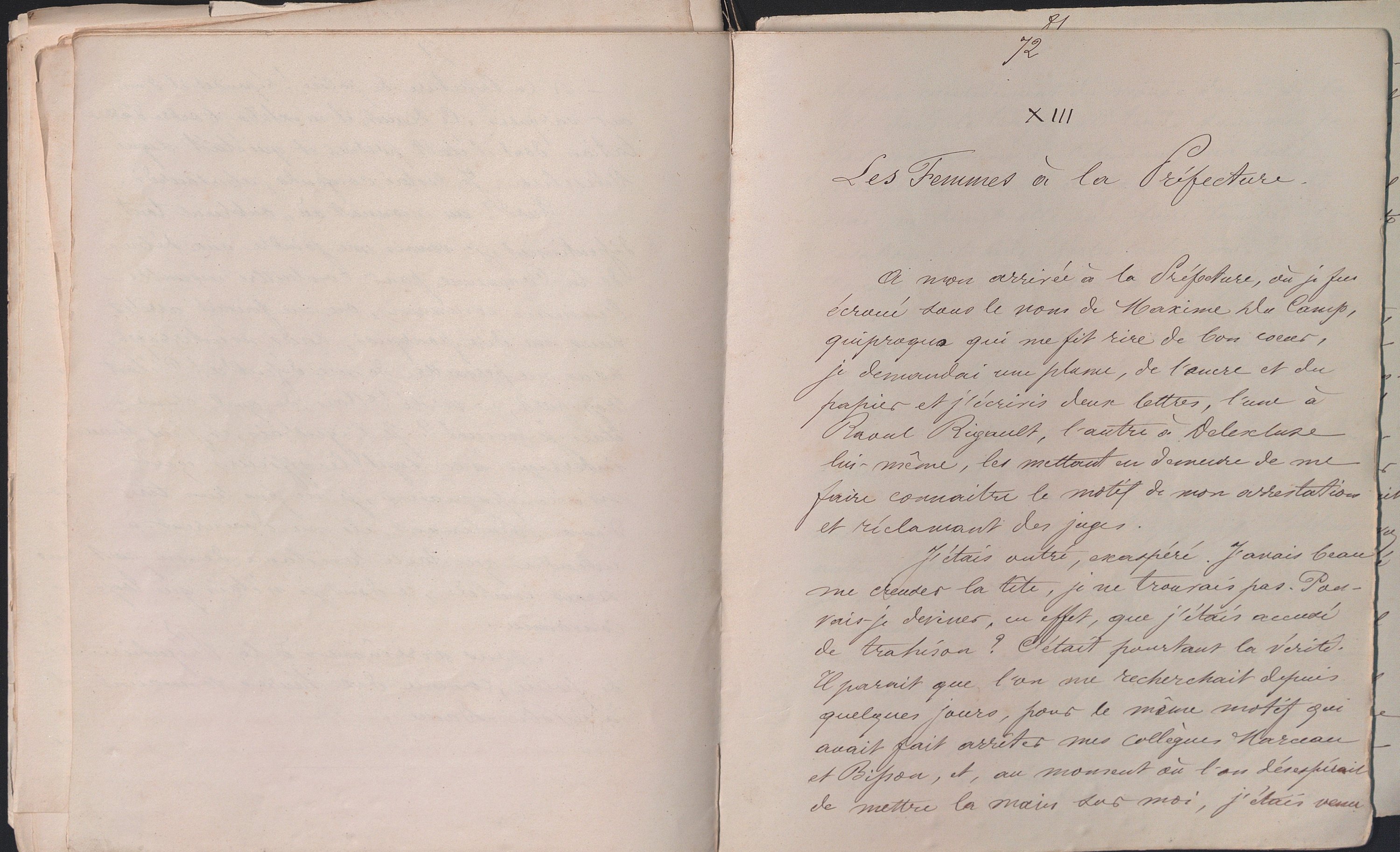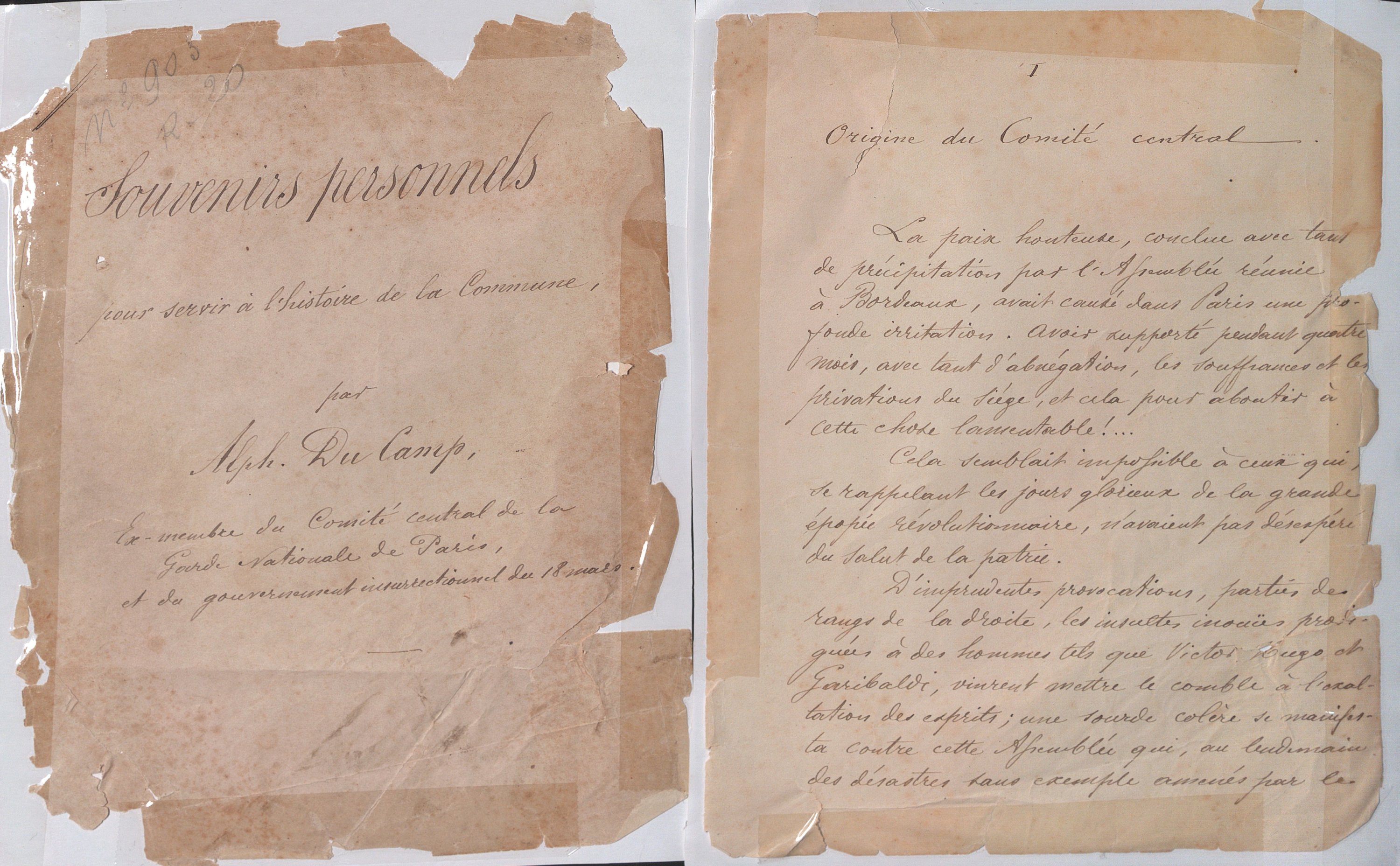 Manuscrit titré « Souvenirs personnels pour servir à l’histoire de la Commune par Alph. Du Camp, ex-membre du Comité central de la Garde nationale de Paris et du gouvernement insurrectionnel du 18 mars », 161 feuillets in-8 écrits seulement au recto (manque la page 18 et 101, accdts).