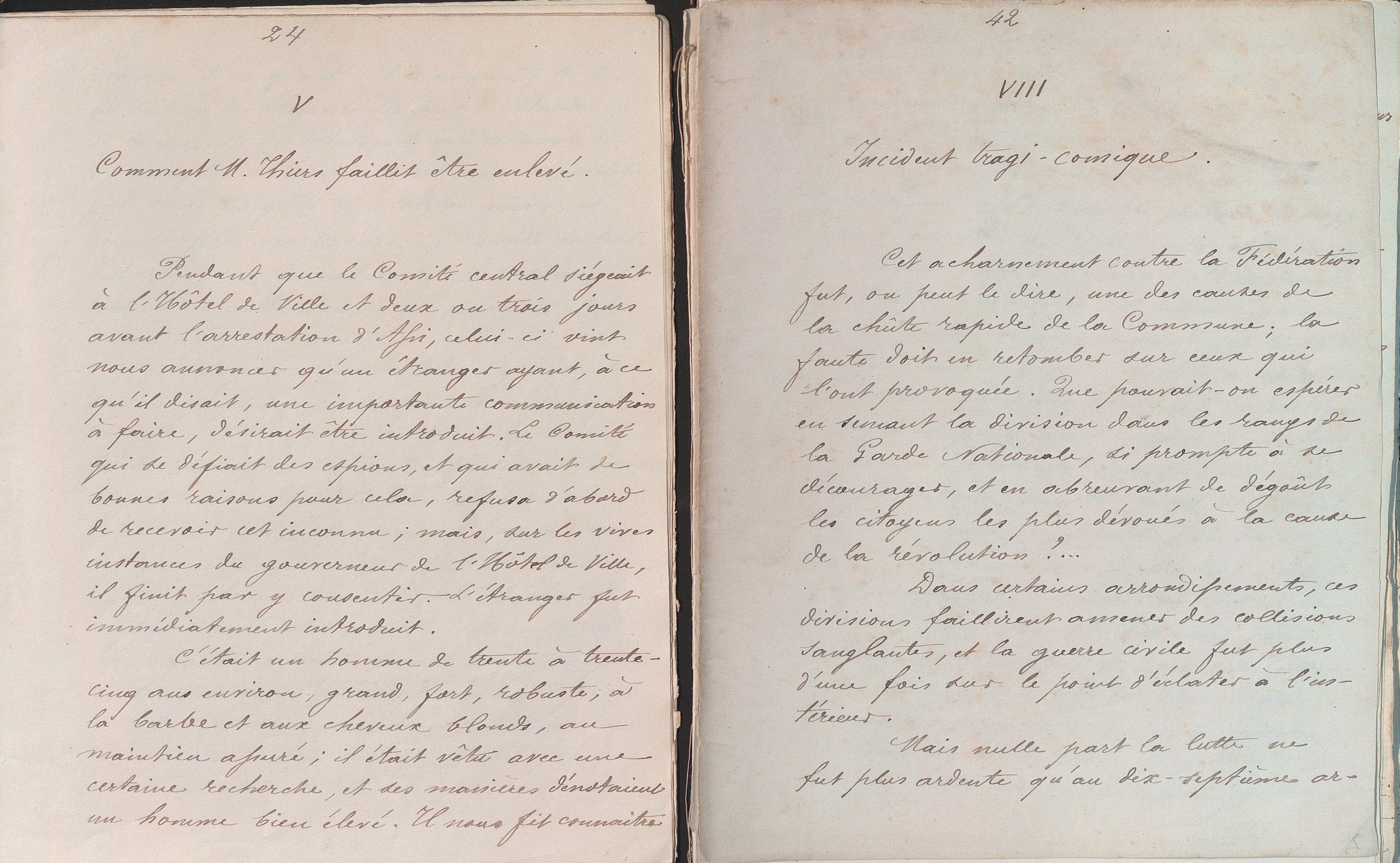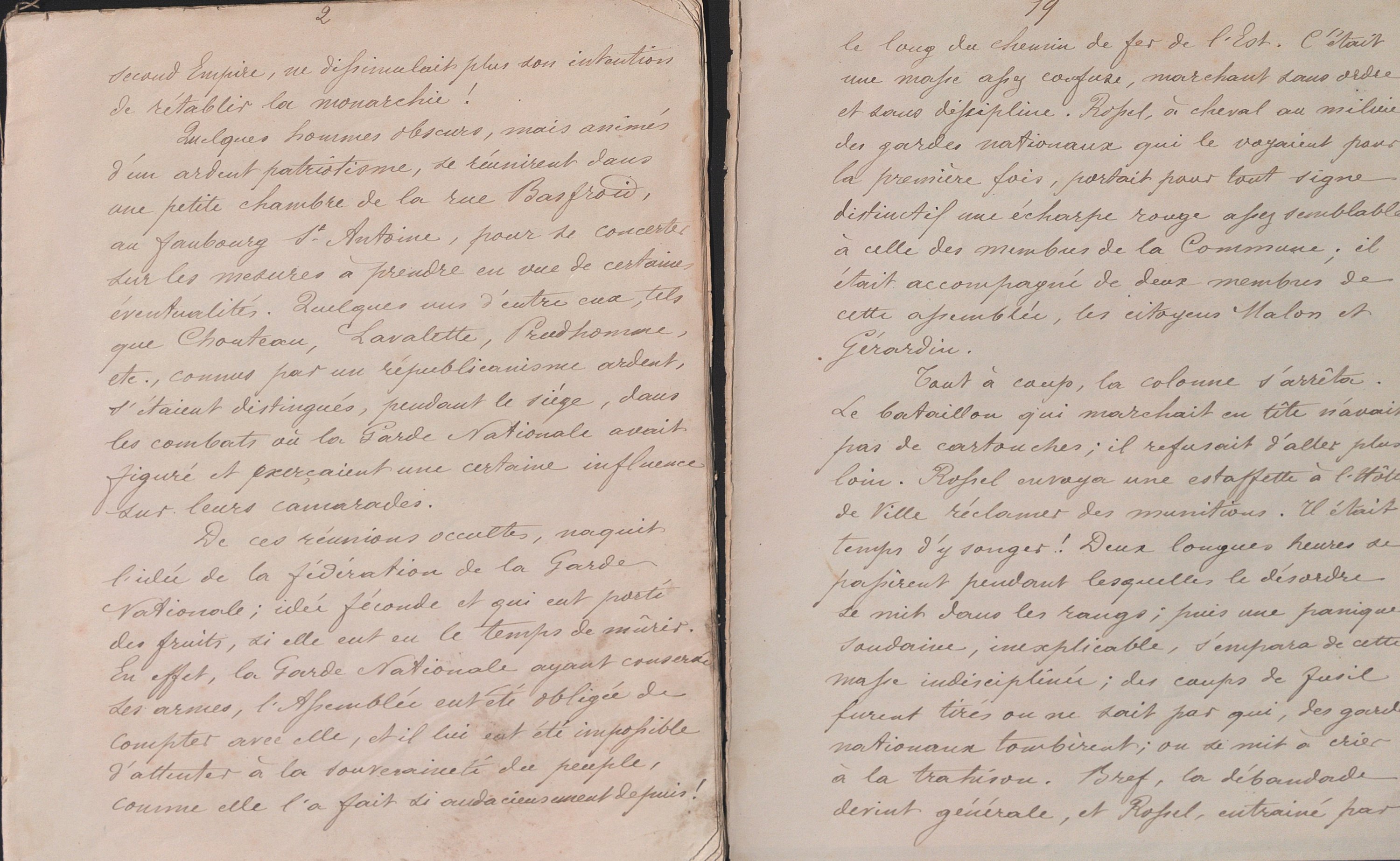 Ce témoignage inédit de première main nous plonge littéralement au cœur de la ville assiégée, côtoyant les militants communards comme Eugène Varlin (1839-1871) « Le 17 mars au soir nous assistions tranquillement Varlin et moi, à une réunion des délégués du dix-septième arrondissement où nous étions domiciliés tous deux ; vers minuit un citoyen vint nous annoncer que des mouvements de troupe inquiétants avaient lieu et que le gouvernement préparait une attaque contre Montmartre (…) vers six heures du matin on heurta violemment à ma porte ; je courus ouvrir ; c’était Varlin déjà levé et en tenue de garde national. Je compris immédiatement à son air grave et soucieux qu’il venait m’annoncer quelque nouvelle fâcheuse (…) que notre artillerie de Montmartre était prise et les buttes occupées militairement (…) Dans la rue les passants s’abordaient avec stupeur… » ; Louis Rossel (1844-1871) « je revins en toute hâte à la mairie des Batignolles où je trouvais Rossel en train de rédiger une proclamation. Après l’avoir signée il me la tendit : Lisez me dit-il ce sont mes adieux à la Légion ! Je pris connaissance de ce factum et à mesure que j’avançais dans cette lecture, l’étonnement, la colère, l’indignation se peignaient successivement sur ma figure. (…) Dans cette étrange proclamation il reprochait aux hardes nationaux leur indiscipline, leur manque de courage et surtout leurs habitudes d’ivrognerie, il terminait en leur jetant sa démission à la face, comme une suprême injure ! Certes il y avait du vrai dans ses reproches mais était-il politique d’afficher et de révéler à nos ennemis le secret de notre faiblesse ? Assurément non. J’en fis l’observation à Rossel qui ne voulut rien entendre (…) glissa sa proclamation dans une large enveloppe à l’adresse de l’imprimeur Hennuyer (…) la tendit par-dessus ma tête au jeune Dombrowski, son aide de cap et le seul témoin de cette scène. Mais soudain me levant d’un bond je saisis la lettre au passage et tirant un révolver de ma ceinture : Colonel Rossel, m’écriai-je hors de moi, ceci est agir en traitre… je vous arrête ! (…) J’ai raconté cette arrestation de Rossel dans tous ses détails, parce qu’ils sont complètement ignorés ; les historiens de la Commune en parlent vaguement et en ignorent les motifs, comme ils ignorent du reste, tant d’autres faits intéressants, entr’autres celui que je vais vous raconter [le projet d’enlèvement d’Adolphe Thiers chef du gouvernement]... » ; son regard critique sur le Comité central « J’ai dit que la division s’était glissée au sein du comité central dont les membres se défiaient les uns des autres ; étroitement unis avant la victoire, après, comme il arrive souvent, ils se regardaient en frères ennemis. Ainsi le citoyen Assi [Adolphe Assi (1841-1886] nommé gouverneur de l’Hôtel de Ville s’isolait de plus en plus de ses collègues et cherchait à substituer peu à peu son autorité à celle du Comité central (…) Grisé par le succès, aveuglé par l’ambition, dévoré de la soif des jouissances et lâchant la bride à ses convoitises malsaines, l’ancien agitateur du Creusot oubliait toute retenue et toute mesure et se croyait déjà maître du pouvoir (…) une telle situation devenait intolérable : Assi fut arrêté à son tour et remplacé par le jeune Pindy [Jean-Baptiste Pindy (1840-1917)] (…) A partir de ce moment je fus assailli par les plus sombres pressentiments. Je voyais que l’on faisait fausse route (…) J’annonçais l’intention de me retirer ; mais je dus céder aux sollicitations de mes amis, parmi lesquels se trouvaient le docteur Tony Moilin [(1832-1871)] et le capitaine Marceau ; je restai… » « On croit généralement que le comité central a fait à la Commune une opposition systématique, dans le but inachevé de ressaisir le pouvoir qu’il avait volontairement abandonné. C’est là une grave erreur contre laquelle je ne saurais trop m’élever (…) Pendant cette période agitée, je fus tout particulièrement en butte aux attaques sans cesse renaissantes et aux calomnies venimeuses de la minorité de la Commune et de ses partisans. Voici à quel propos je m’attirai cette persécution ; certain soir au Club des Batignolles, le citoyen Emile Clément membre de la Commune ayant déclaré que l’ouvrier devait remplacer le bourgeois et le déposséder, je protestai avec force contre une pareille ineptie, contre un aussi dangereux sophisme (…) Cette sortie violente causa une agitation extrême et peu s’en fallut qu’on n’en vint aux mains. Il va sans dire qu’à partir de ce jour je passai pour un réactionnaire excessivement dangereux, pour un agent de Pitt et Cobourg ! (…) on répandit contre moi dans le public les calomnies les plus odieuses (…) m’accusa d’avoir dilapidé les fonds de la municipalité pendant mon court passage à la mairie des Batignolles comme délégué du comité central ; on alla plus loin encore : on me fit passer pour un ancien agent bonapartiste, pour un mouchard de l’Empire !!!... » ; anecdote inédite au cours du vote qui se déroula au sein du Conseil de la Légion (Vergès, Fabrègue, Mulay…) ; journée du 21 mai 1871 avec l’entrée des troupes versaillaises dans Paris ; les incendies « Tout en causant de nos espérances déçues, de nos projets avortés, de cette révolution qui, dans notre pensée, devait affranchir tous les opprimés, et sui à peine à son aurore allait s’éteindre misérablement noyée dans le sang, nous approchions de la barrière du Trône (…) De ce point élevé d’où l’on découvre presque tout Paris, nous jetâmes un regard plein de tristesse sur cette ville immense, déchirée à cette heure par les fureurs de la guerre civile. Avec quelle douloureuse et profonde émotion nous contemplions le spectacle de ces incendies allumés par des mains 