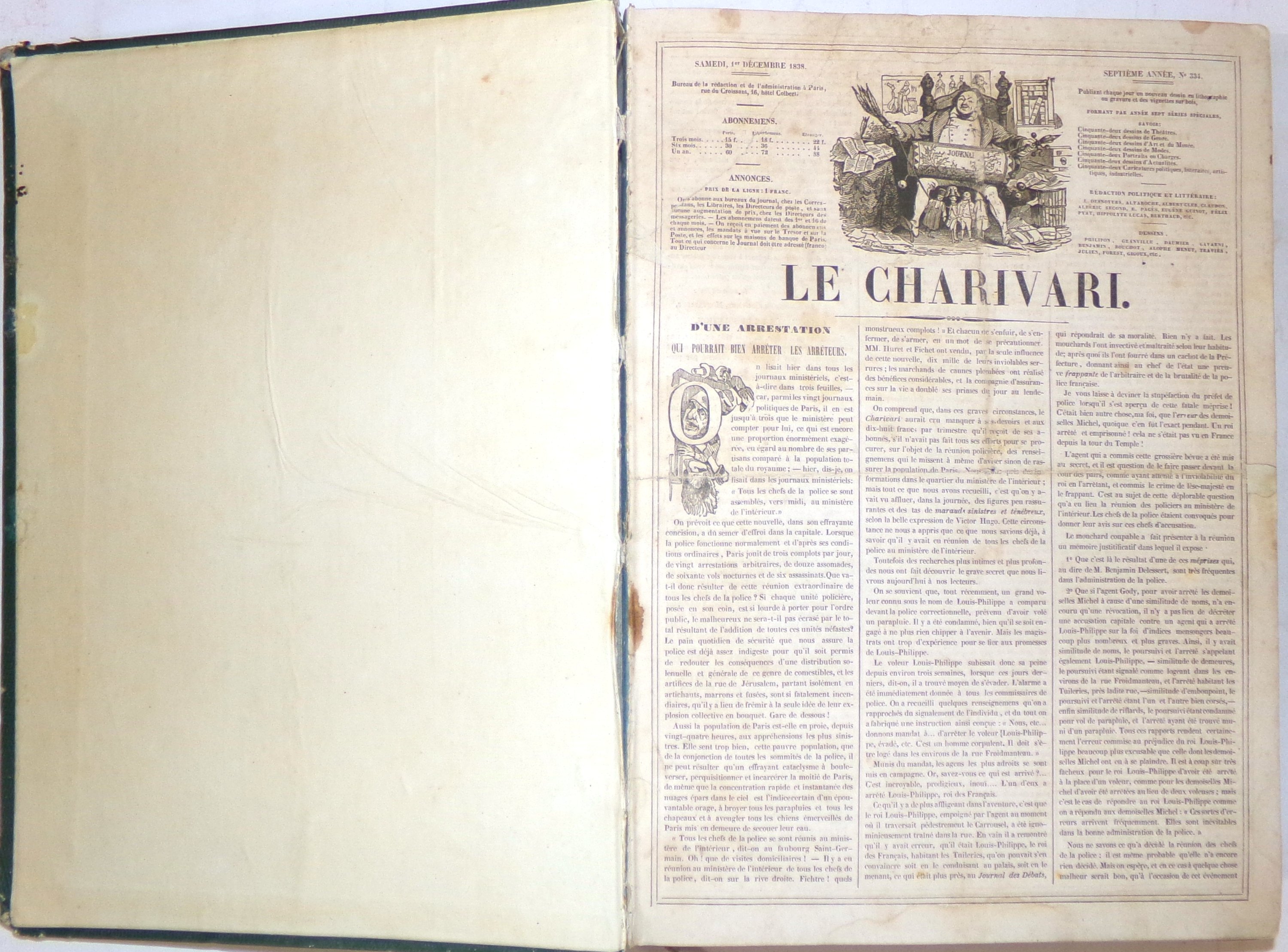 Premier quotidien illustré satirique du monde, Le Charivari parut de 1832 à 1937. Fondé le 1er décembre 1832 par Charles Philipon comme un journal d'opposition républicaine à la monarchie de Juillet, le journal satirique à vocation distractive s'affirma au cours de son histoire tantôt radical, conservateur, républicain ou encore anticlérical. Ses auteurs les plus notables furent notamment Taxile Delord ou encore Agénor Altaroche et ses caricaturistes les plus marquants furent entre autres Philipon, Nadar, Gustave Doré, Honoré Daumier, Cham, Gavarni, Pigal, Traviès, etc.