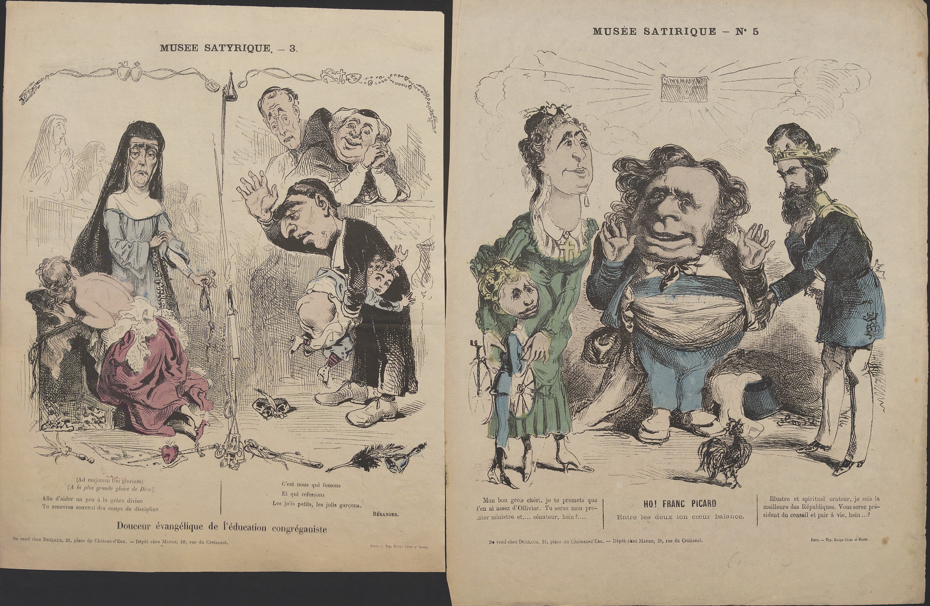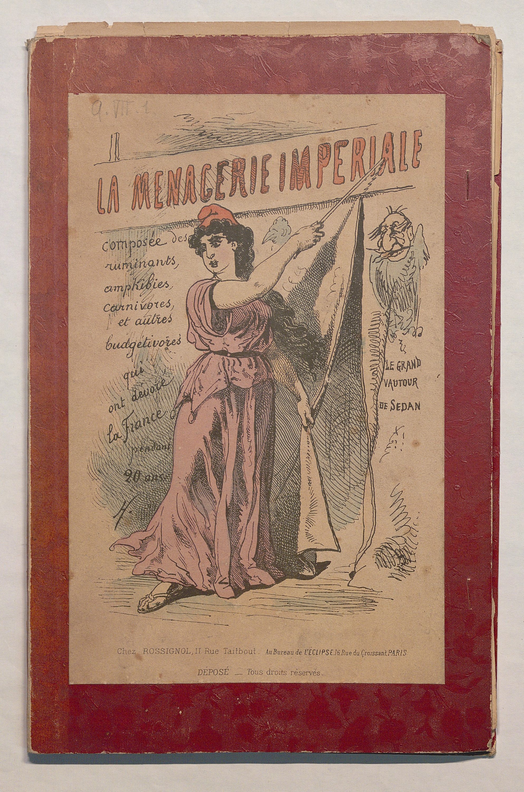 Paul Hadol (1835-1875) : Nouvelle Carte d'Europe dressée pour 1870. Célèbre carte d'Europe satirique et anthropomorphe pour l'année 1870 Lithographie sur papier vélin à rehauts de couleurs d’époque, impr. par Vallée, 16 rue du Croissant à Paris, toutes marges, 43,5 x 61,5 cm (rest. avec perte de quelques mots dans la légende) ; La complainte de Badinguet [chanson], 34 x 48 cm (petits défauts) ; Série La Ménagerie impériale, incomplet, 23 n°/31, formats et états divers.