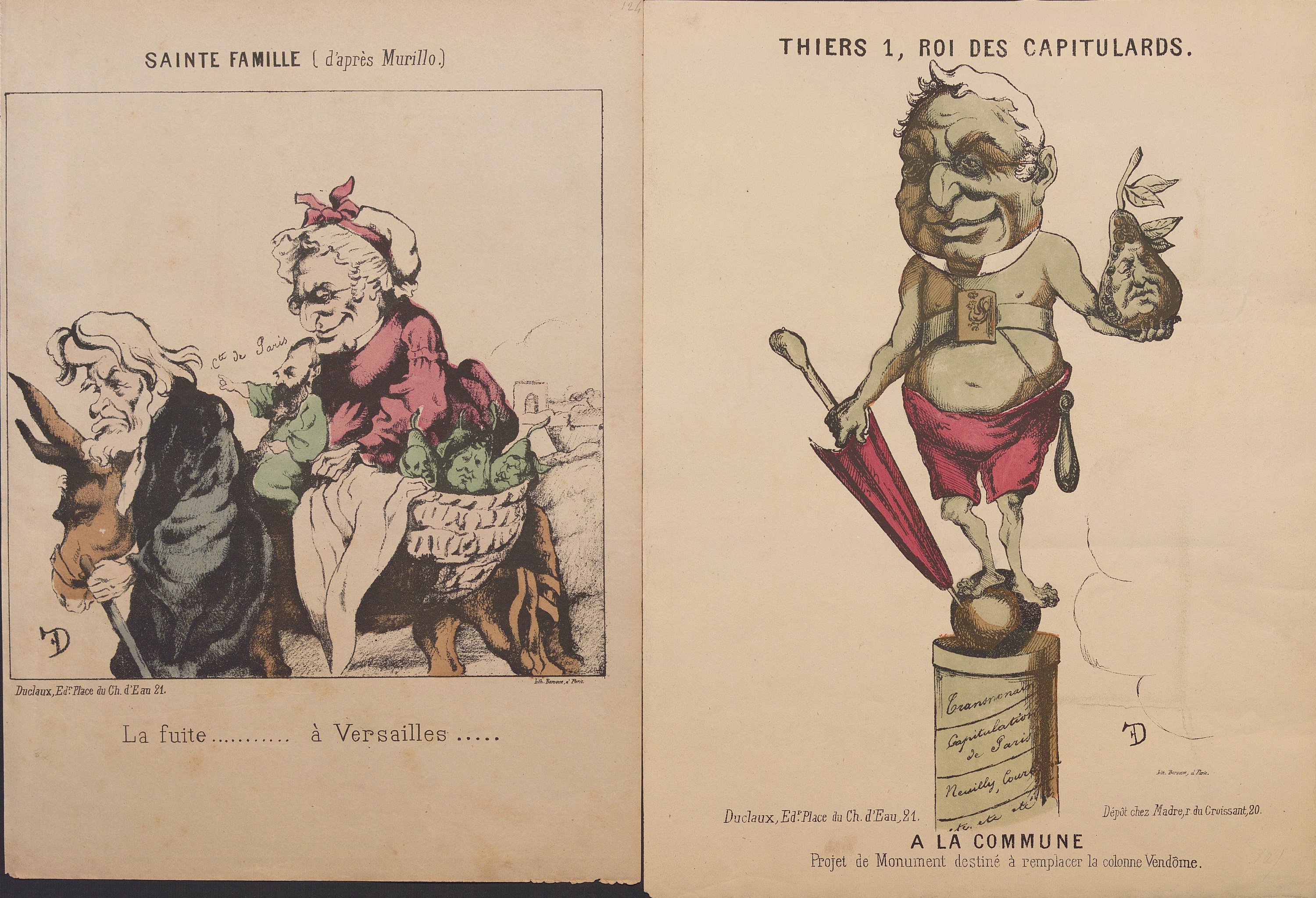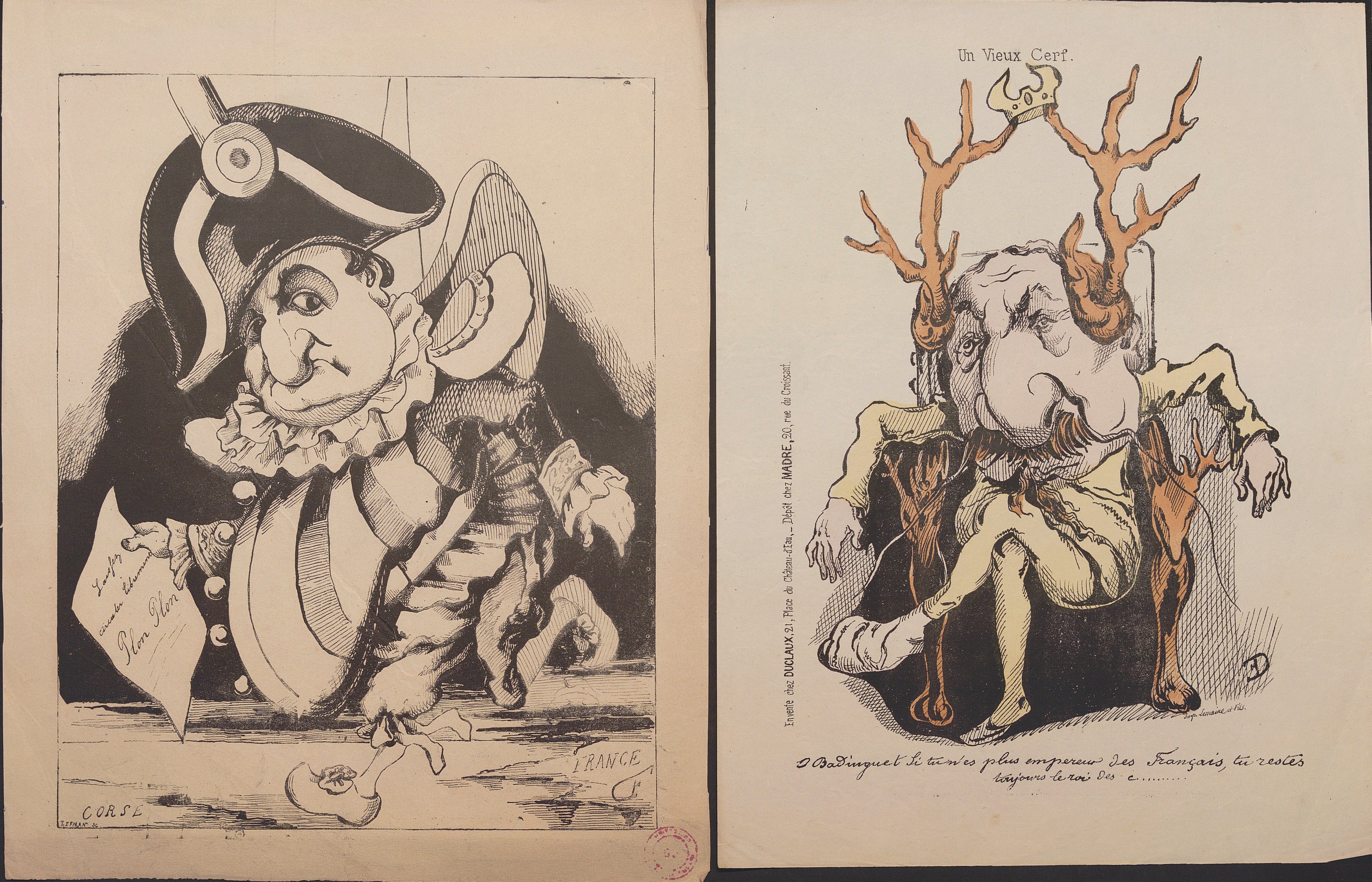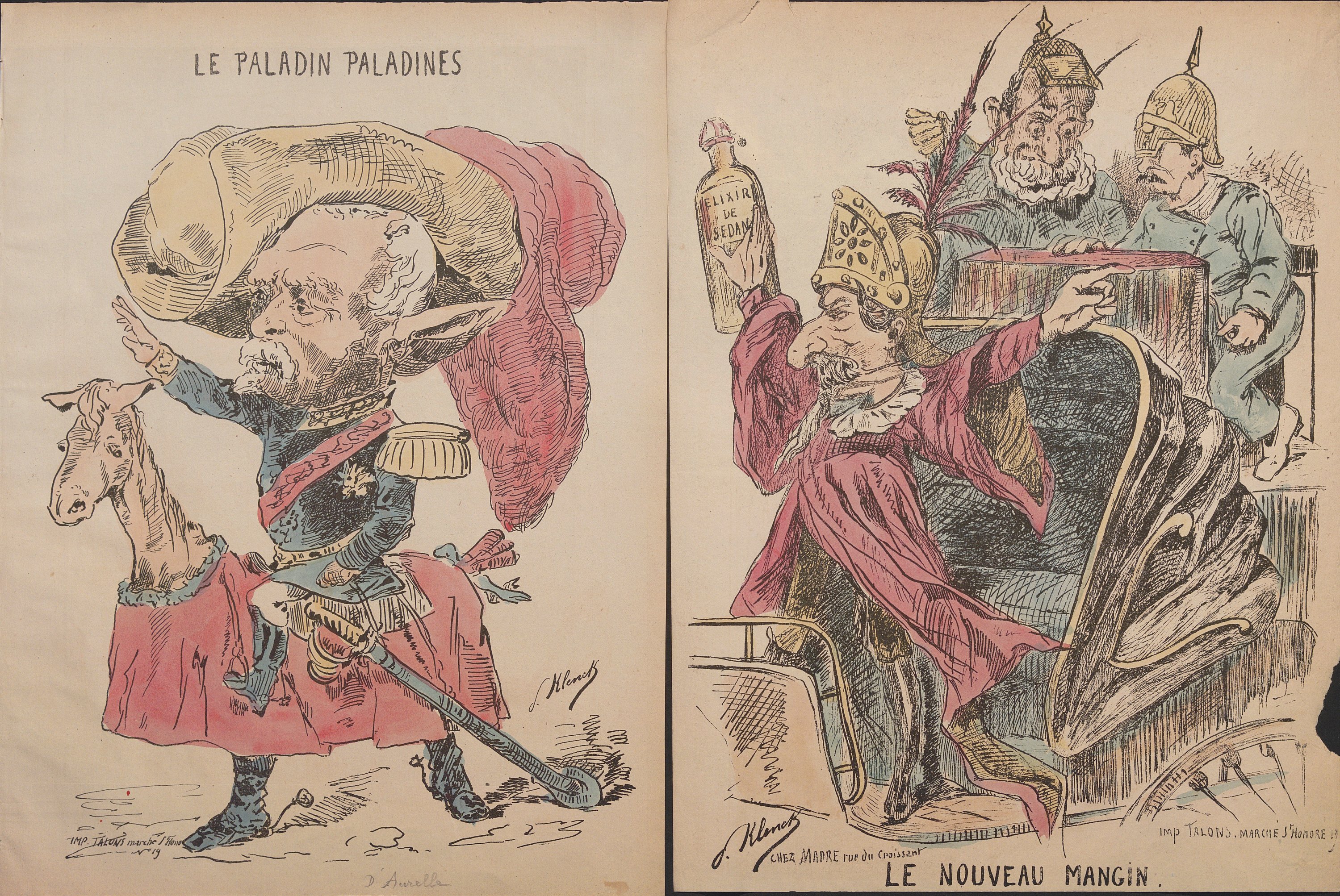 Klenck : Le plan Trochu (document historique) , Badinguet gendarme, 2 ex. (1 en N&B et 1 en couleurs), 34,5 x 26 et 32,5 x 26 cm ; Restauration pontificale, plan de Charrette (en N&B) ; La Résurrection ; Versailles ; Le père Thiers (petites déchirures) ; Le paladin paladines ; Le Nouveau Mangin (petit mque en marge) ; Une séance à la Chambre ; La famille Badingue ou les derniers beaux jours (en N&B) (petites déchirures en marge) ; Le faussaire (petite déchirure) ; Un mauvais rêve du Père Guillaume ; La St Guillaume ; La Boue ; Le Maudit, 43,5 x 30 cm (petits déf.) ; Monseigneur Darboy archevêque de Paris assassiné ; La France trahie : Vous pouvez entrer il dort ; 29e proclamation désespérée du Fou Guillaume , 44,5 x 29 cm (petits déf.) ; Garibaldi approvisionne son armée ; Les premiers exploits de Bonaparte ; Souscription républicaine ; La force lutte avec le droit ; Qui aime bien châtie bien (en N&B) ; Nos sauveurs !... (en N&B) ; Les Prussiens après l’attaque, venez donc goûter ; Les Prussiens après l’attaque, Bataille du ; Augusta monte à sa tour, Guillaume ne revient pas ; Le mat de cocagne politique 1871 ; Pauv’ Badingue, Dégommé ! (en N&B) ; Actualités n°1, Dernier degré de l’échelle impériale ; L’homme à la perche ; Nouvelles de Versailles ; Actualité, Le retour du vainqueur ; Actualités, l’armée de la Loire met les Prussiens en déroute (en N&B et en couleurs) ; Actualités, Père et fils ; Actualité, la Débâcle ; Le départ de la Commune et de ses communiants ; Actualités, c’est y pour l’enfant ; Actualités,; Les trois Larrons ; L’archi-monseigneur ; Les valets de l’Empire n°1 ; Hure III ; Un pétroleur ; Une pétroleuse ; Musée burlesque n°1, Faust et Marguerite ; Musée burlesque n°2, Les absents ont tort ; Musée Burlesque n°3, Condamné à ; Panorama anti-bonapartiste n°1 ; Panorama comique, n°1 à 4, série complète ; série La Commune, env. 27,5 x 18 cm, incomplet, page de titre et 43 portraits charges (sur 74) + 3 doublons ; Série Actualités en vente chez Grognet, n°13, 14, 19, 25, 44, 45, 48, 49 ; L’éducation d’un prince par Mme de P ; Une soirée aux Tuileries, on attend ces messieurs.