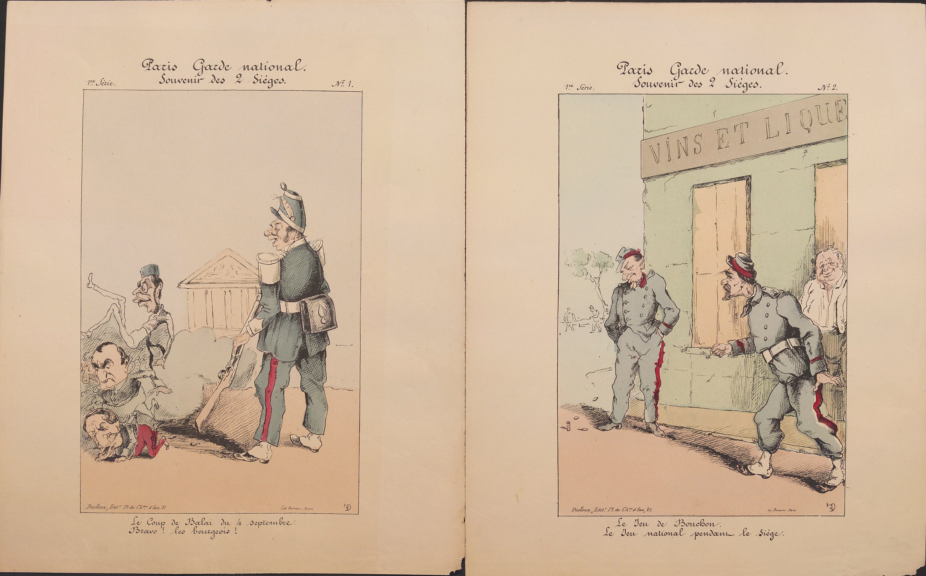 Dont Frondas : Paris garde nationale. Souvenir des 2 sièges. Série complète des 10 lithogr. en couleurs, 32 x 25,5 cm ; Napoléon Le Petit, Au bagne ! Misérable, 3 ex. aux coloris différents, formats divers ; Les gaités de Badinguet , 32 x 23 cm ; Les voyageurs pour Cassel en voiture , 2 ex., 35 x 27,5 cm et 32 x 23 cm ; Souvenirs & regrets ; 2 ex., 35,5 x 27,5 cm et 31 x 24 cm ; Grandeur & décadence, un navire en détresse, 2 ex., 34,5 x 26 cm ; Le nouveau Job, du chlore ! du chlore !, 36 x 27,5 cm ; Rentrée triomphale de Badinguet, 2 ex, 27 x 34,5 et 26 x 33,5 cm ; En 1848, pas le sou , 3 ex., 35 x 27,5 cm ; En 1870, les avons-nous assez tondus, les malheureux !, 2 ex., 36,5 x 27 cm ; Dernier espoir , 2 ex., 26 x 34 et 26 x 35,5 cm ; La Cour de Willemshoe , 2 ex., 36 x 27 et 32 x 23 cm ; Un bain de sang !..., 23 x 32 cm ; Le club des patineurs , 2 ex., 36 x 25 et 32 x 25,5 cm (petit mque) ; Dégommé !..., 2 ex., 32,5 x 25 cm ; La loge de Clarisse , 31,5 x 24 cm ; Revue rétrospective l’Arcadie , 2 ex., 36,5 x 27 et 34 x 26,5 cm ; En vedette , 2 ex., 30 x 22,5 cm ; Le parlement croupion , 23,5 x 30,5 cm (rest.) ; etc.