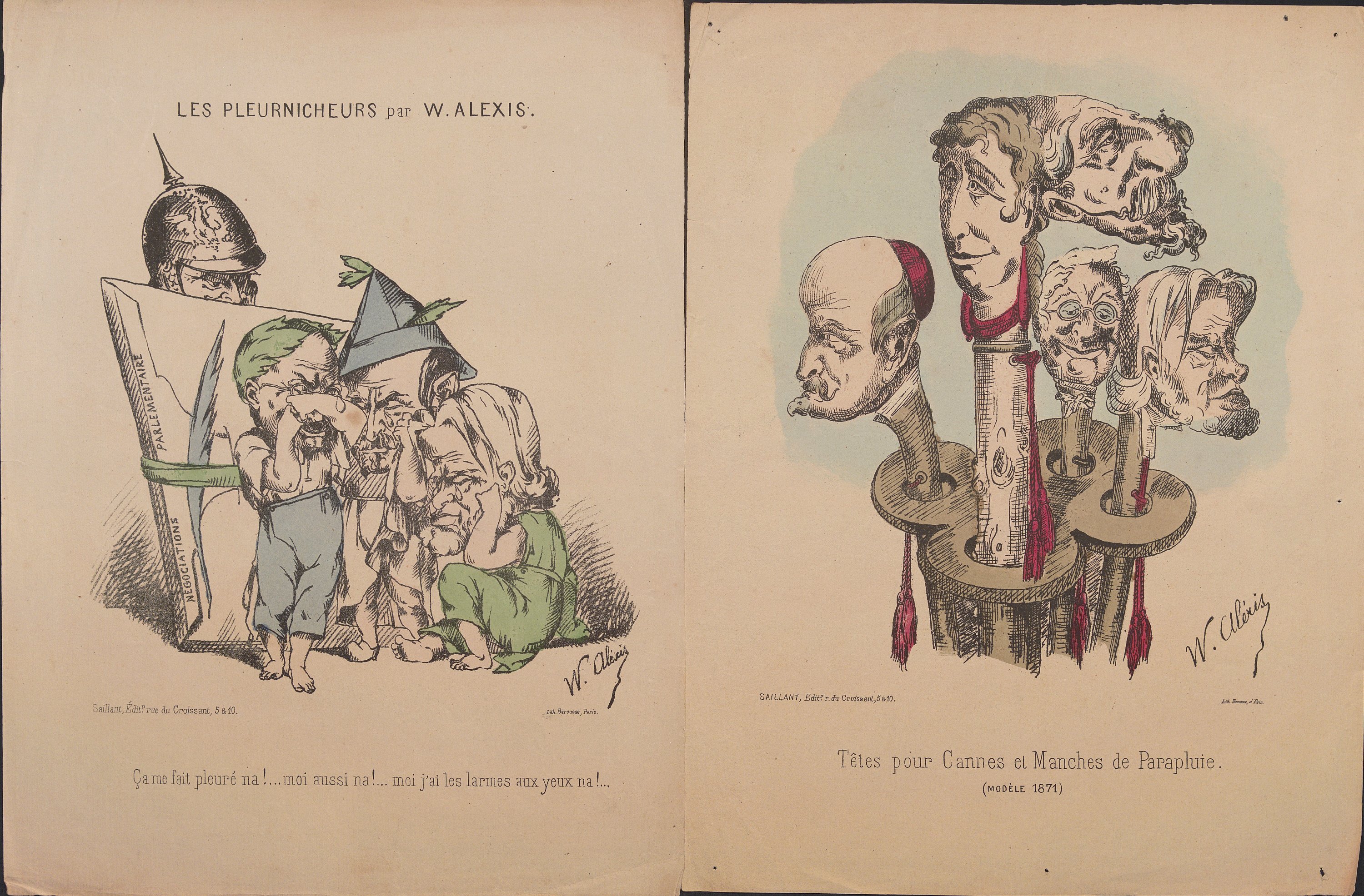 Dont W. Alexis : Loin du Monde, révérende Eugénie de Montijo, 35,5 x 27,5 cm ; Nos despotes En famille !, 33 x 25 cm ; Un Prétendan , 33 x 25 cm (rousseurs) ; Le retraité de Wilhemshohé, 32 x 25 cm (petite déchirure) ; Actualités, A pas peur Guillaume, 36 x 27 cm ;