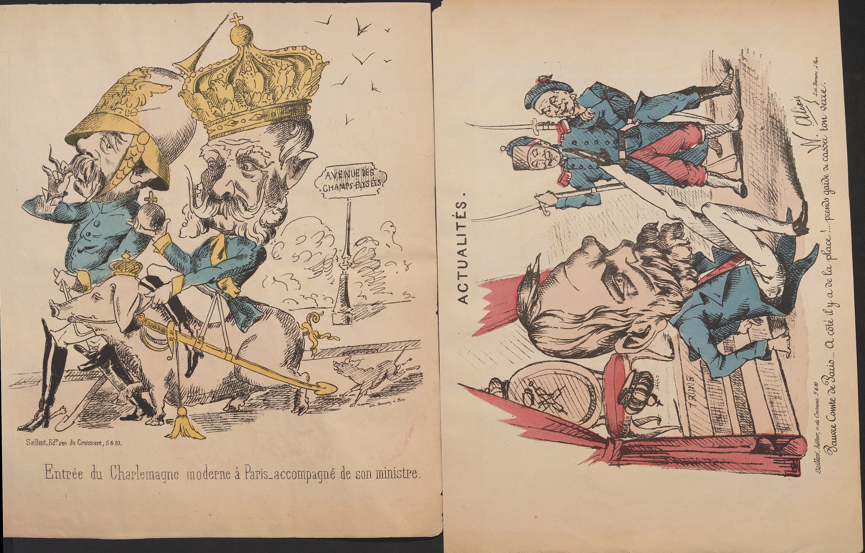 Actualités, Jules Favre - Trochu et son plan, 35,5 x 27 cm ; L’embarras d’une proclamation, 31,5 x 23,5 cm ; Actualités, Nos prêtres ne sont pas ce qu’un vain peuple pense , 35,5 x 28 cm, contrecollé sur feuillet épais ; Actualités, Pauvre comte de Paris , 26 x 35 cm ; La République menacée , 36 x 27 cm ; Le chef de cuisine bordelaise , 34 x 26 cm ; etc.