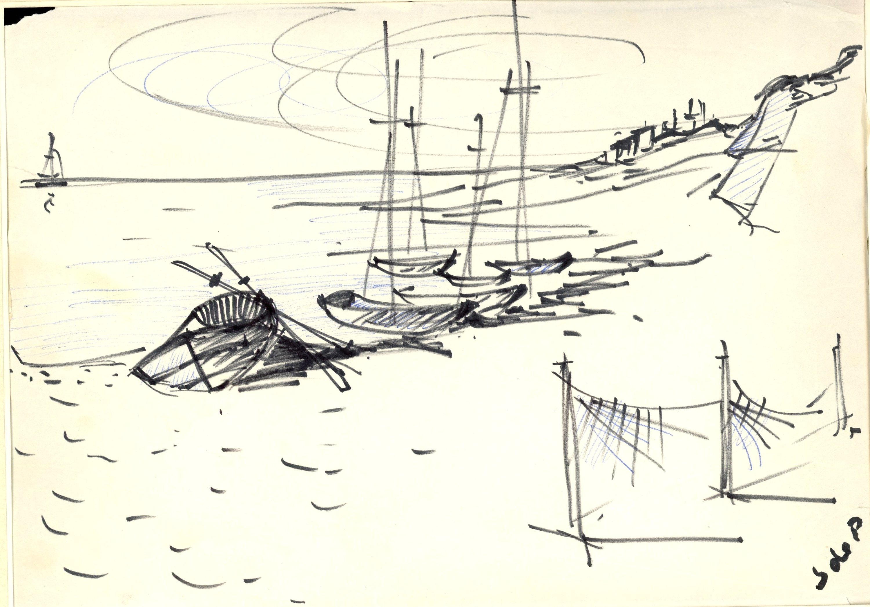 Marine, crayon, signée « S. de P. », 19 x 26 cm ;