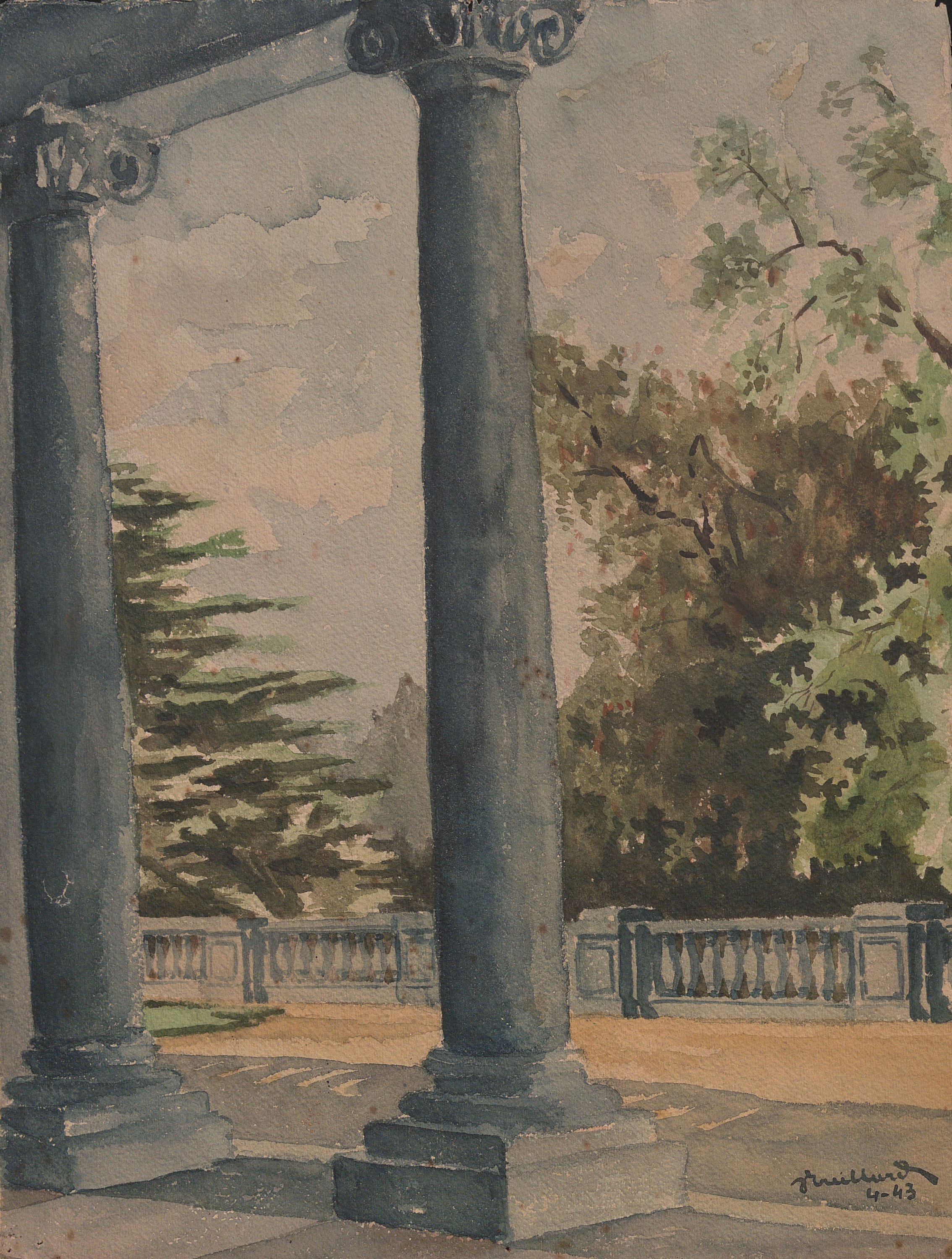 Colonnes et jardin, aquarelle, signée et datée « 4-43 », 31 x 24 cm.