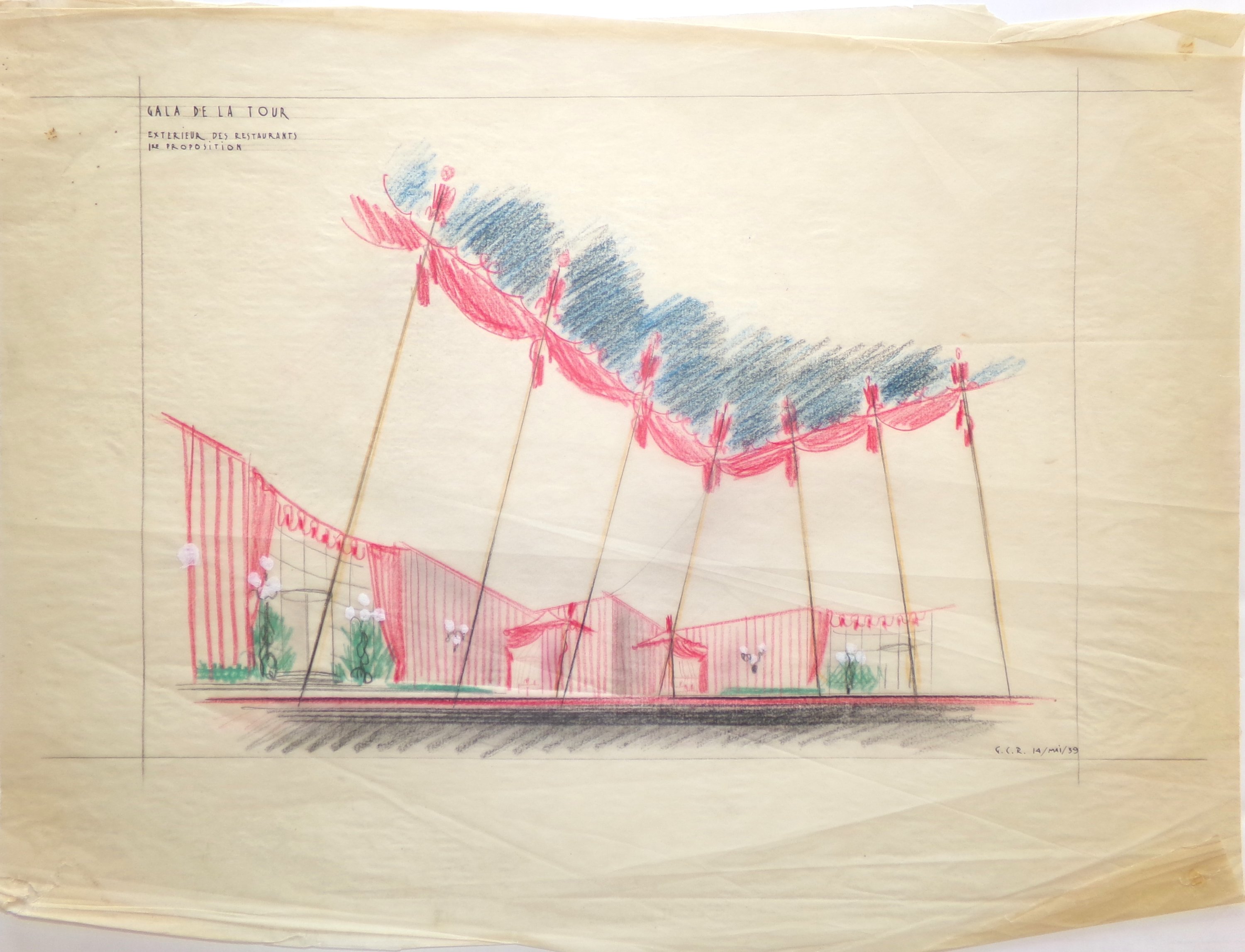Dessin sur calque de décoration intérieure pour le gala de la Tour Eiffel, extérieur des restaurants, signé et daté « G.C.R. 14 mai 1939 », 35 x 46 cm ;