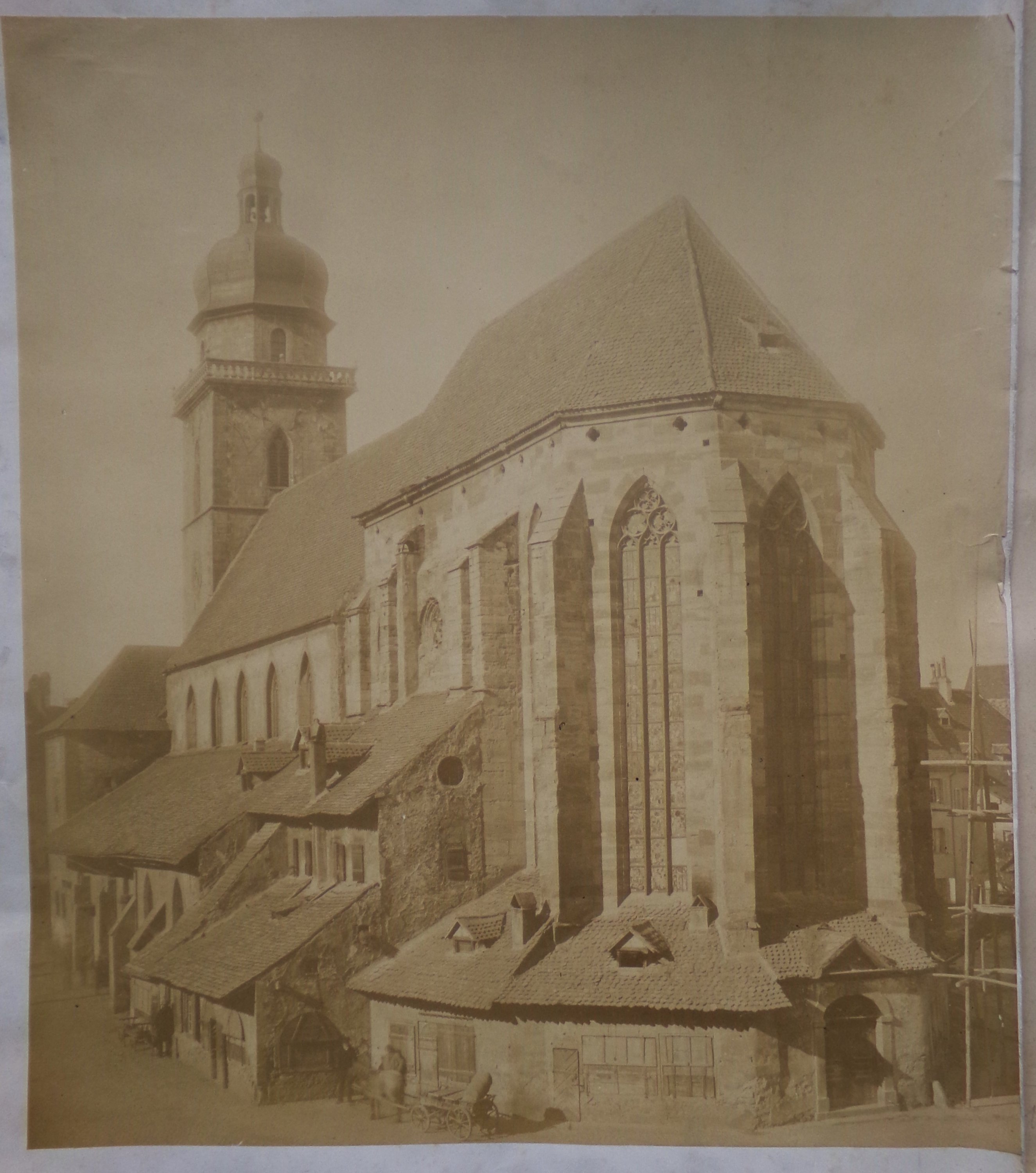 L’ancien temple protestant Saint-Etienne de Mulhouse, contrecollé sur carton fort, 48 x 42 cm ; temple détruit en 1858, cliché photographique d’Adolphe Braun, photographe à Dornach, pris vers 1857 ;