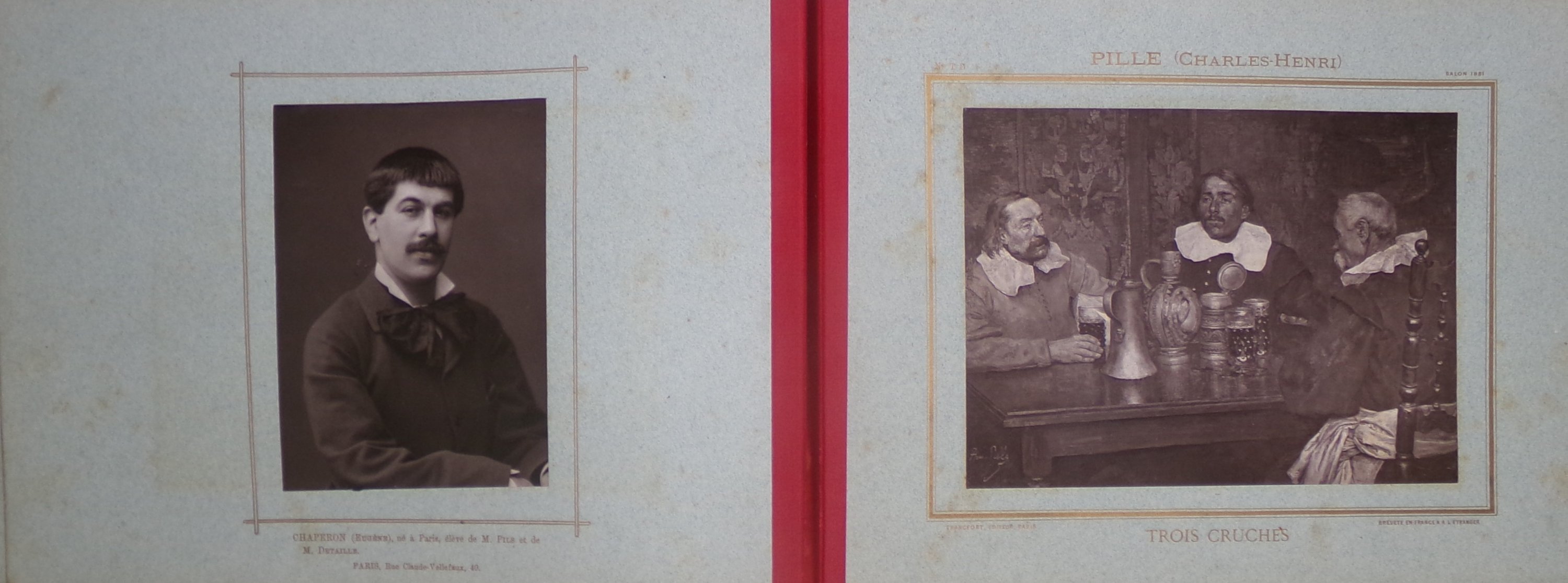 Chaque album contient une page de titre lithographiée et une vingtaine de feuillets de carton fort contrecollés sur chaque face d'une photo en noir d'un tableau et d'un portrait photographique du peintre en regard, légendes imprimées en dessous, l'ensemble monté sur onglets. Table en fin de volume.